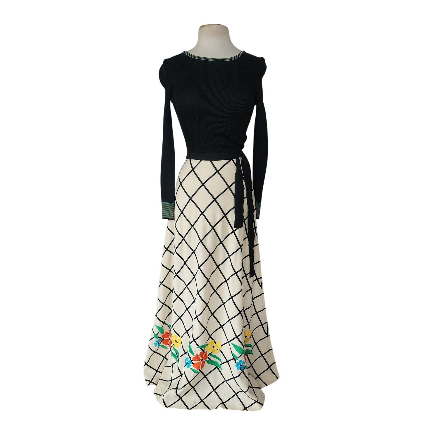 Vintage 70s Boho Maxi Dress Black Knit Top Cream Windowpane Skirt Floral Crissa Italy