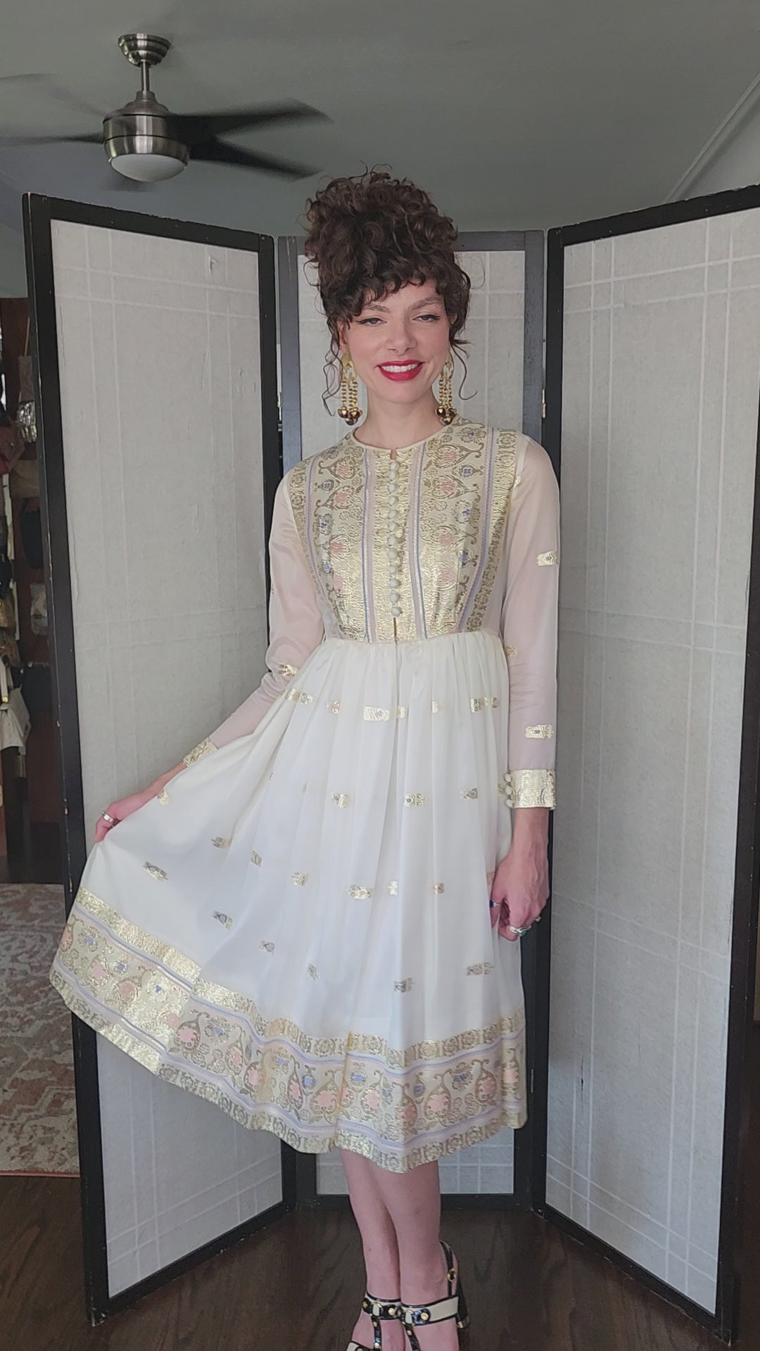 Vintage 70s Boho Party Dress Gold Lurex White Organza Chuck Howard