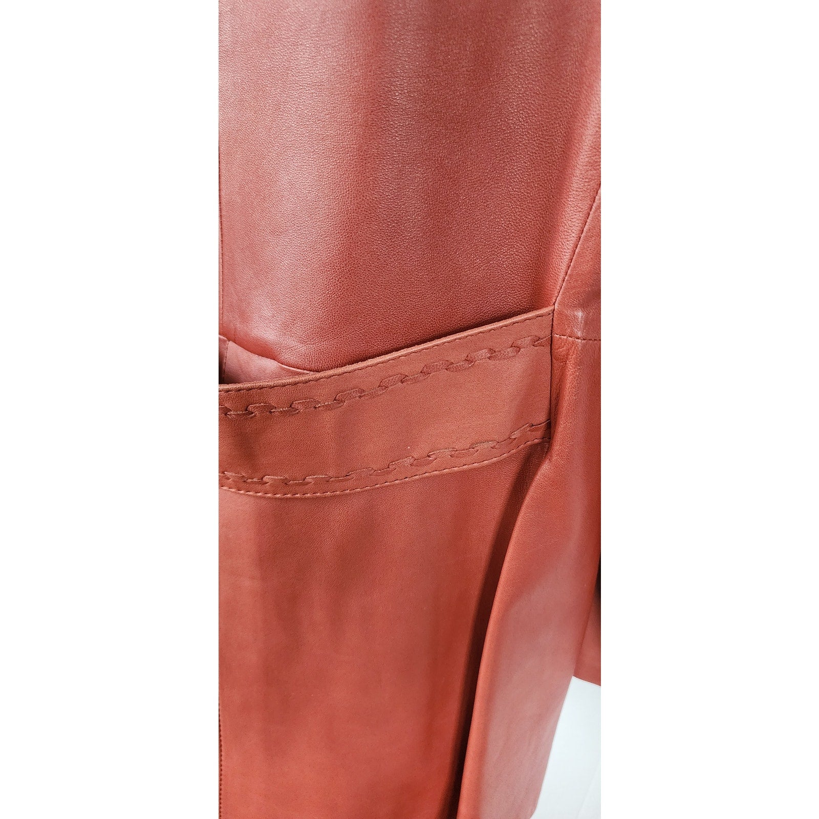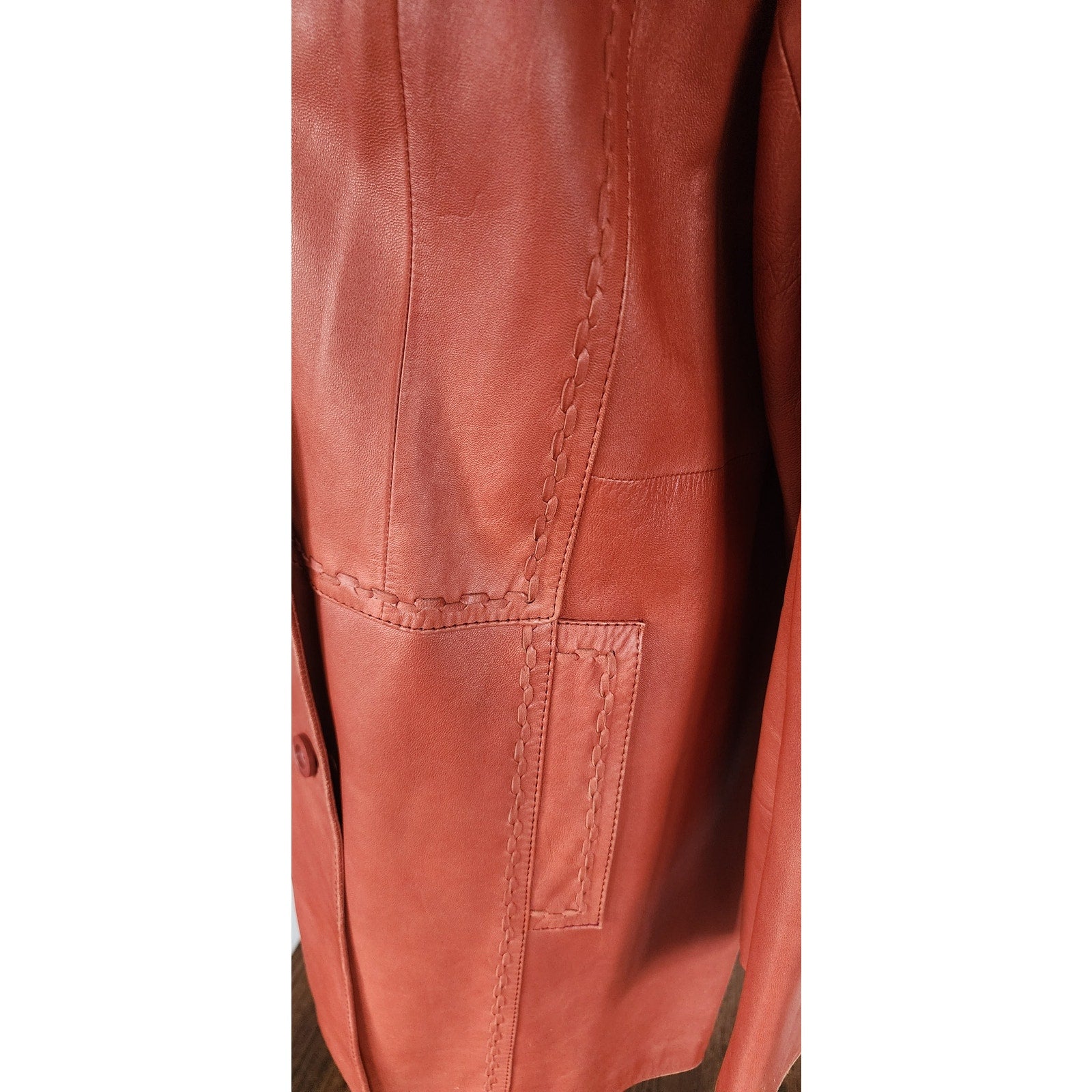 Classic medium length 70s boho coat with a fold down collar, double breasted closure and slit pockets. Decorative belt sash at rear. Note the cool, braided, leather trim around the pockets, top lapels of the collar, the front waist, back belt, and down the lengths of the sides. Fully lined. No tags.