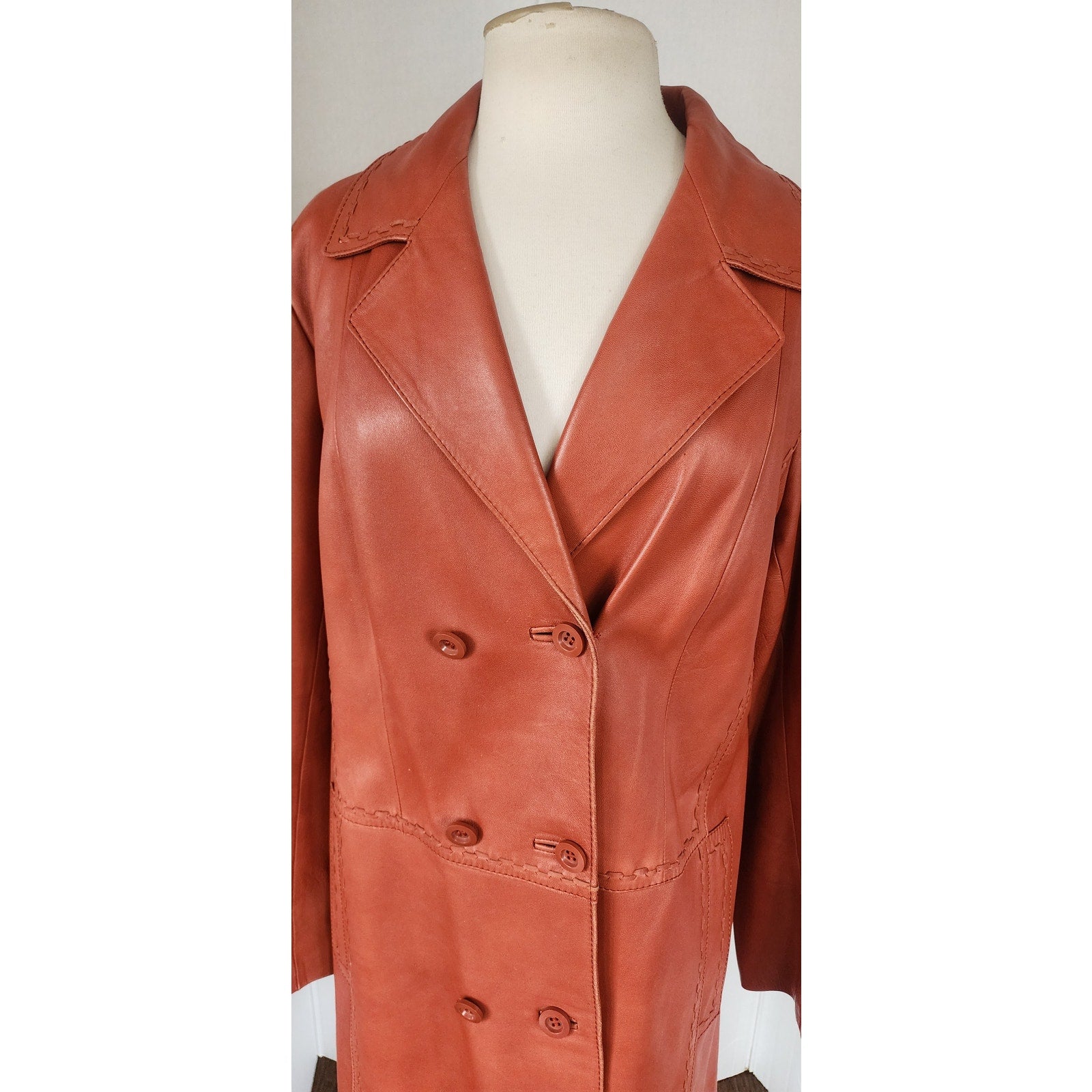 Vintage 70s Brown Leather Coat Hip Length Double Breasted / L