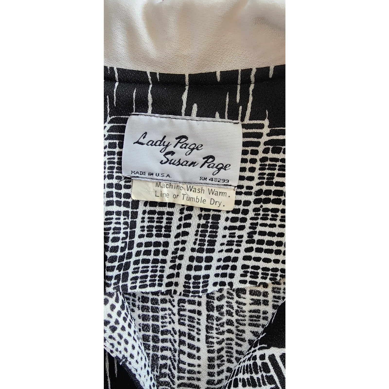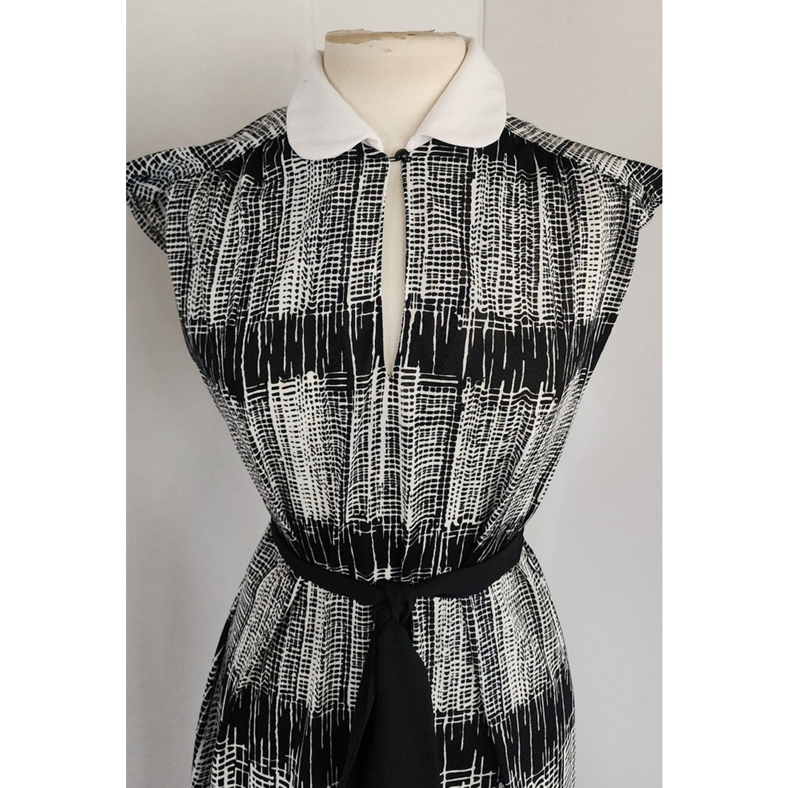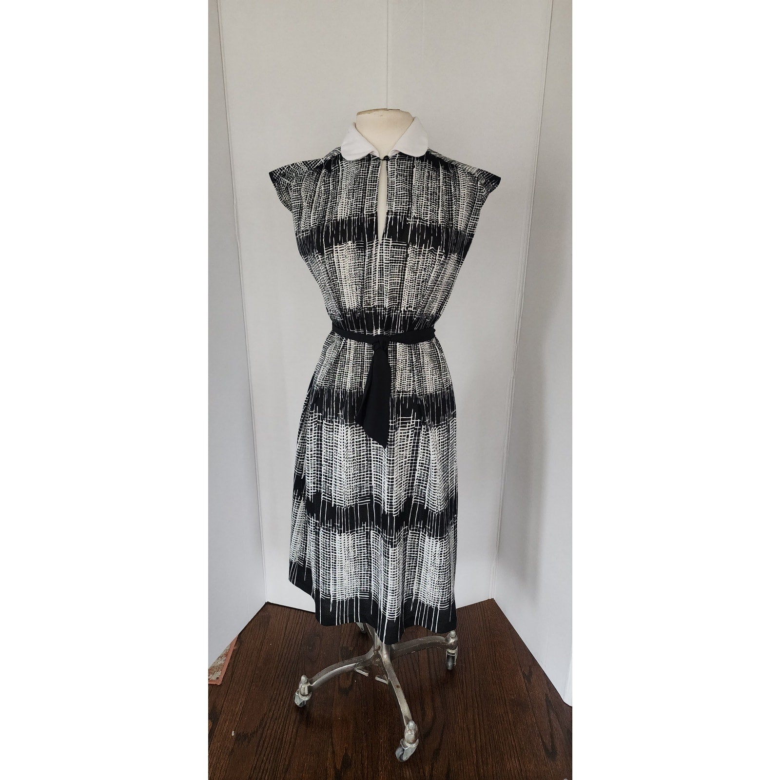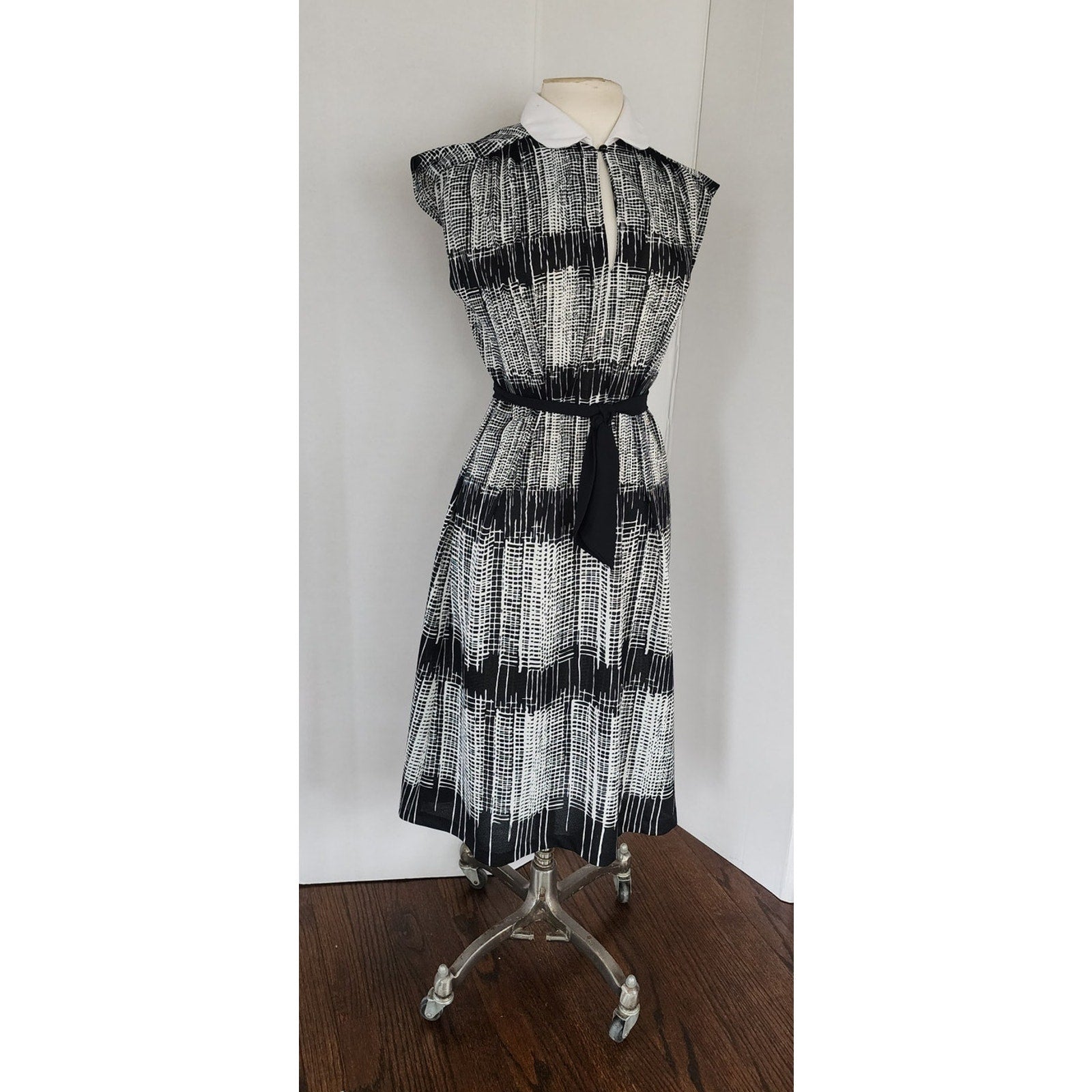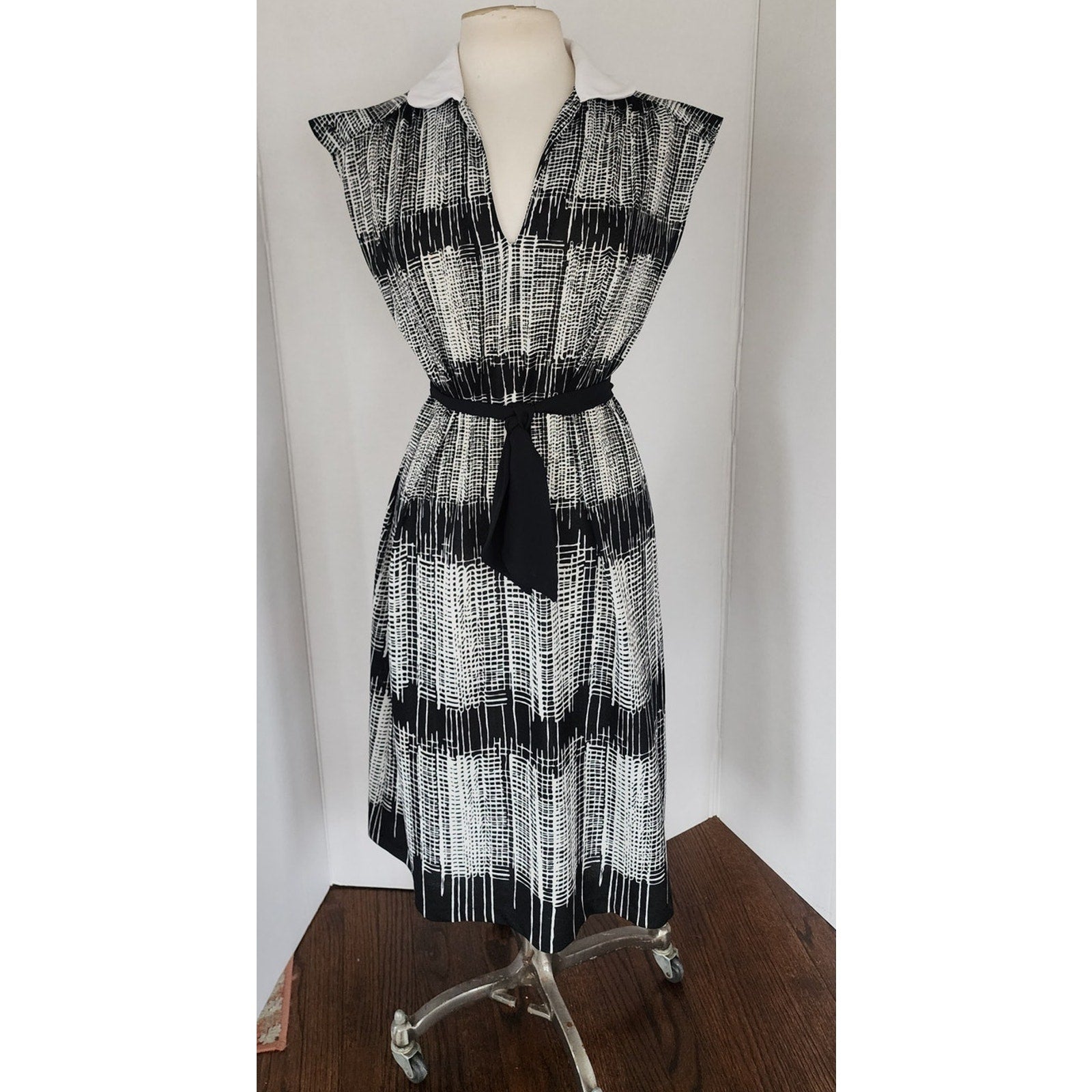 Lightweight with capped sleeves and a little, white peter pan collar, it pulls on overhead and ends at mid calf. Black, sash tie belt accentuates the waist. Note that you can leave the throat unbuttoned for a casual look, or buttoned for a more formal one! Unlined.