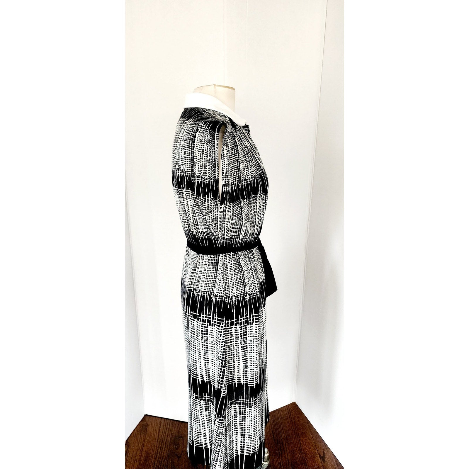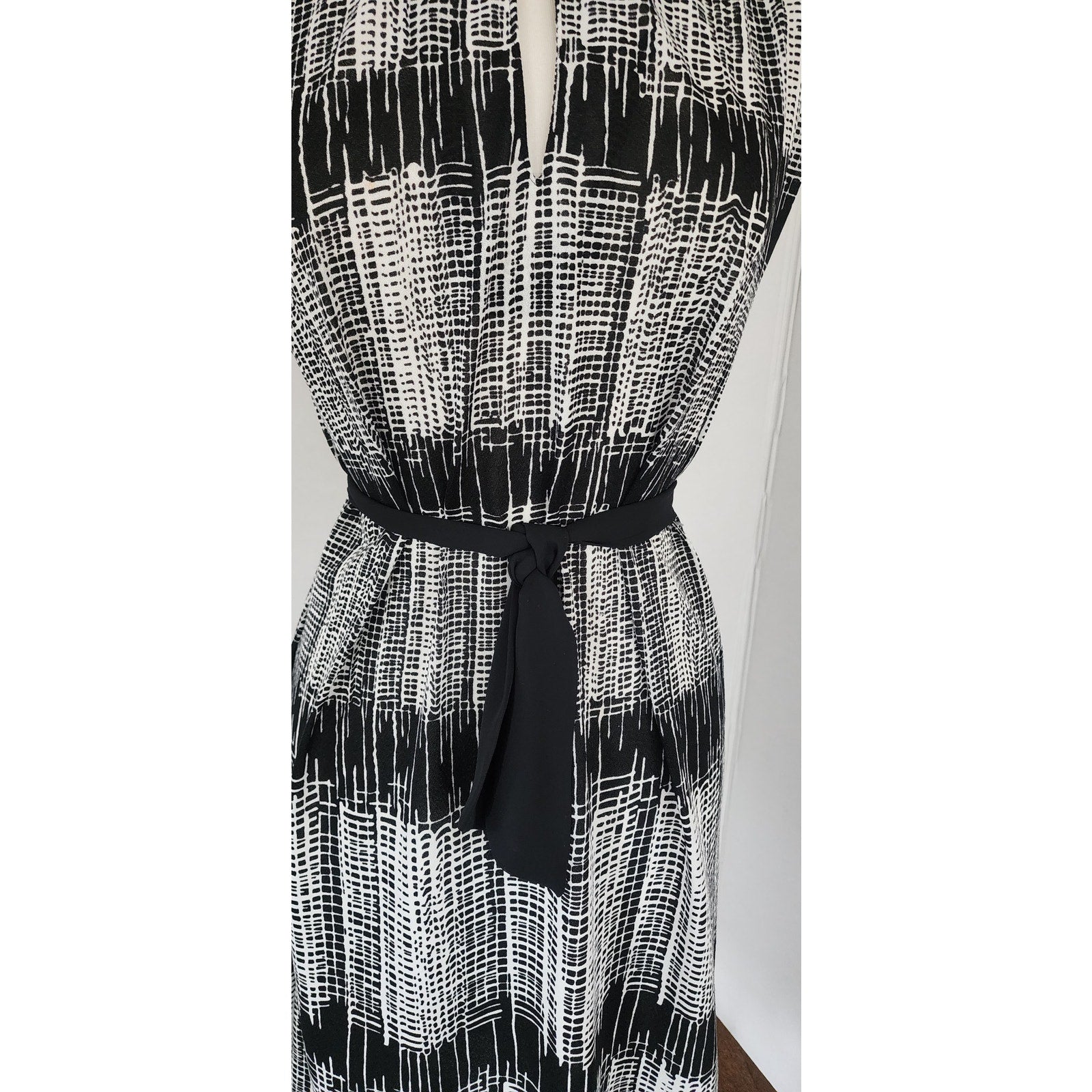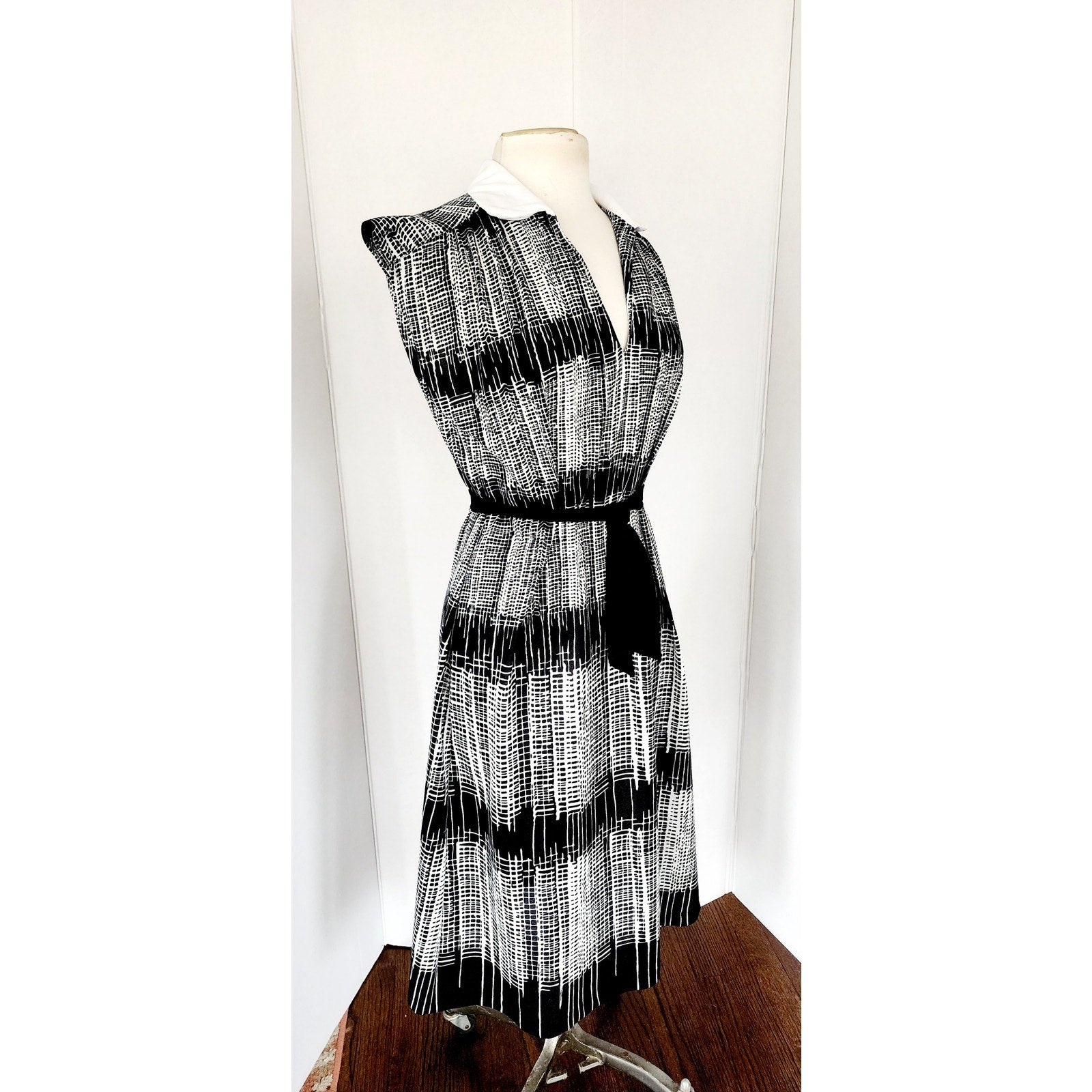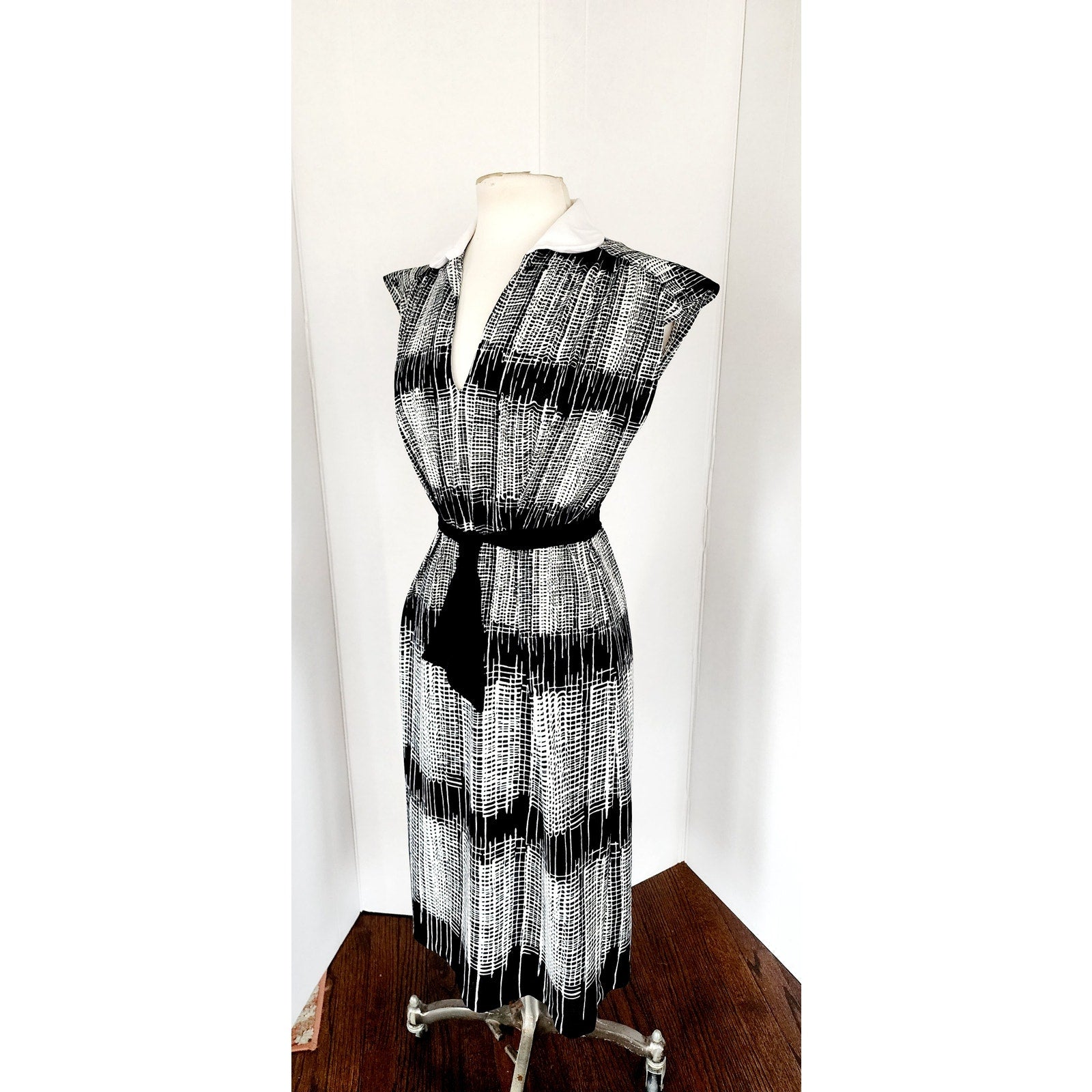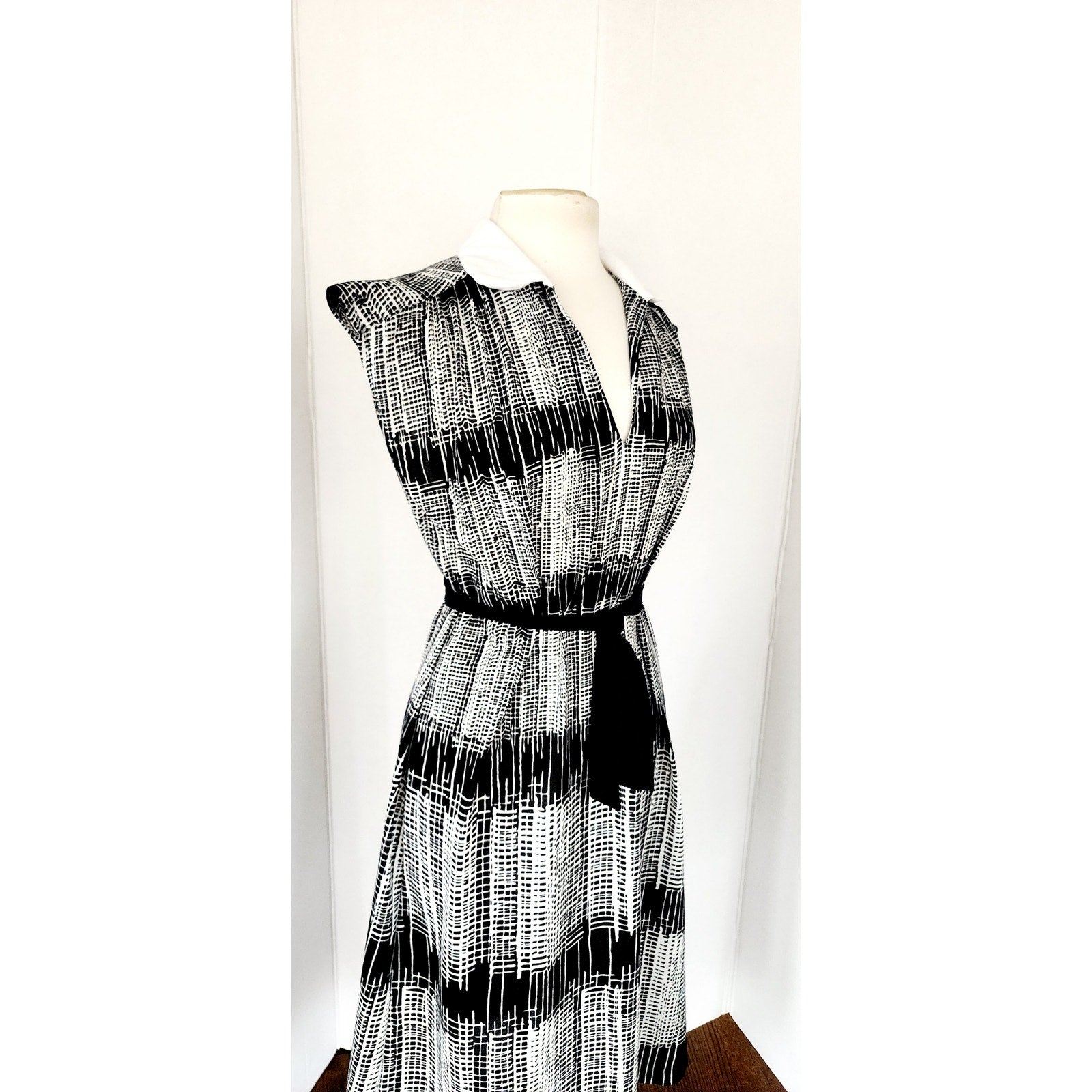 Lightweight with capped sleeves and a little, white peter pan collar, it pulls on overhead and ends at mid calf. Black, sash tie belt accentuates the waist. Note that you can leave the throat unbuttoned for a casual look, or buttoned for a more formal one! Unlined.