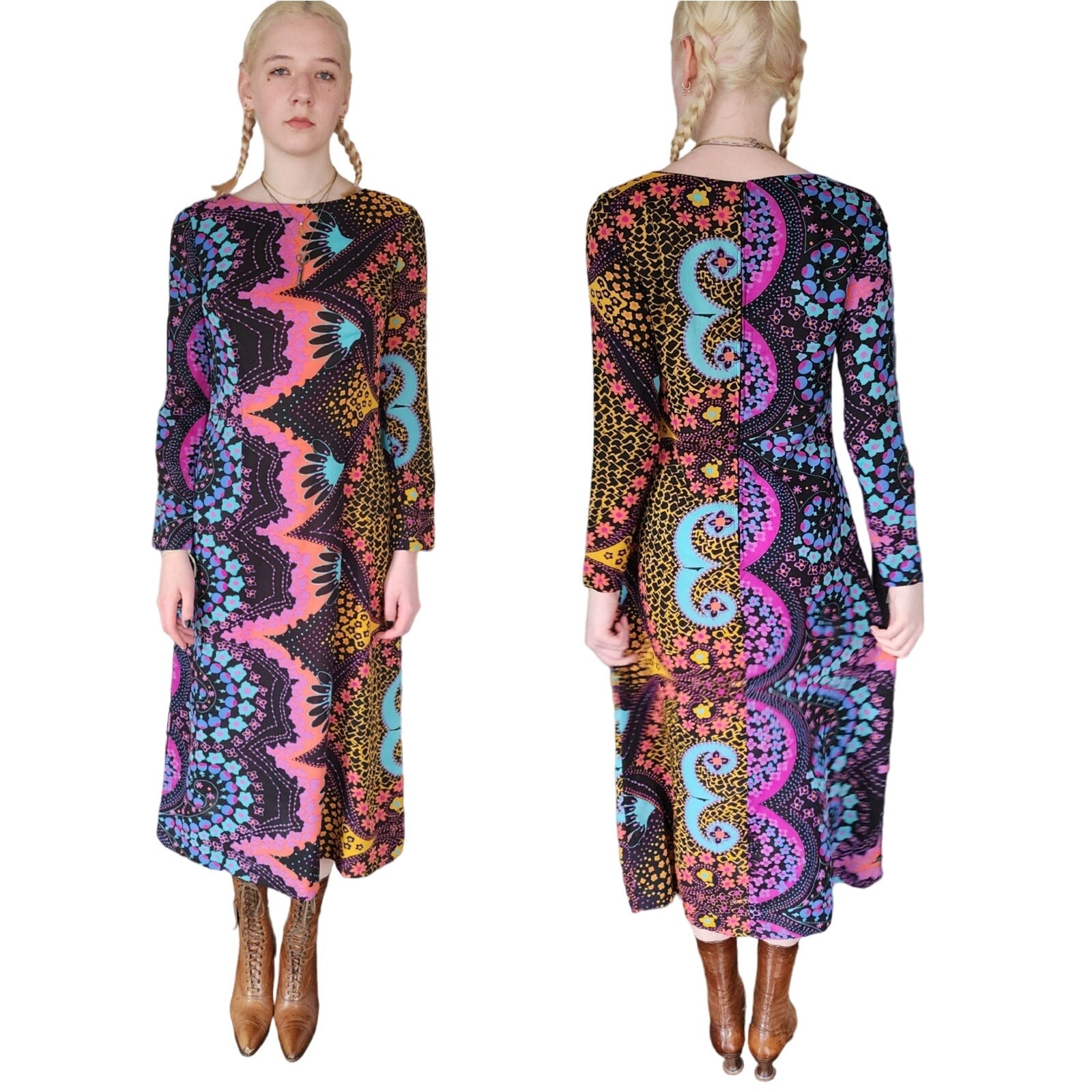 Slinky dress that is collarless, with fitted long sleeves and a fitted silhouette hugging the curves down to the ankles. Skirt is cut on a slight A lie and there are princess seams down the torso, as well as darts at the chest, for a flattering fit. Closes with a zipper down the center back. Unnlined. Lightweight and comfy!