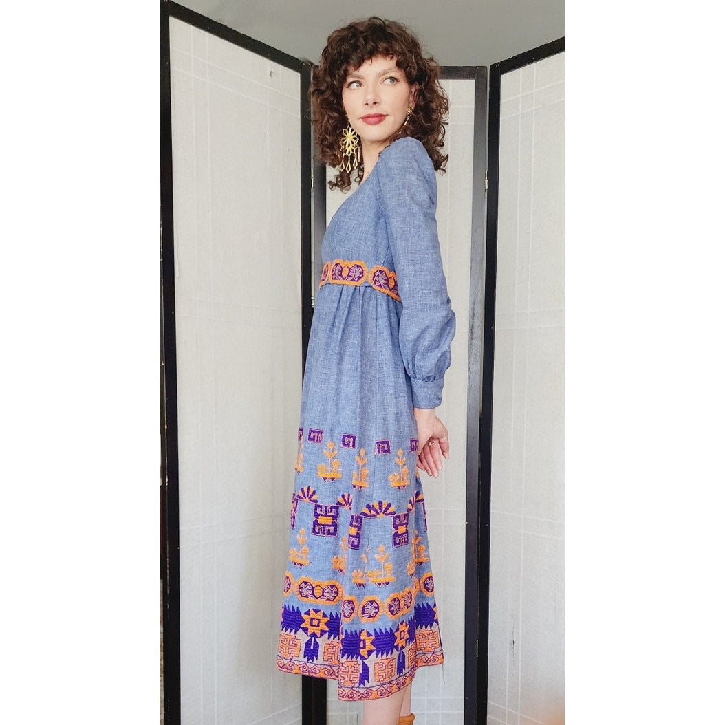 Vintage 70s Embroidered Boho Dress Peasant Style w/Belt Sash Joan Leslie Kasper