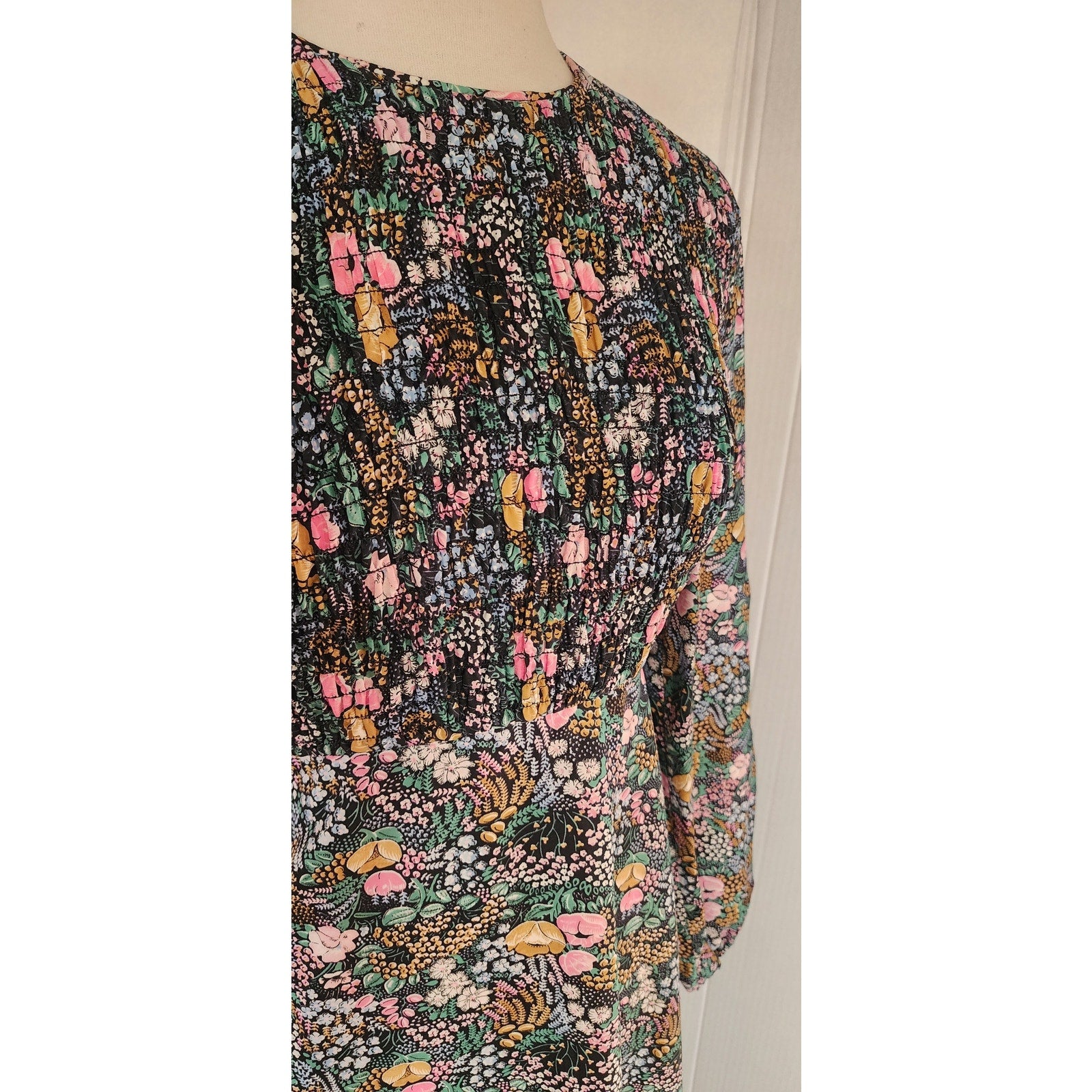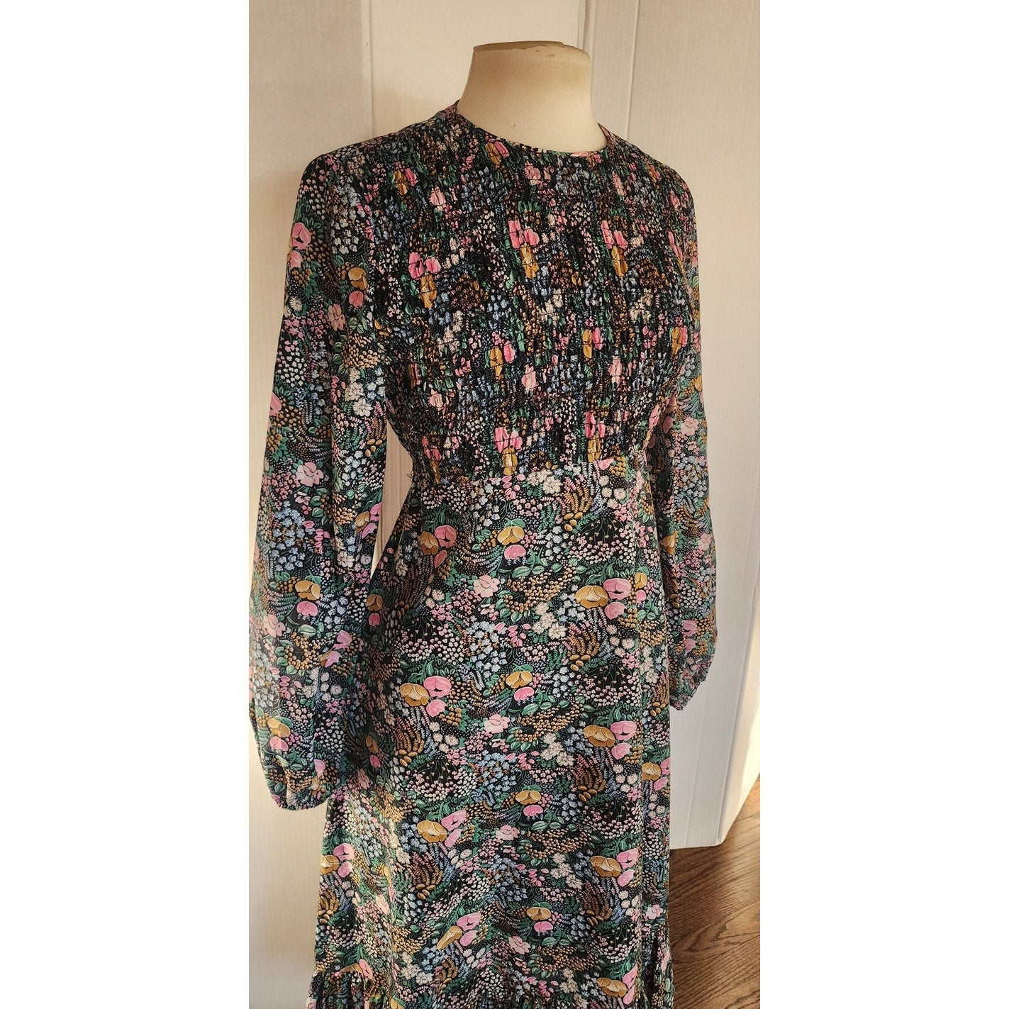 Dark floral long-sleeve, below the knee dress, featuring a round neckline, blouson sleeves with elastic cuffs, a smocked bodice, and a tiered ruffled hem. It has a multi-colored small floral pattern throughout i tones of blue, green, pink and white. Closes with a zipper at the back. Unlined. Lightweight.