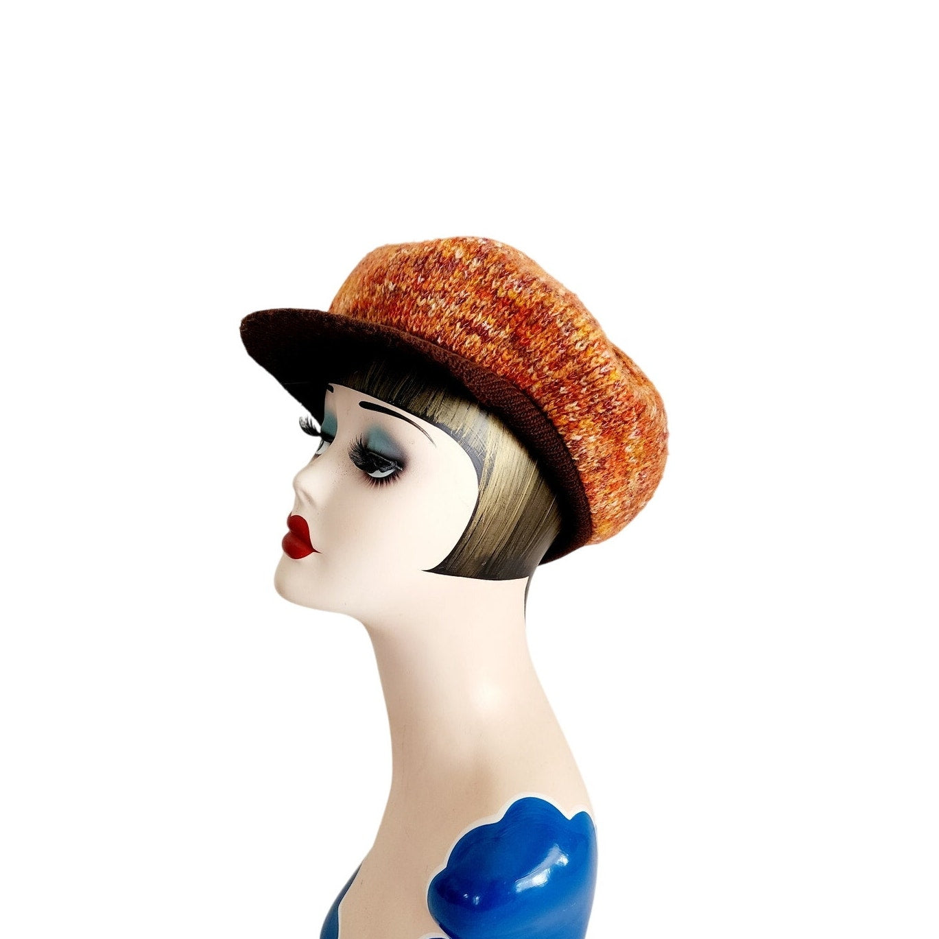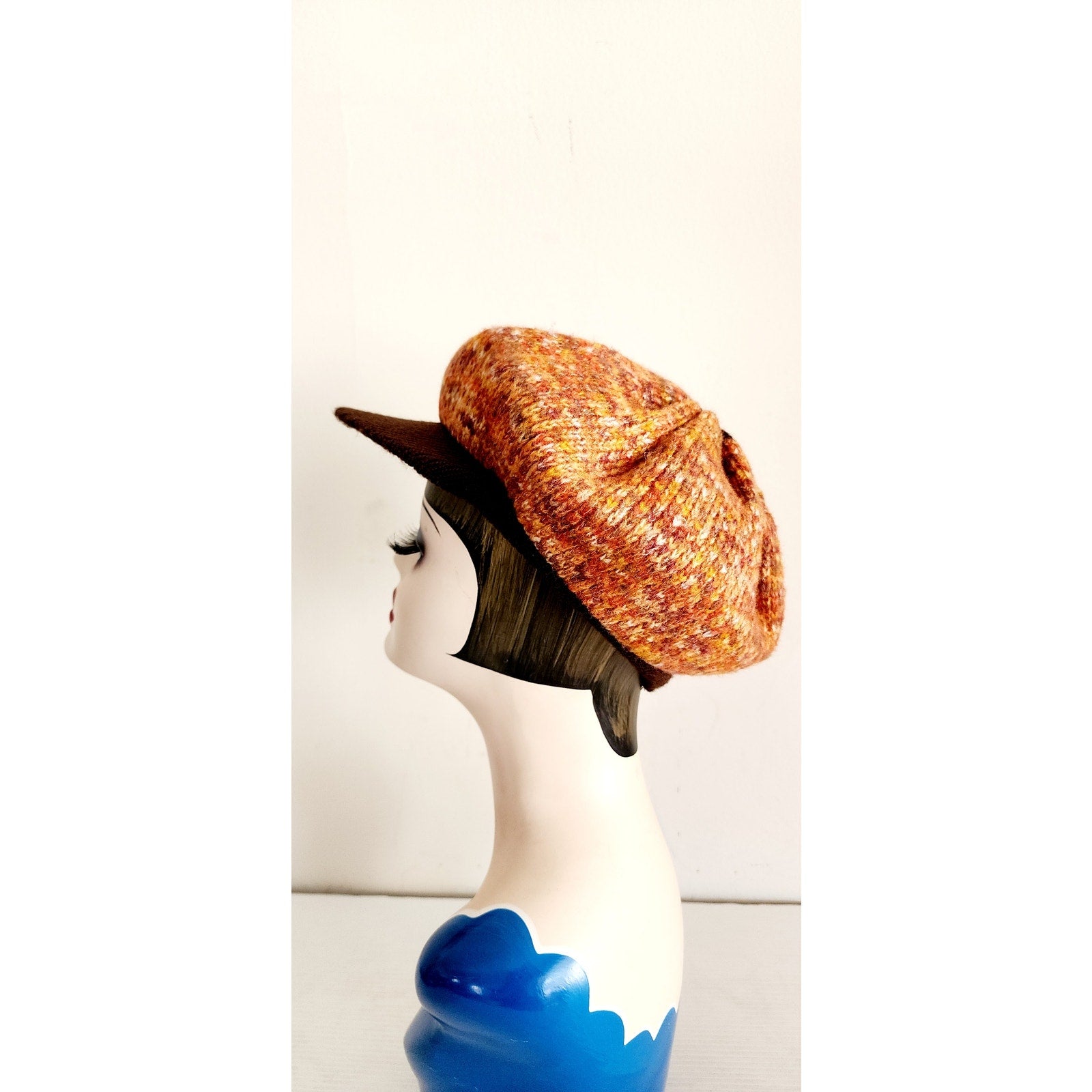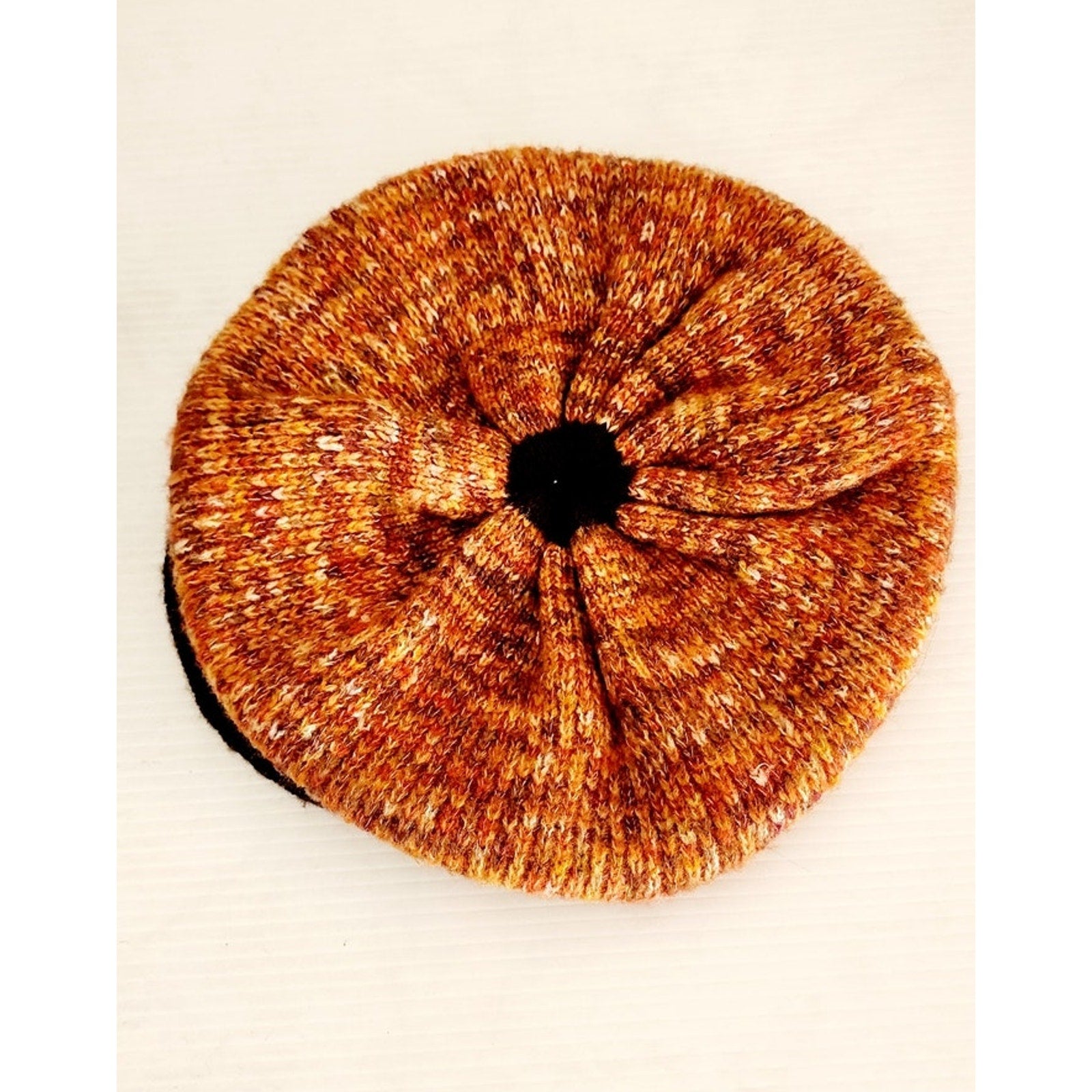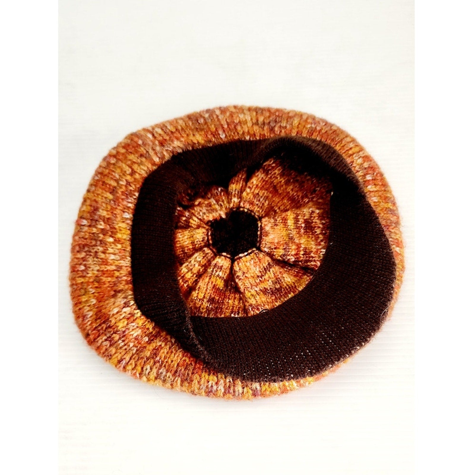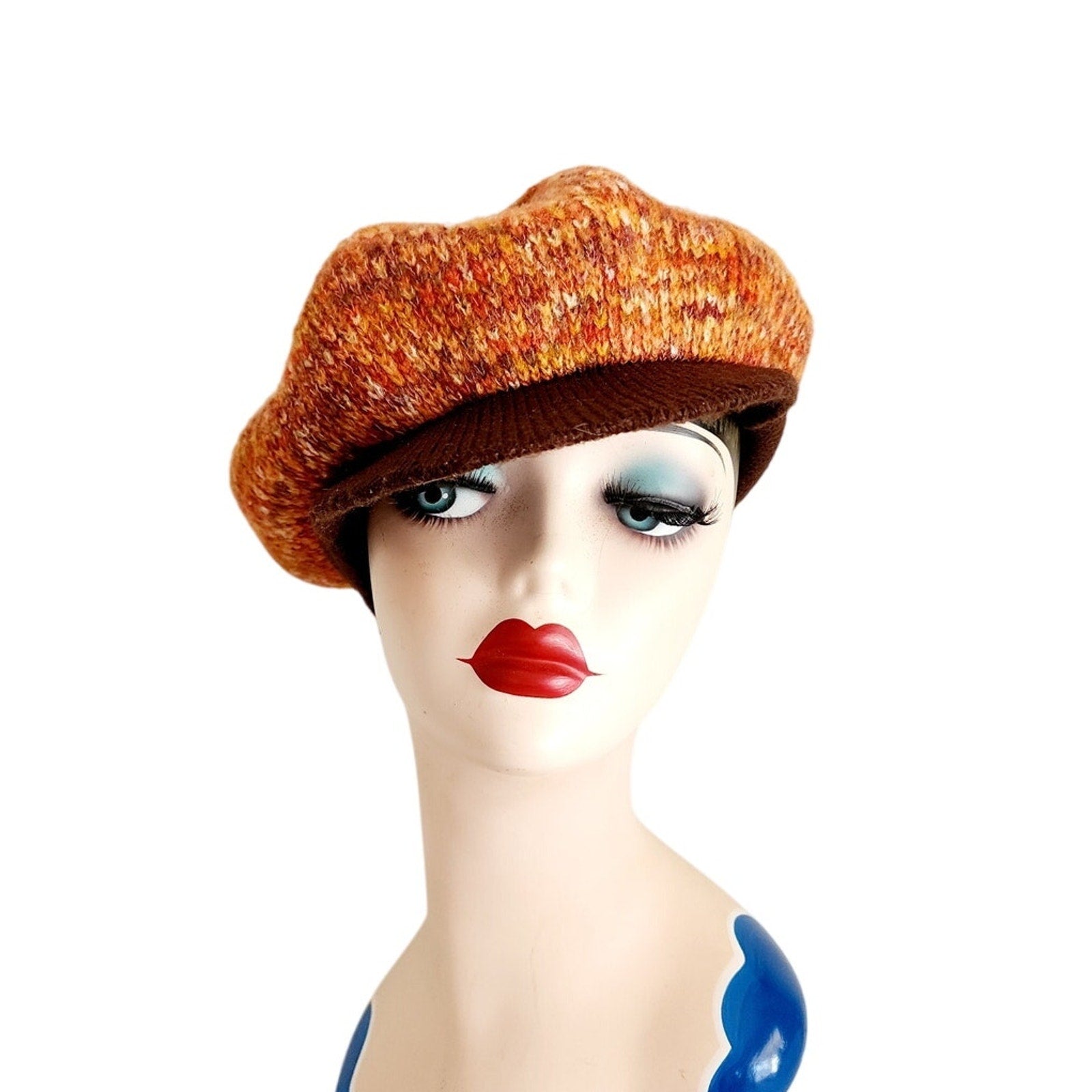 Soft and comfy slouchy tam hat in a mottled orange knit pattern with a brown visor in knitted yarn. Unlined. No labels.