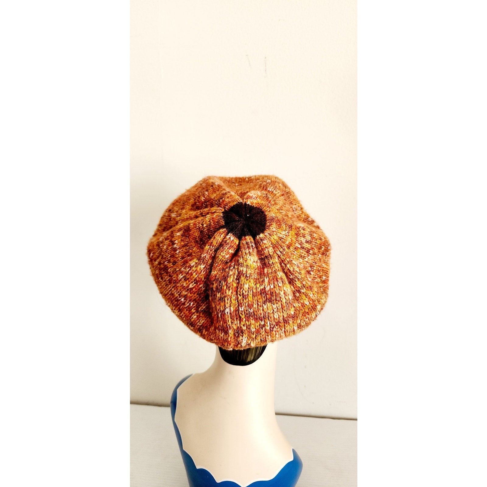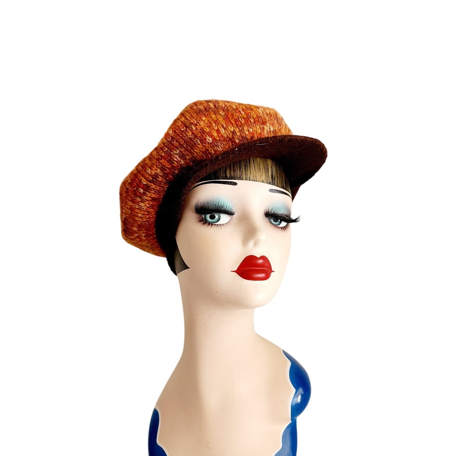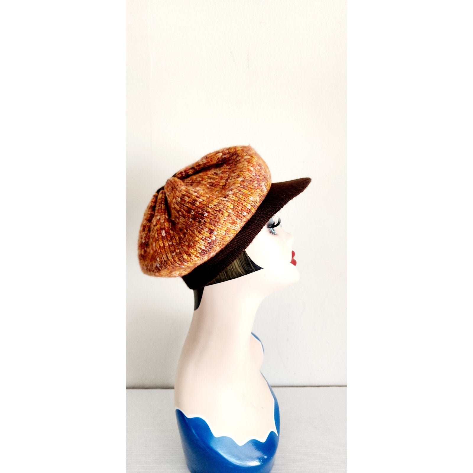 Vintage 70s Knit Tam Hat Boho Newboy Cap Orange Brown