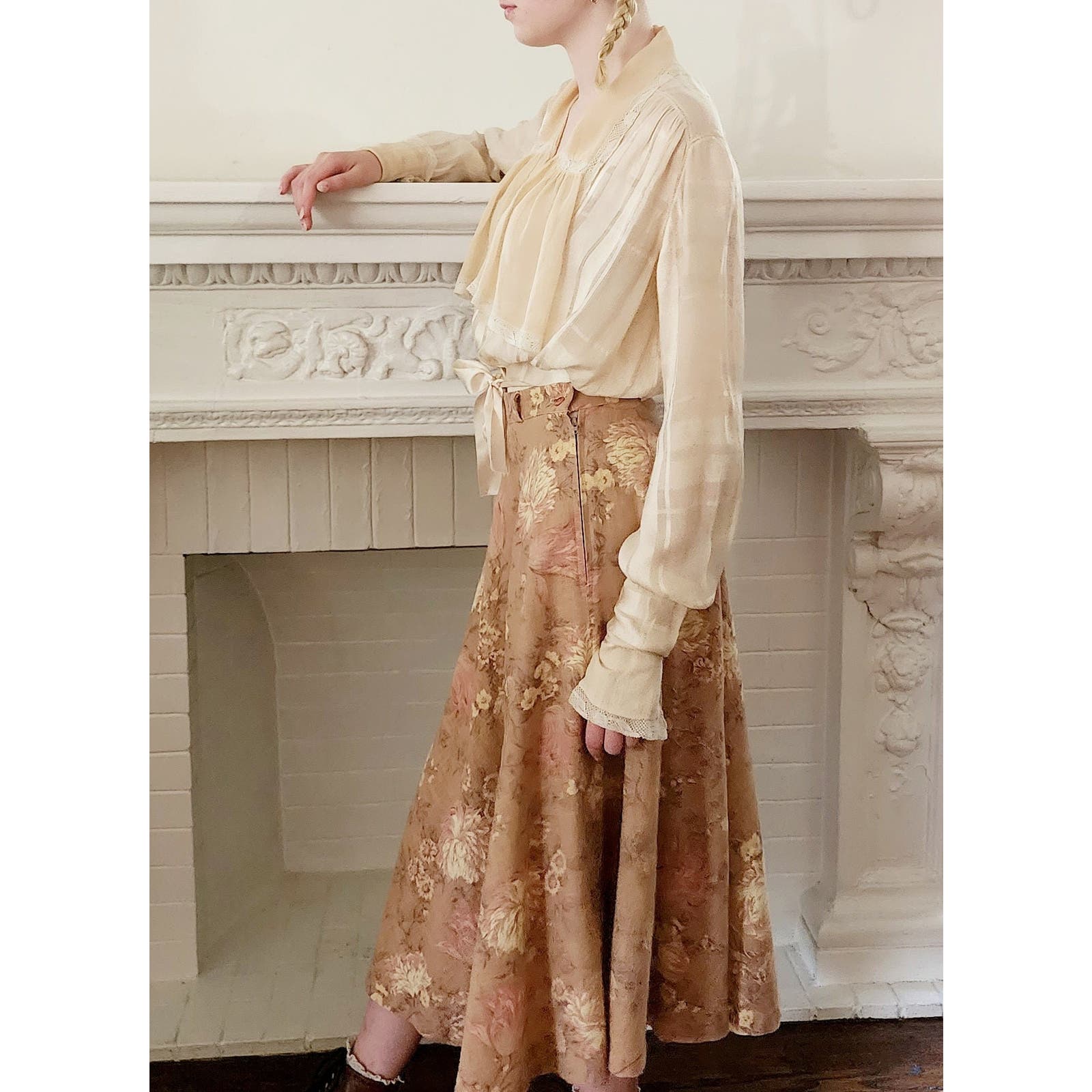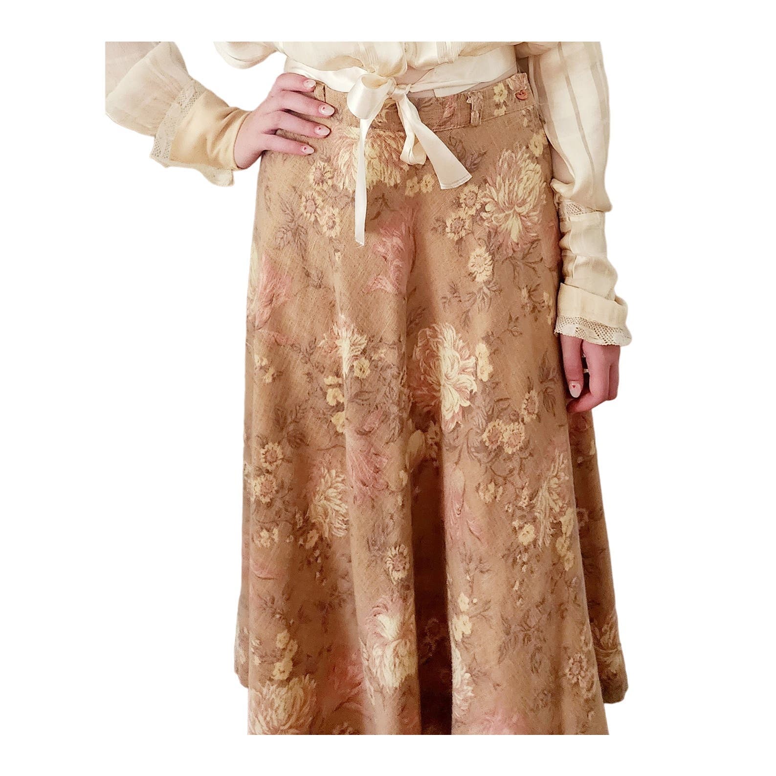 Vintage 70s Long Floral Print Skirt Peach Canvas