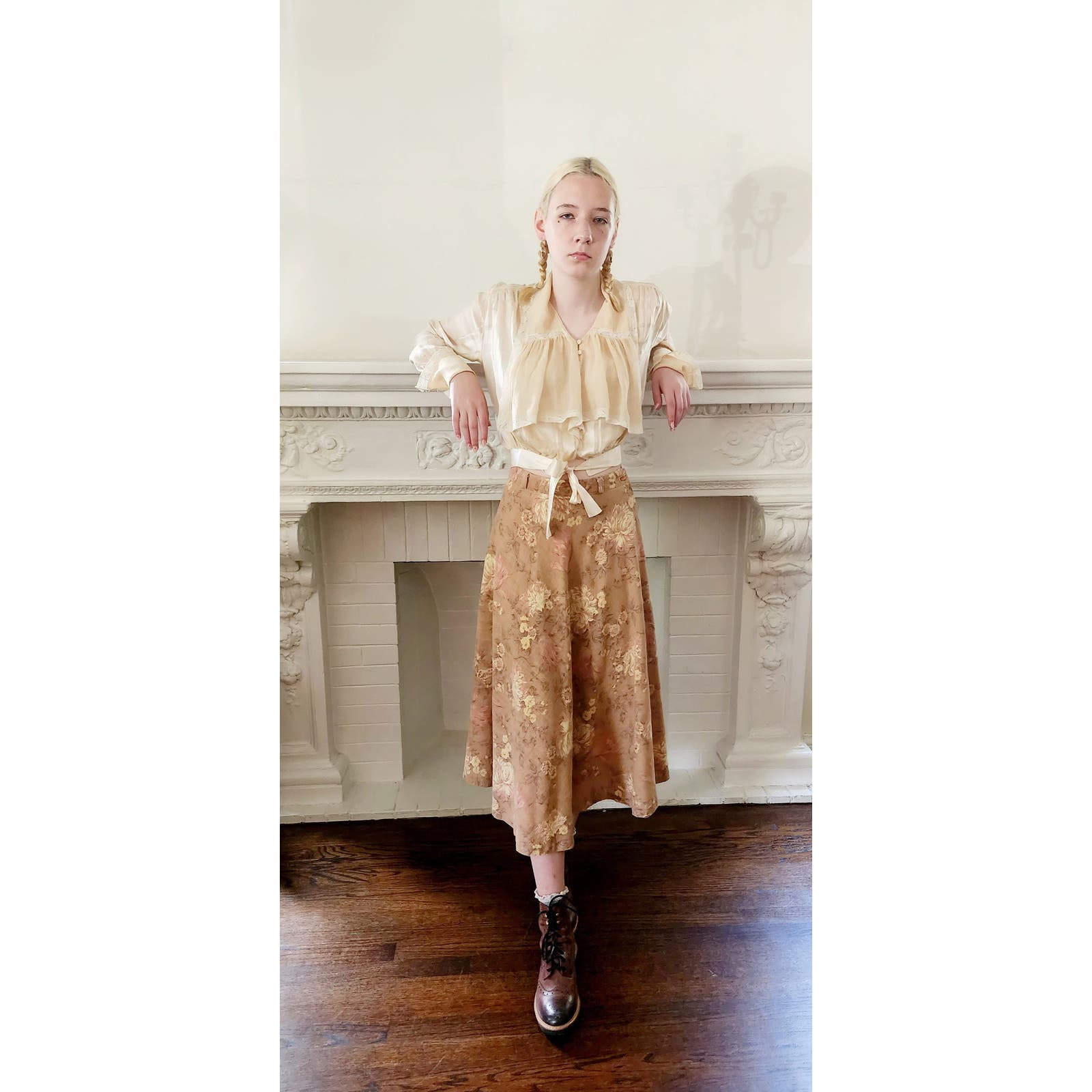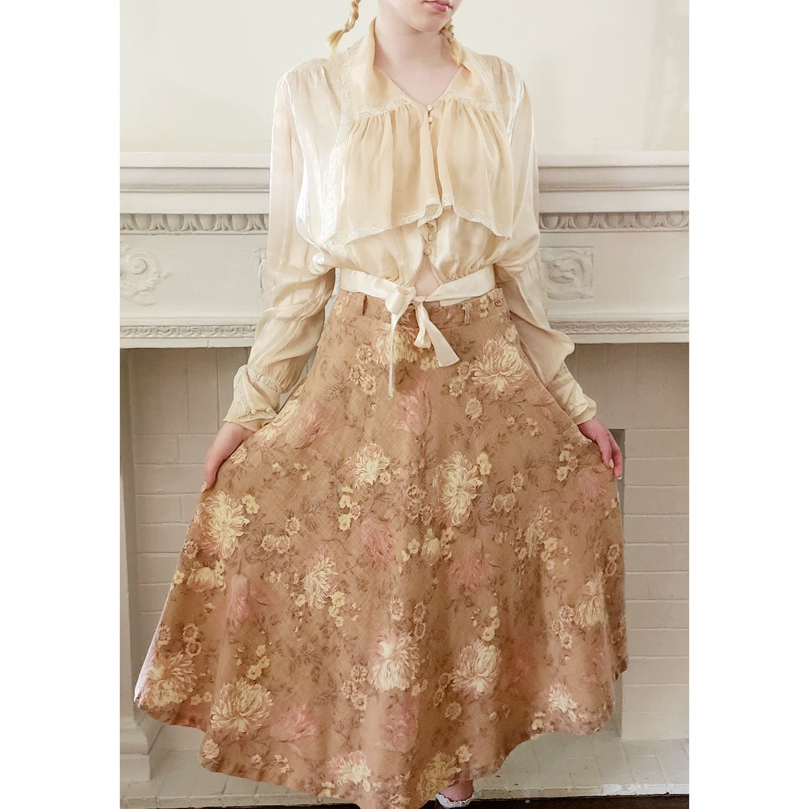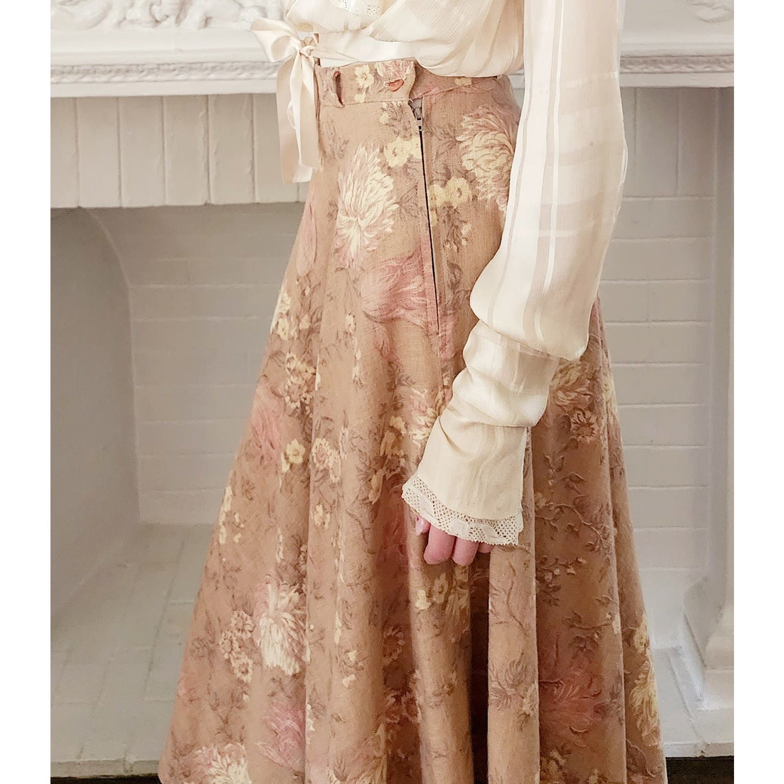 Thick cotton A line skirt with a high waist, this beauty has a canvas texture and features a peach and cream toned floral print emanating a romantic softness. Unlined. Closes with a zipper and button at the side. Belt loops at the waist give you an option to pull a sash through it!