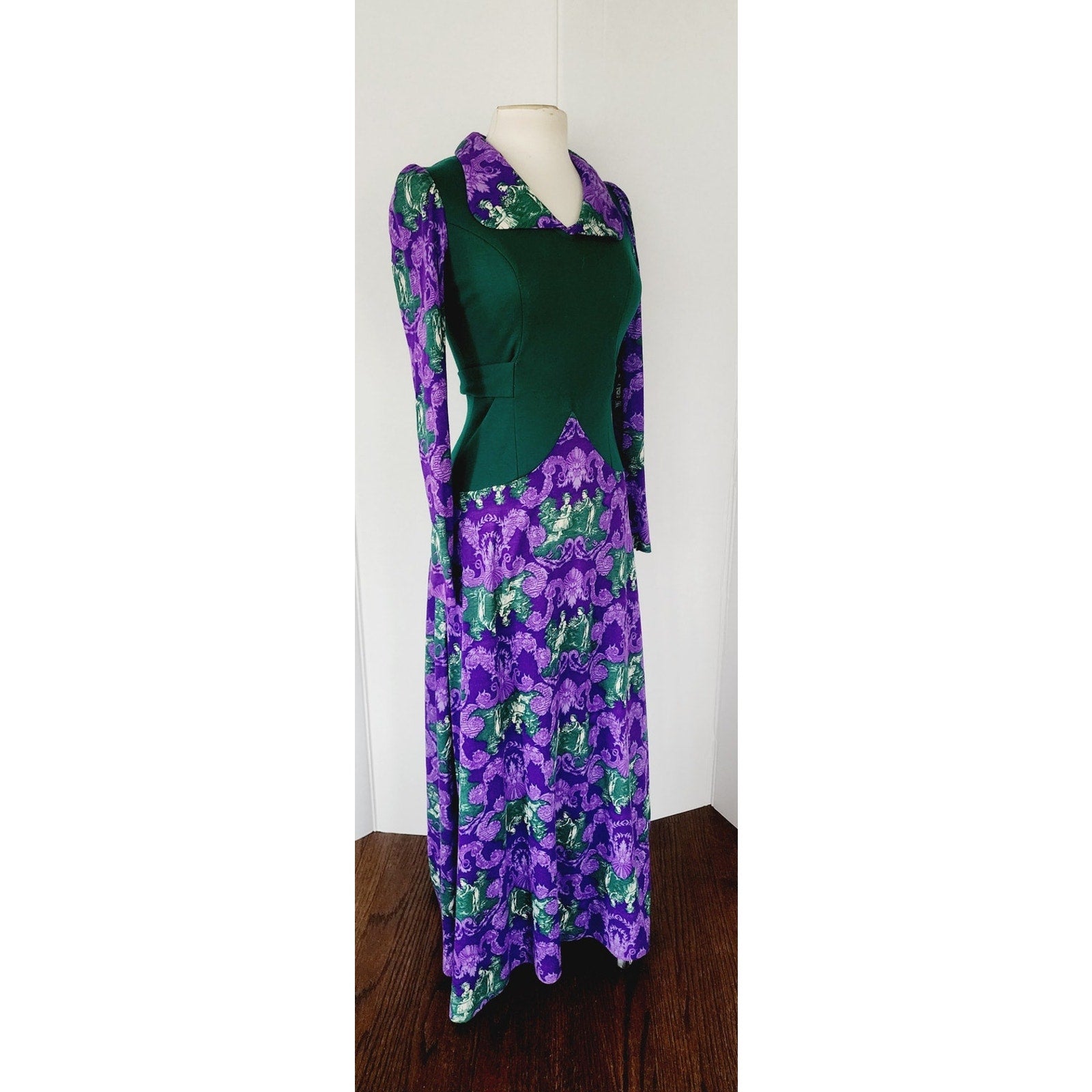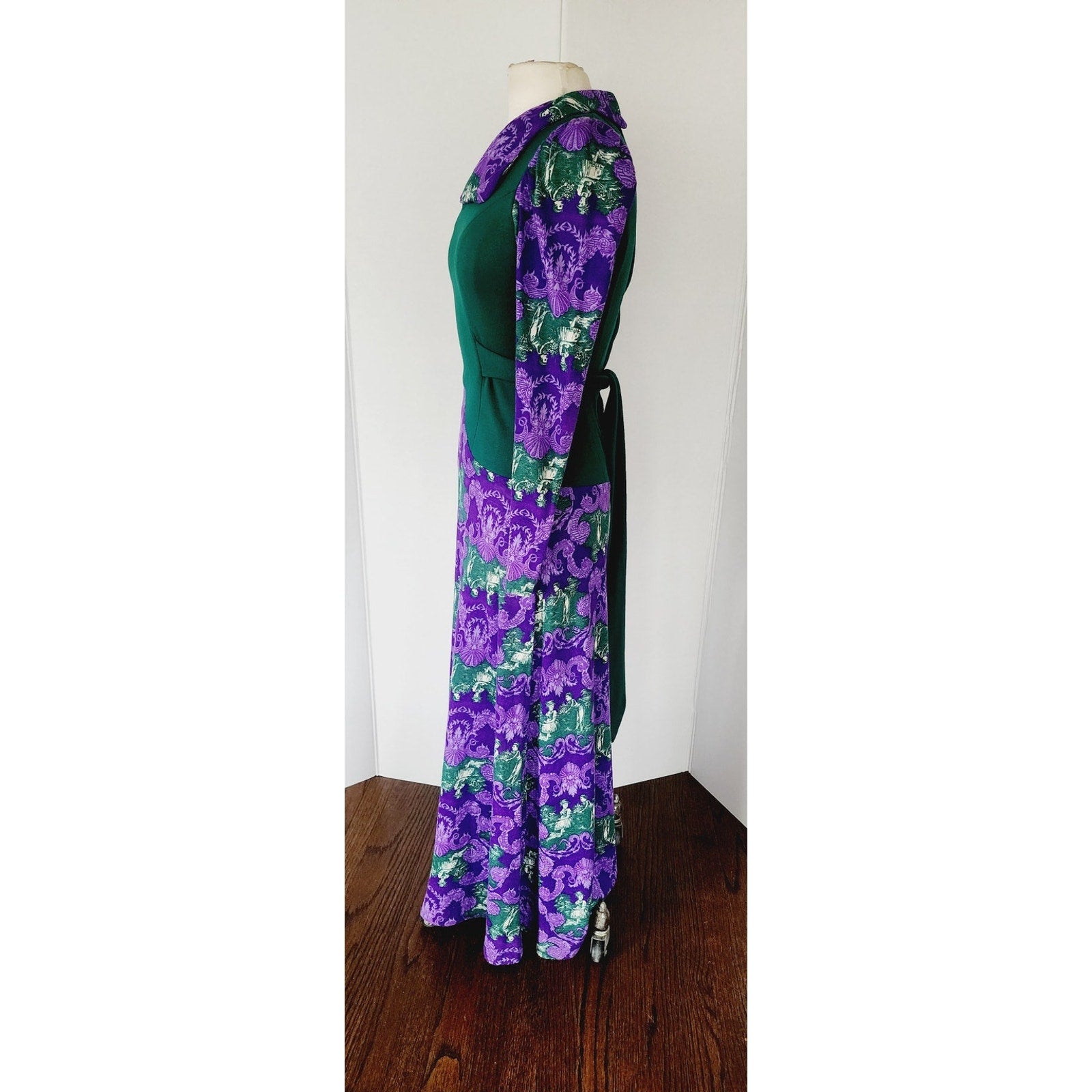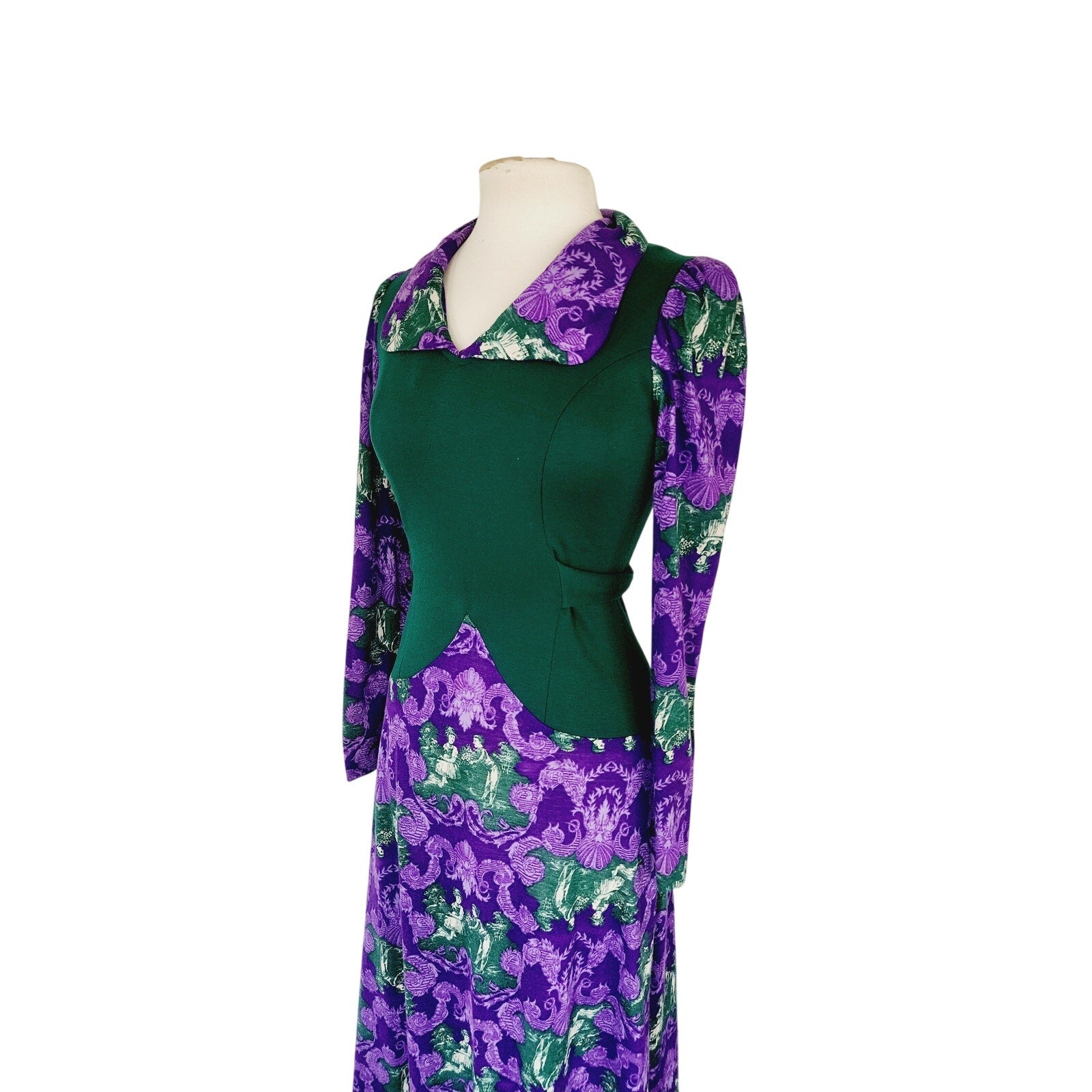 Striking, ankle length dress featuring a purple and brocade print a la French toile at the skirt, the long sleeves and the large, fold down collar with curved lapels. It's a mix of baroque style, ornate foliage, mixed with pictoral scenes of a couple in a pastoral landscape. Torso is in solid green with princess seams and a basque waist seam. The nipped waist is accentuated thanks to the green sash tie belt that knots at the rear. Closes with a zipper down the rear of the back. Unlined.