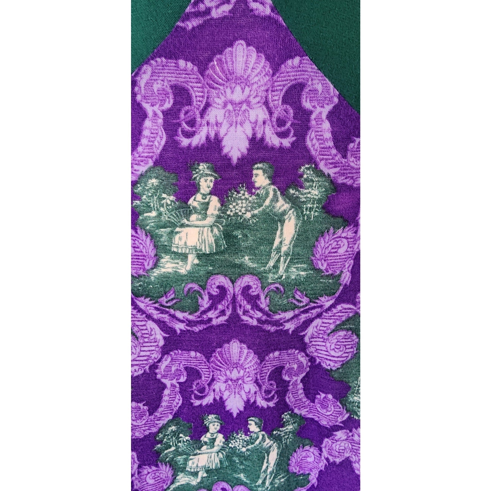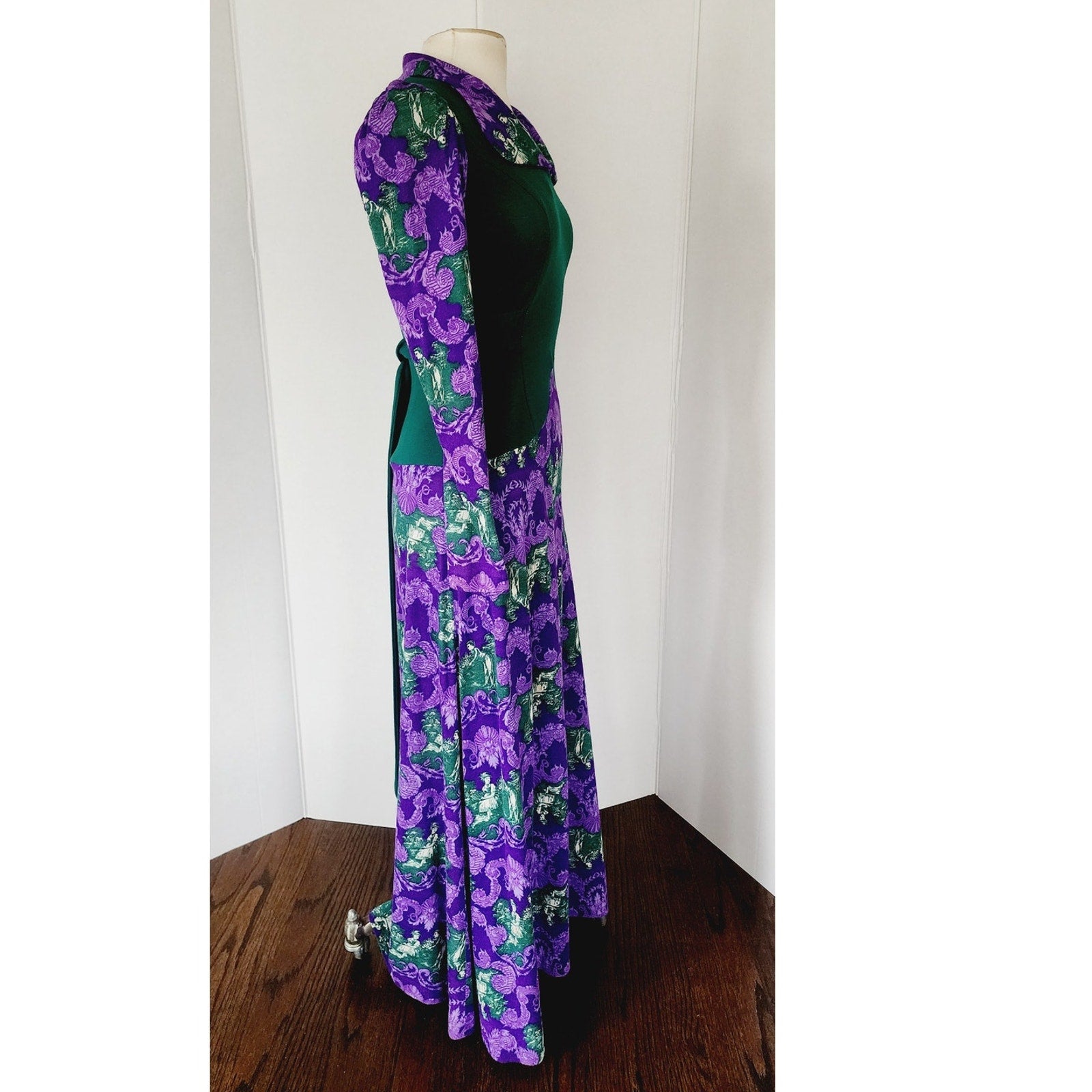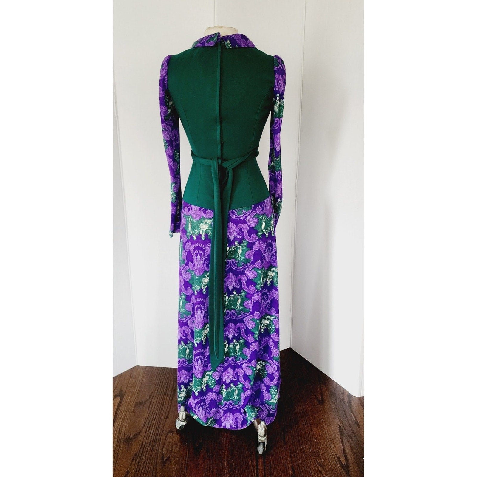 Striking, ankle length dress featuring a purple and brocade print a la French toile at the skirt, the long sleeves and the large, fold down collar with curved lapels. It's a mix of baroque style, ornate foliage, mixed with pictoral scenes of a couple in a pastoral landscape. Torso is in solid green with princess seams and a basque waist seam. The nipped waist is accentuated thanks to the green sash tie belt that knots at the rear. Closes with a zipper down the rear of the back. Unlined.