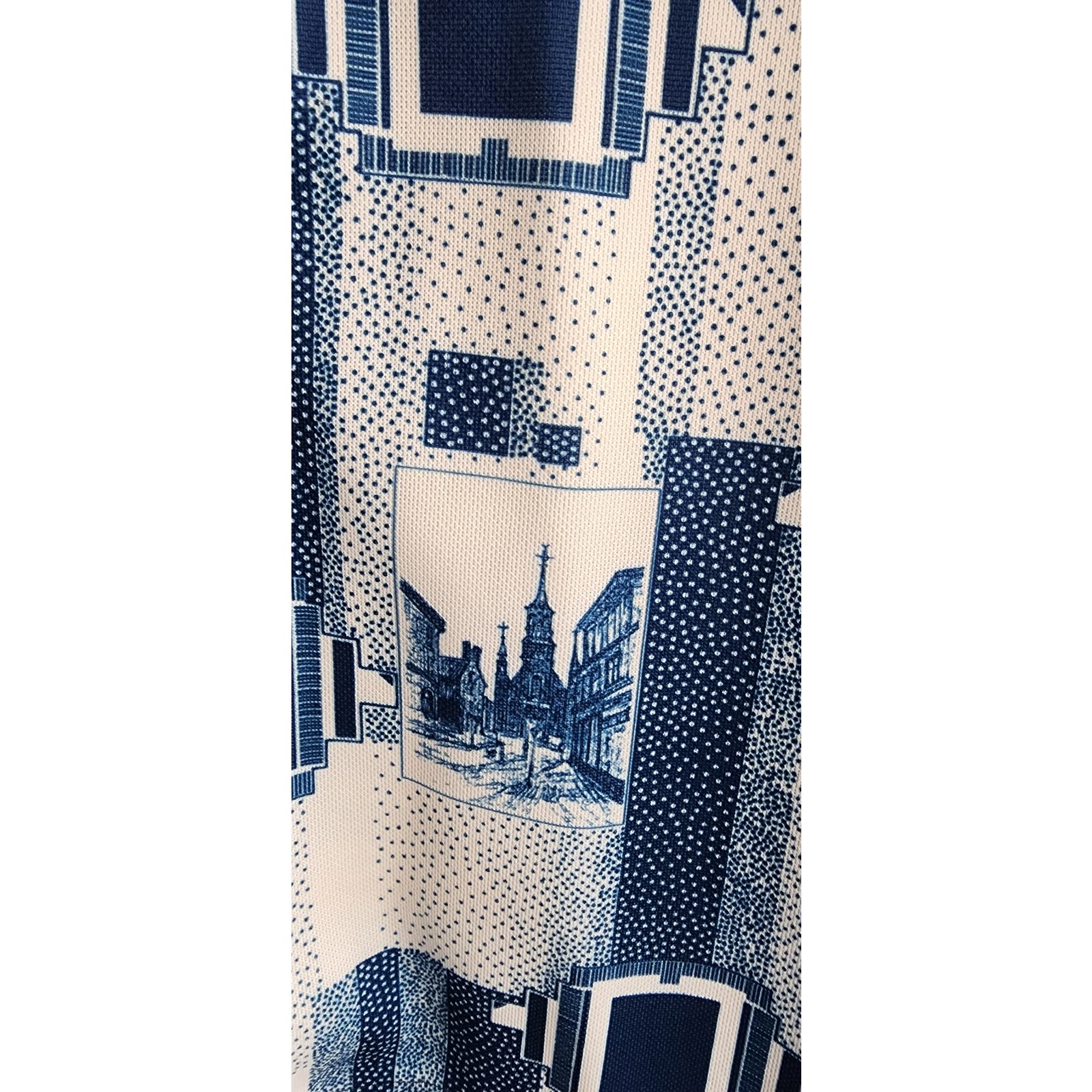 Striking long sleeved shirt with a large, fold down collar, and wide, buttoned cuffs. Closes with black buttons down the center. There is a chest pocket at top left side. This one is all about the unusual print: a mix of abstract/geometric pattern of squares and dots, with scenes of town life centering on churches, quaint cottages and fishing villages! One of a kind!