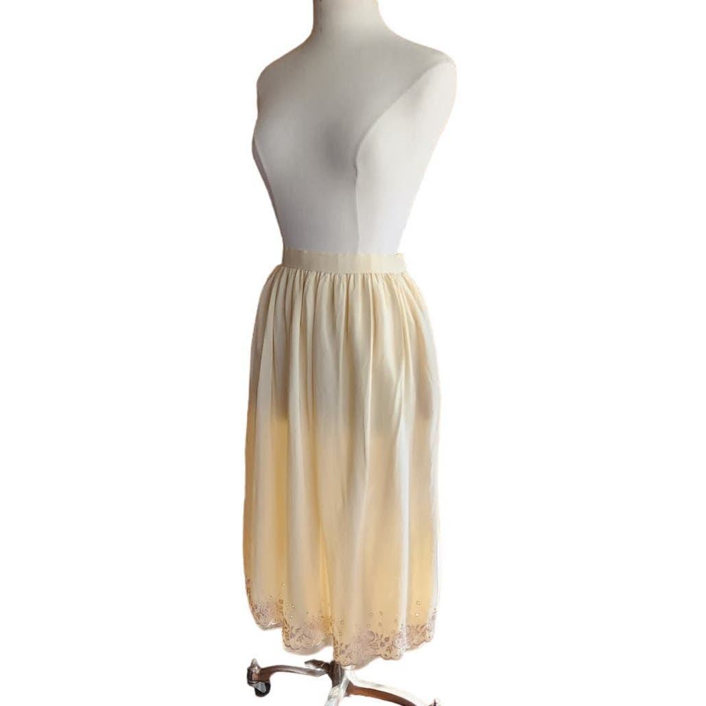 Classic and very romantic cream silk skirt with a high waist band, a loose silhouette ending at mid calf, and zipper closure. Bottom of skirt has a lovely eyelet and floral, lace embroidered panel running across. Fully lined, the lighter colored, chiffon liner pokes out provocatively under the embroidery.