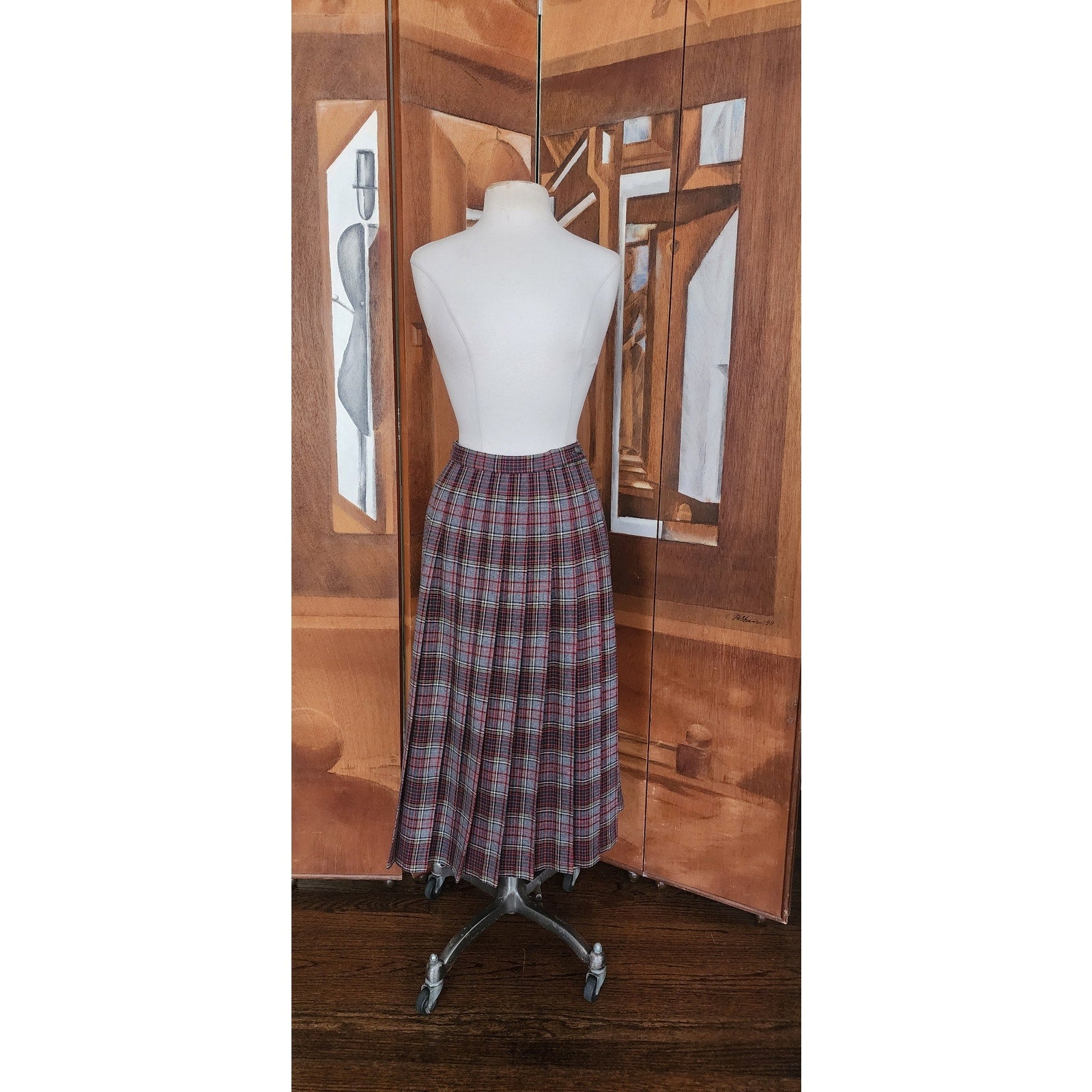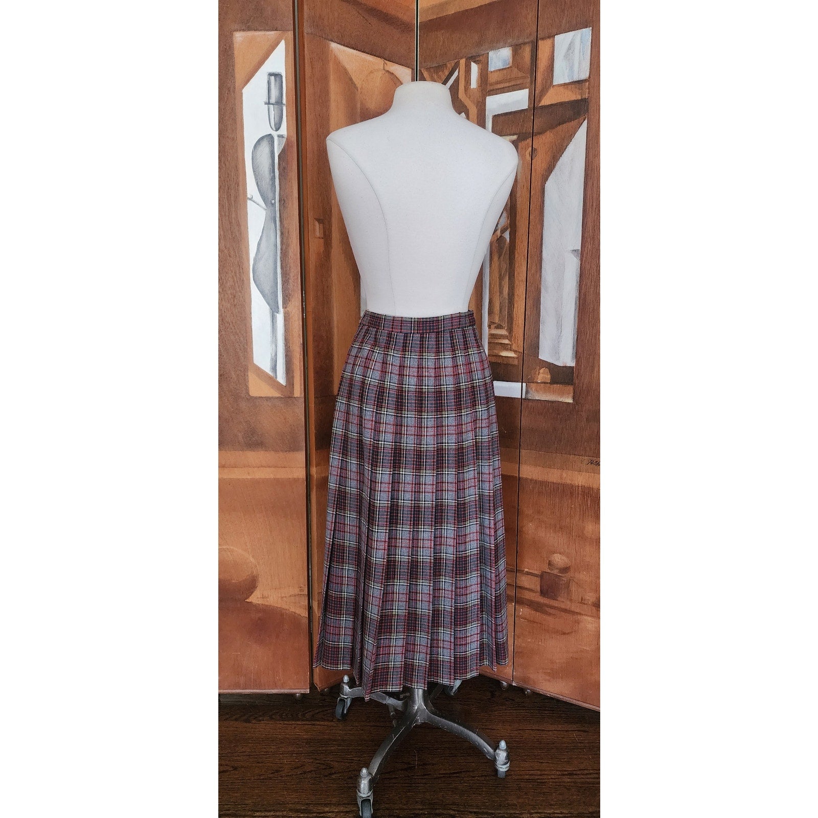 High waisted, pleated, and cut on a gentle A line with zipper closure at the side. Gorgeous and thick wool paid in tones of red and gray.