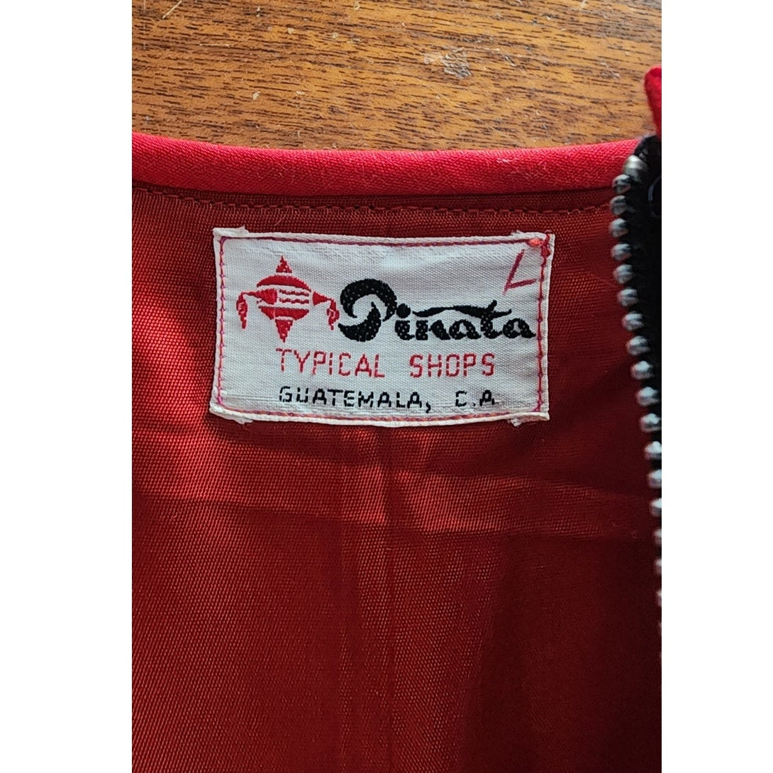 Traditional Guatemalan poncho in a heavy navy blue wool felt with red embroidery. Collarless, it has the option of a zipper closure at center chest. Note the embellished apron pockets at the hip fronts and the ornate red trim throughout. Lined in satin. There are buttons along the red trim that you can use to close it up at the sides, creating sleeves, or leave it open and be free.