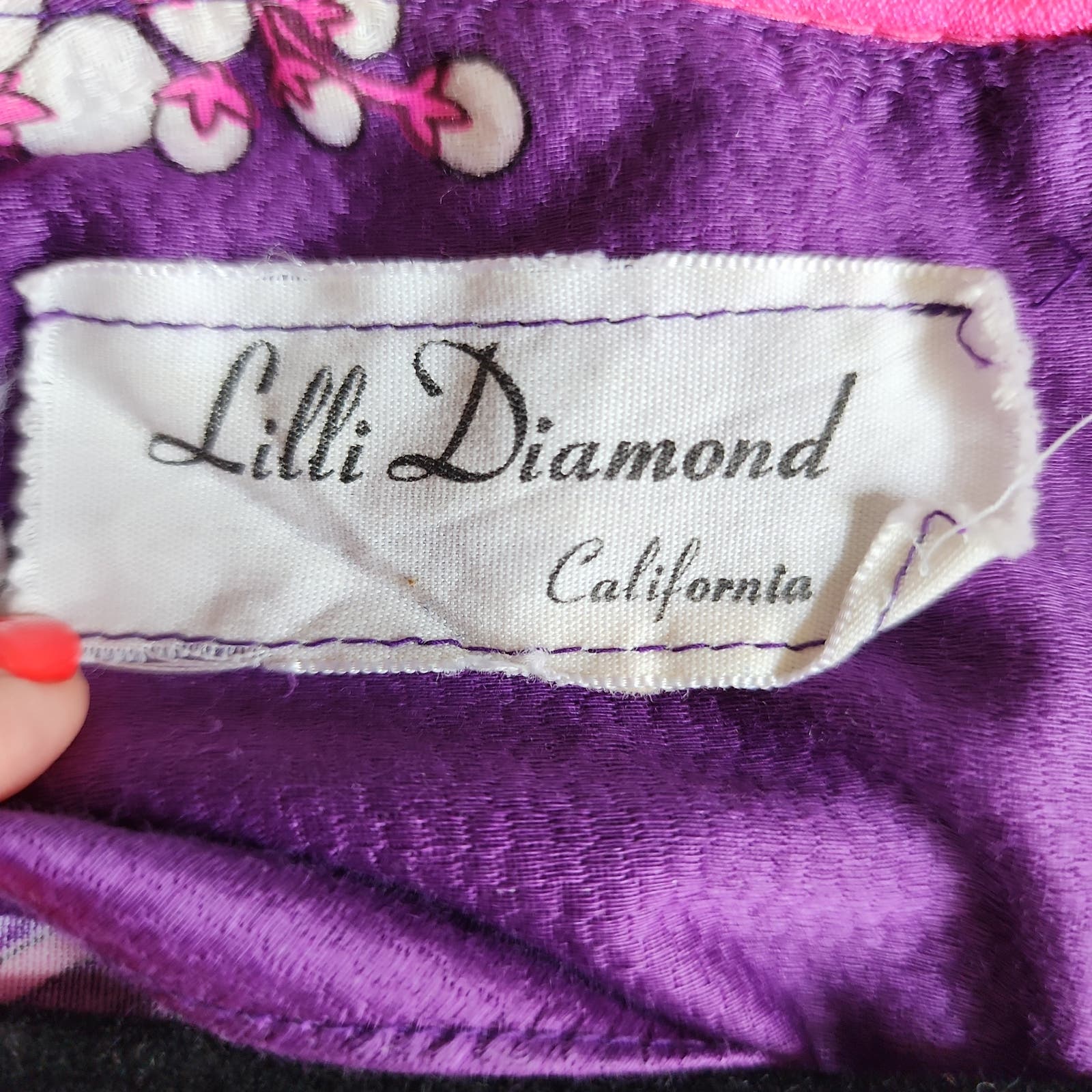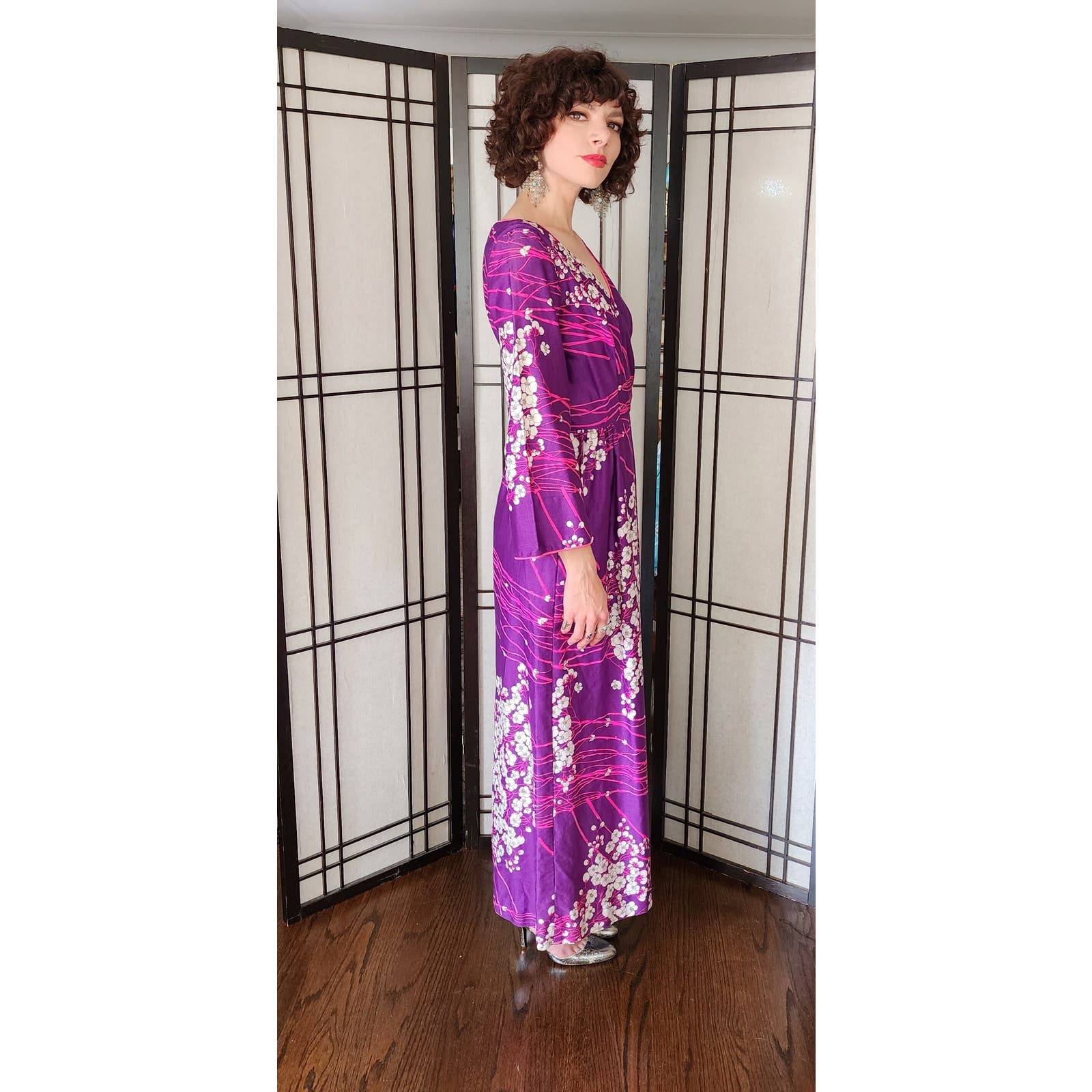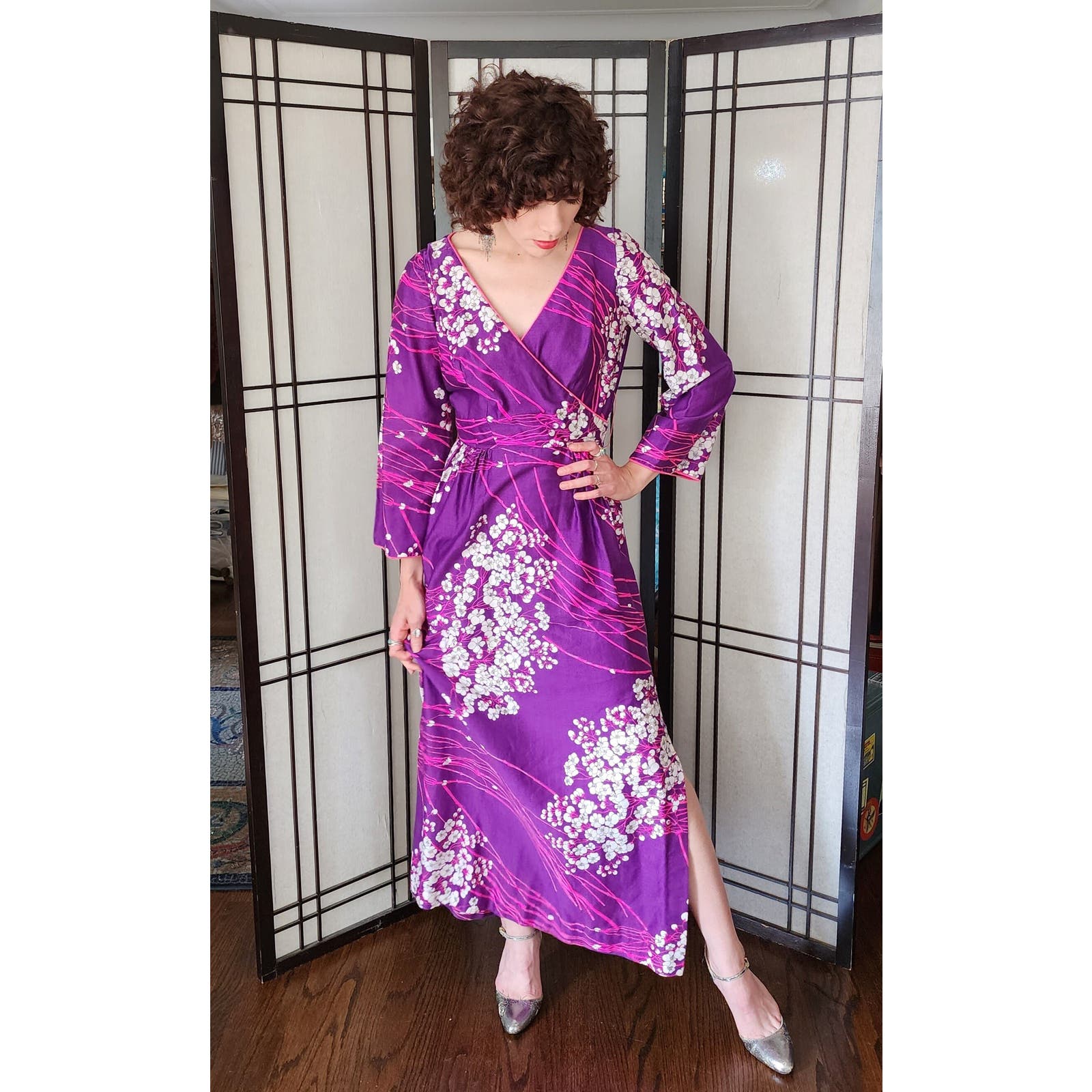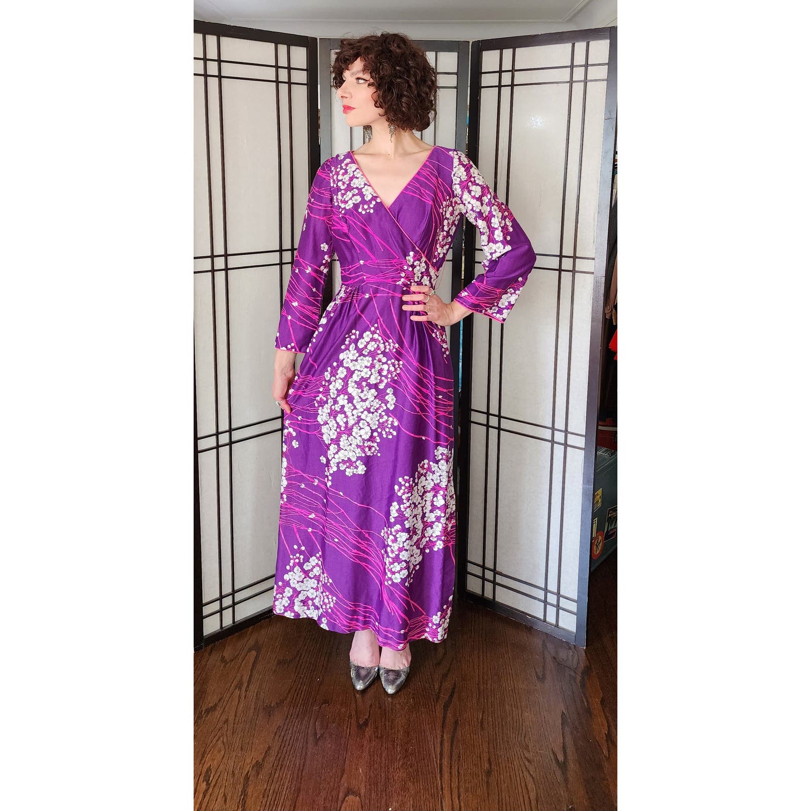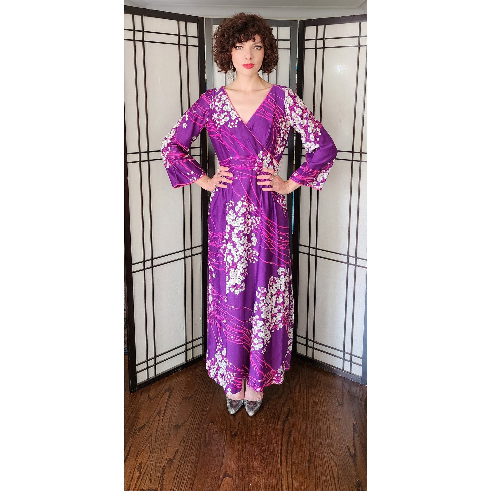 Vintage 70s Purple Maxi Dress Tiki Floral Print w/Long Sleeves Lilli Diamond