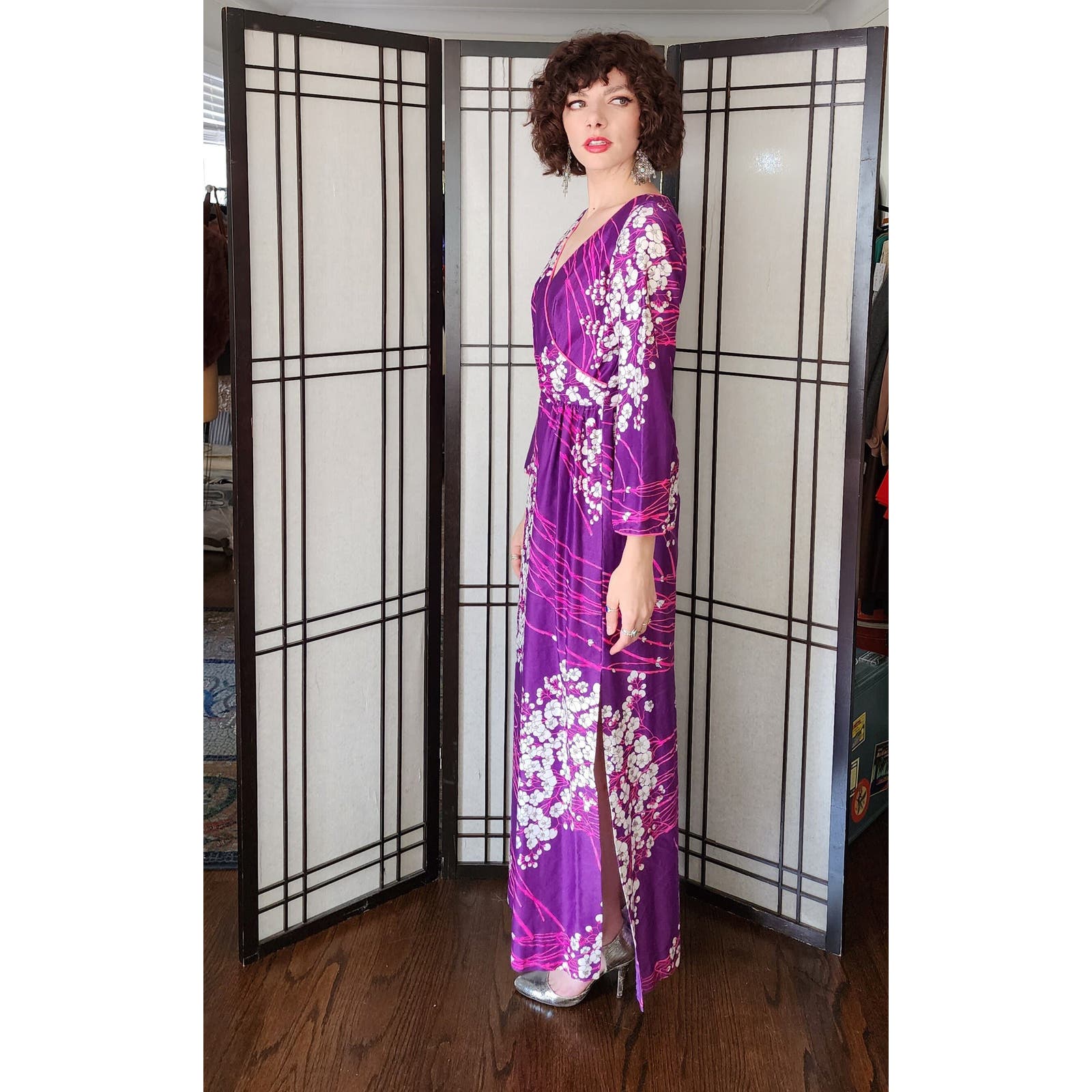 Striking dress in a delicious floral print of white flowers, pink branches, against a purple background, it has a V neckline, long sleeves, nipped waist, and a long skirt ending at the ankles and featuring a deep slit at left side. It closes with a zipper down the center of the back. Soft and comfortable. Unlined.