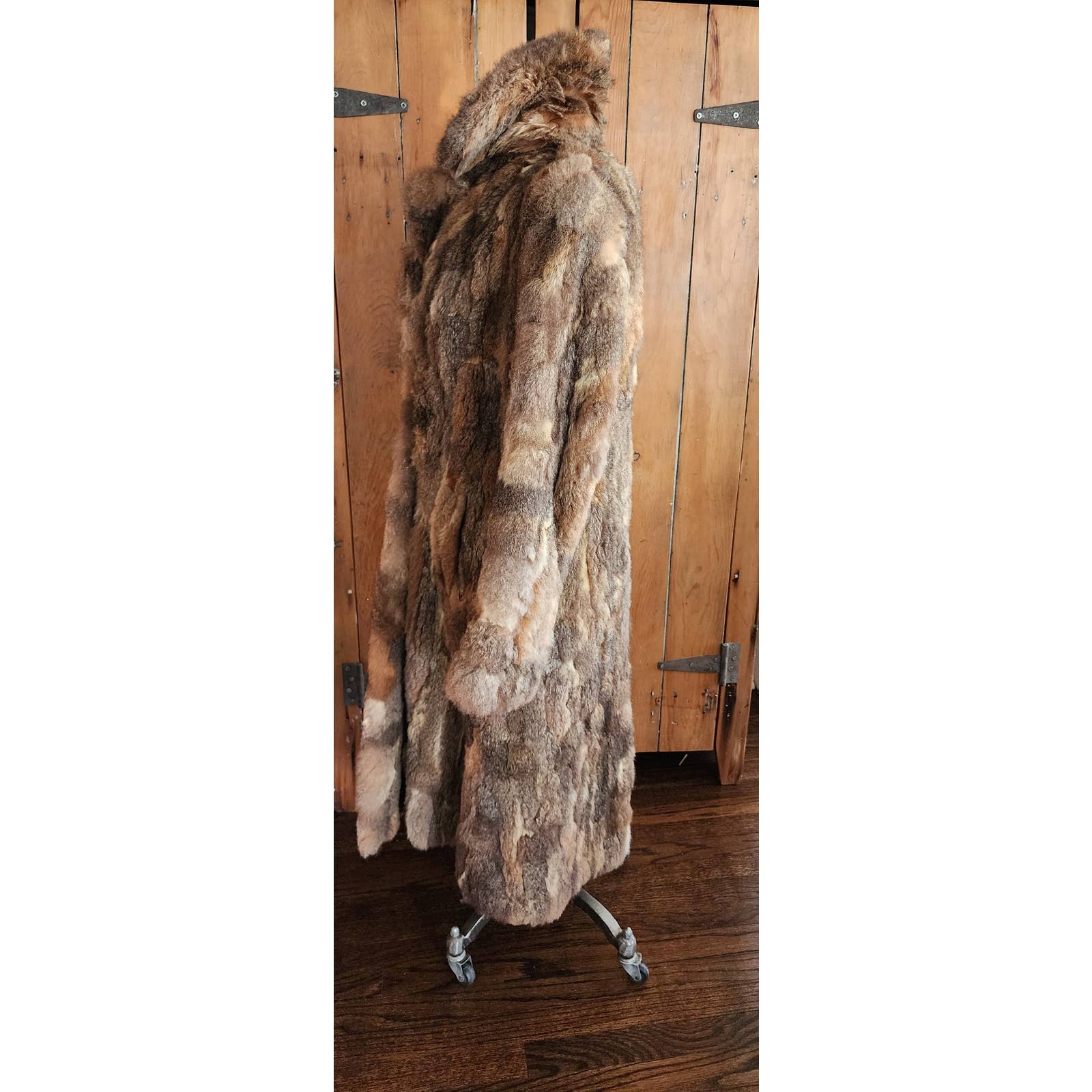 Exquisitely plush and surprisingly light weight (thanks to the airy quality of rabbit fur) long coat with a large, fold down collar and slit pockets at the hip fronts. Closes in the center with hidden hooks and features a striking brown toned satin lining!
