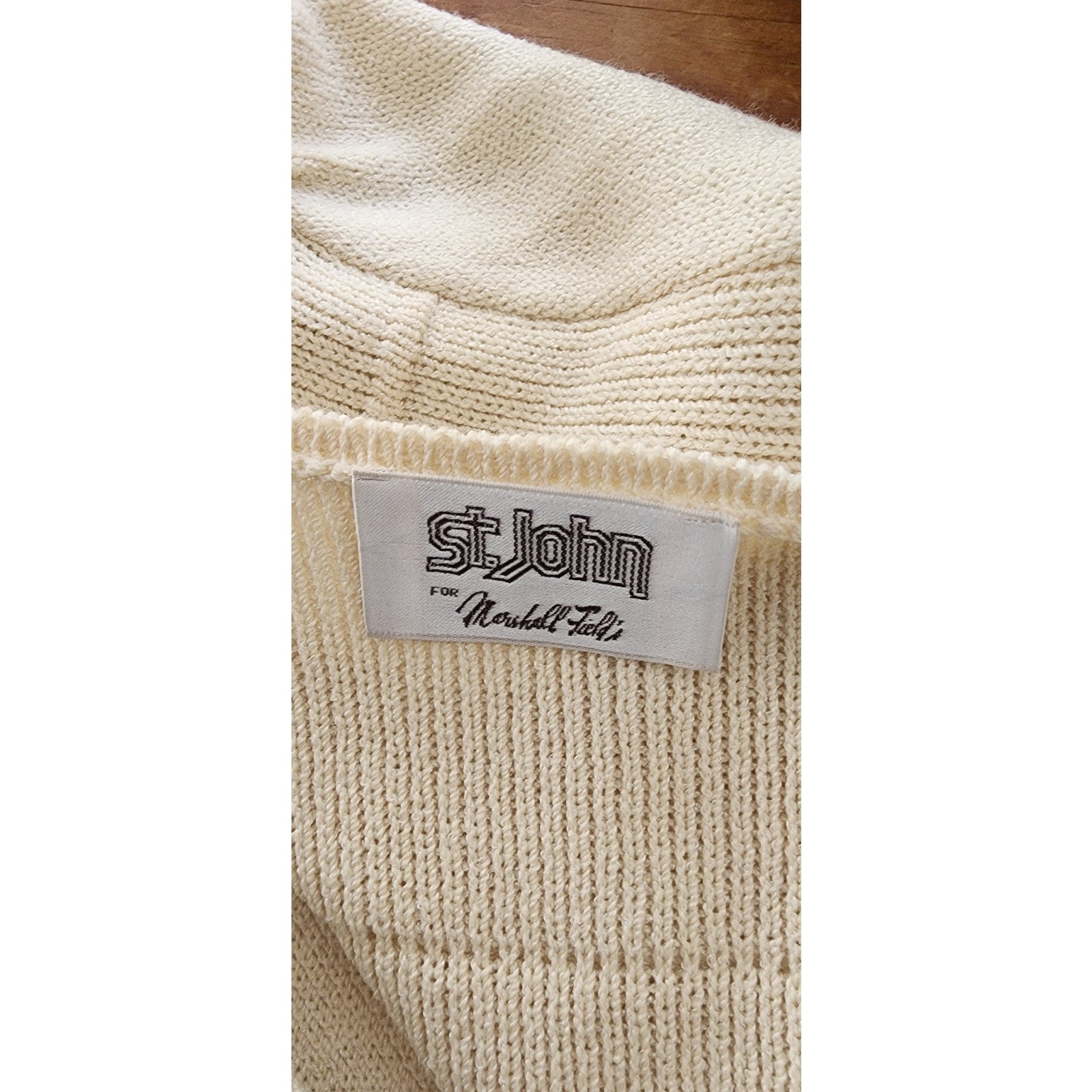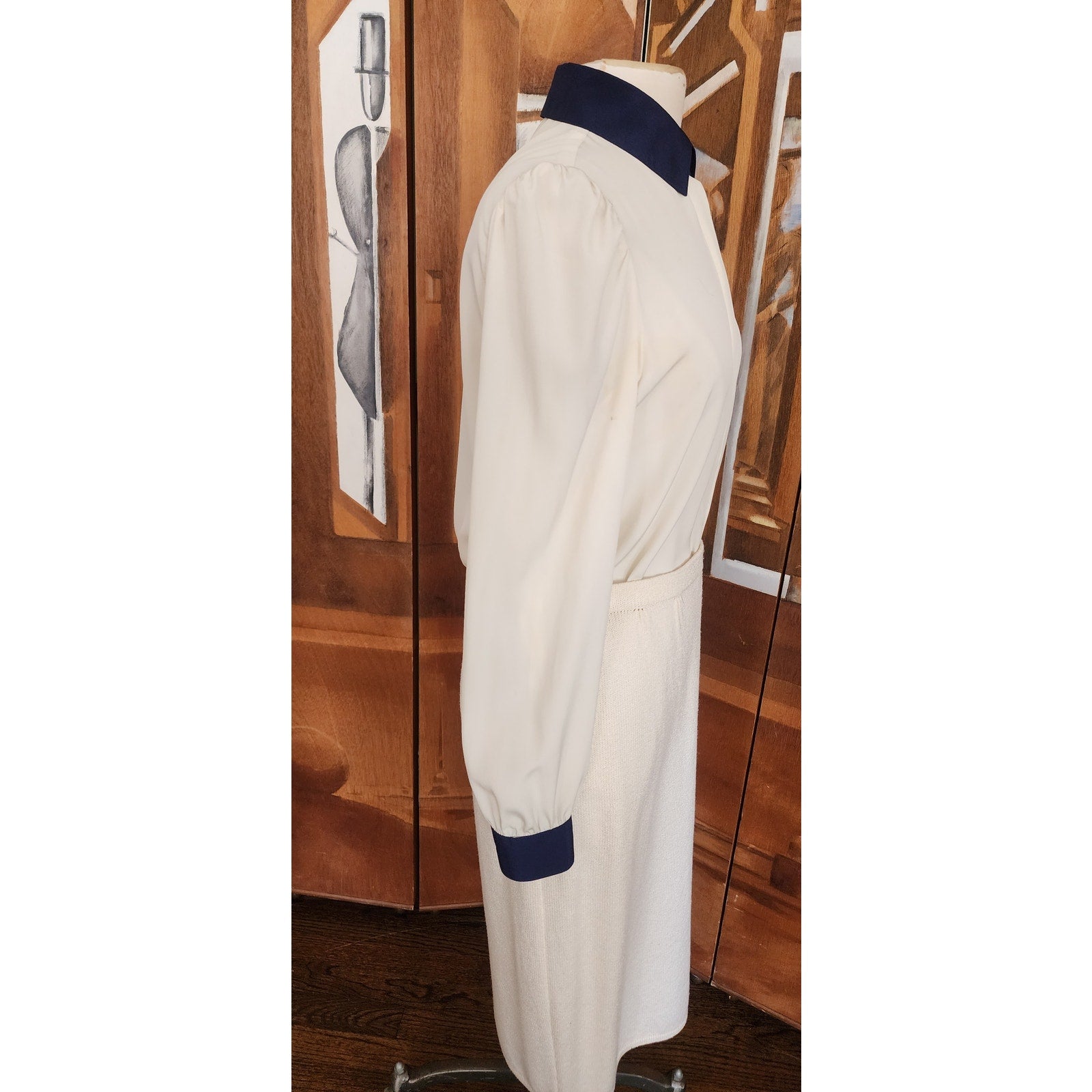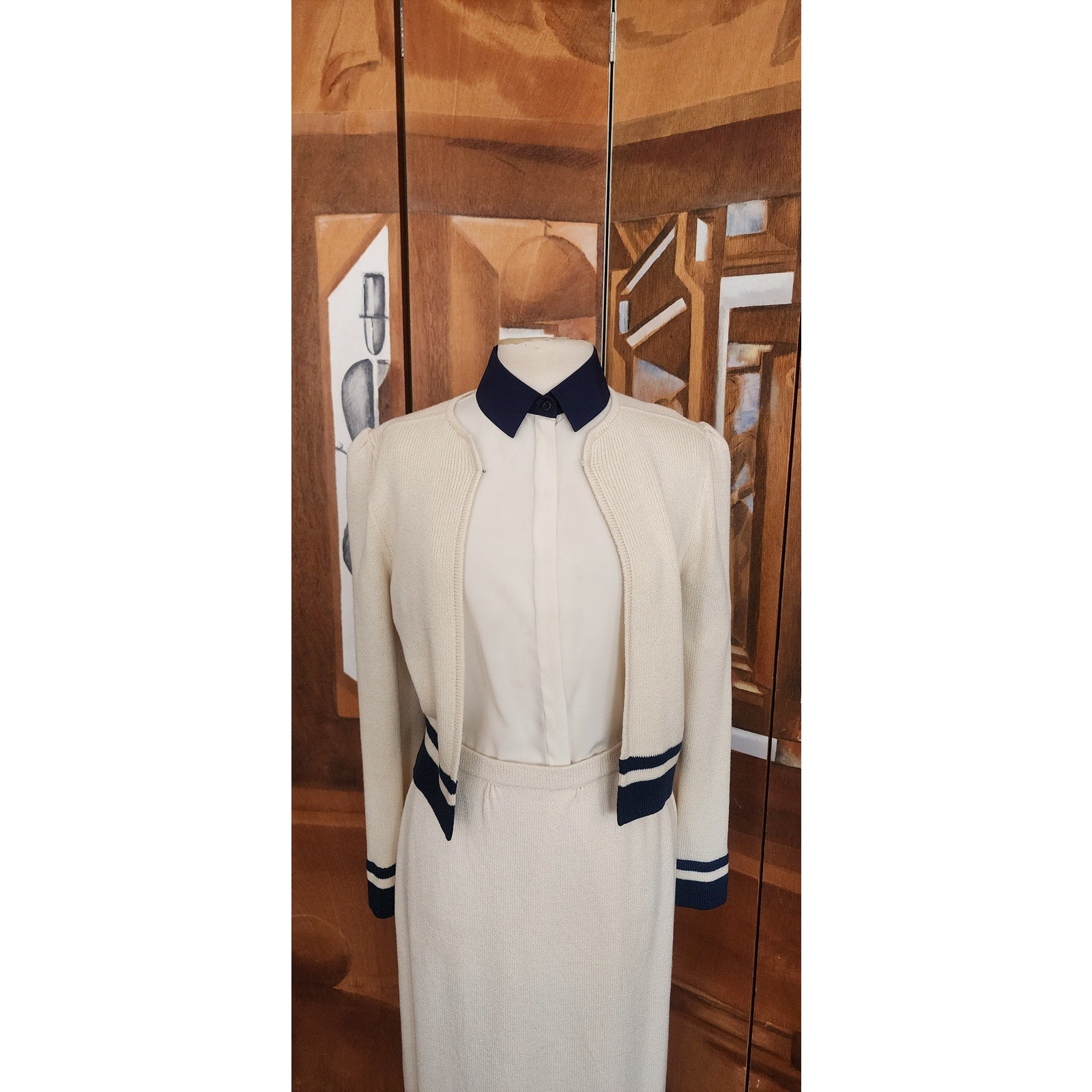 Vintage 70s St John Knit Skirt Suit + Blouse Three Piece Set Cream Navy Blue
