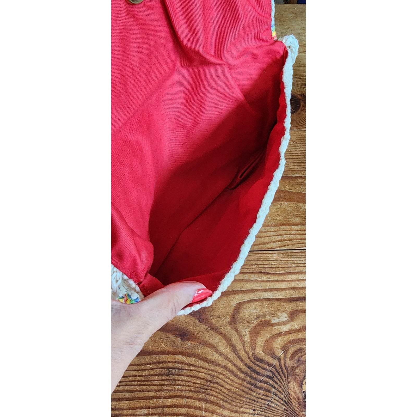 Fun and lightweight shoulder bag in a braided straw, it has a rectangular body with a top flap closure with a clasp at the interior. It has a matching, white straw shoulder strap. Front and back are decorate with a joyful rainbow wave pattern. Interior lined in a red cloth as a single compartment. No labels or tags.