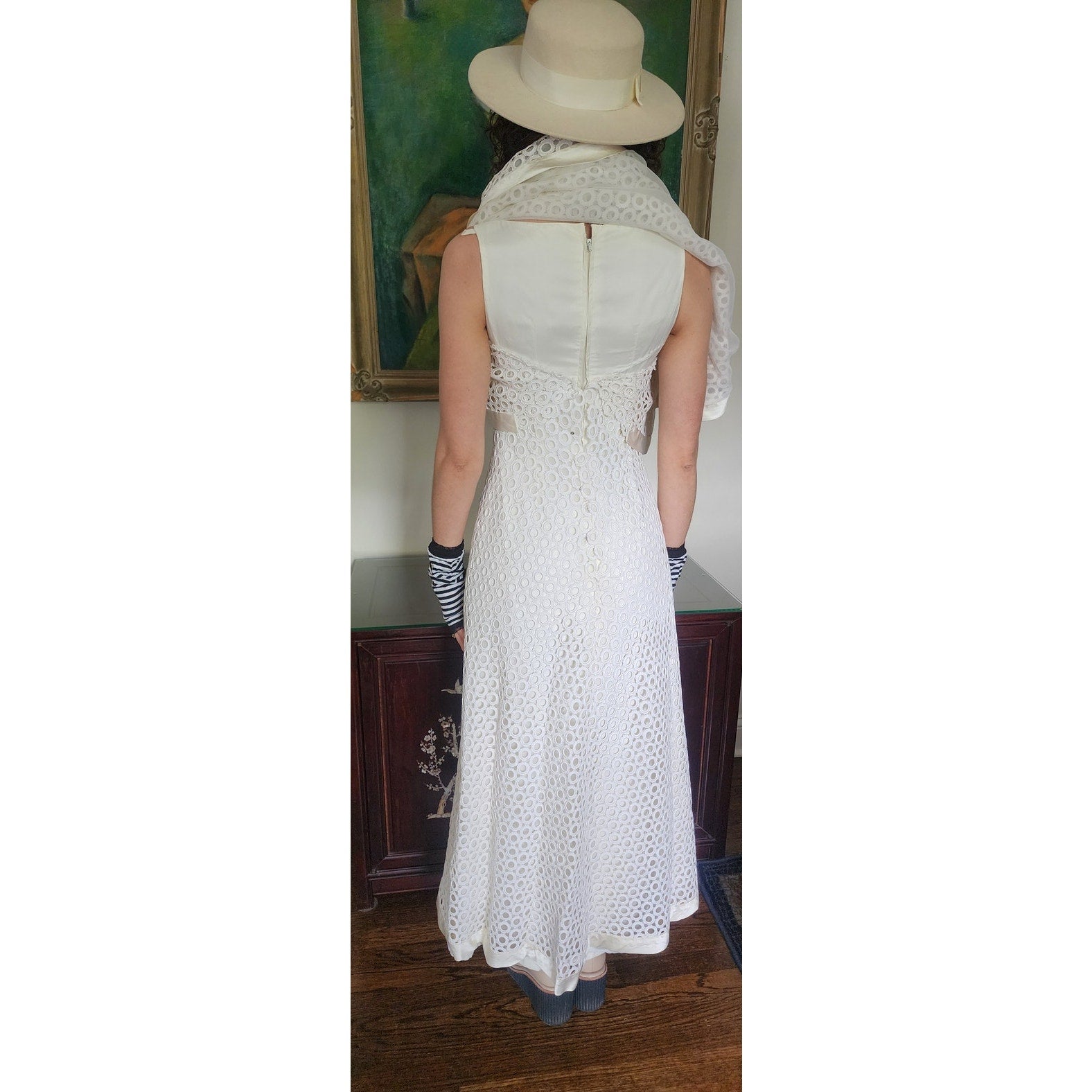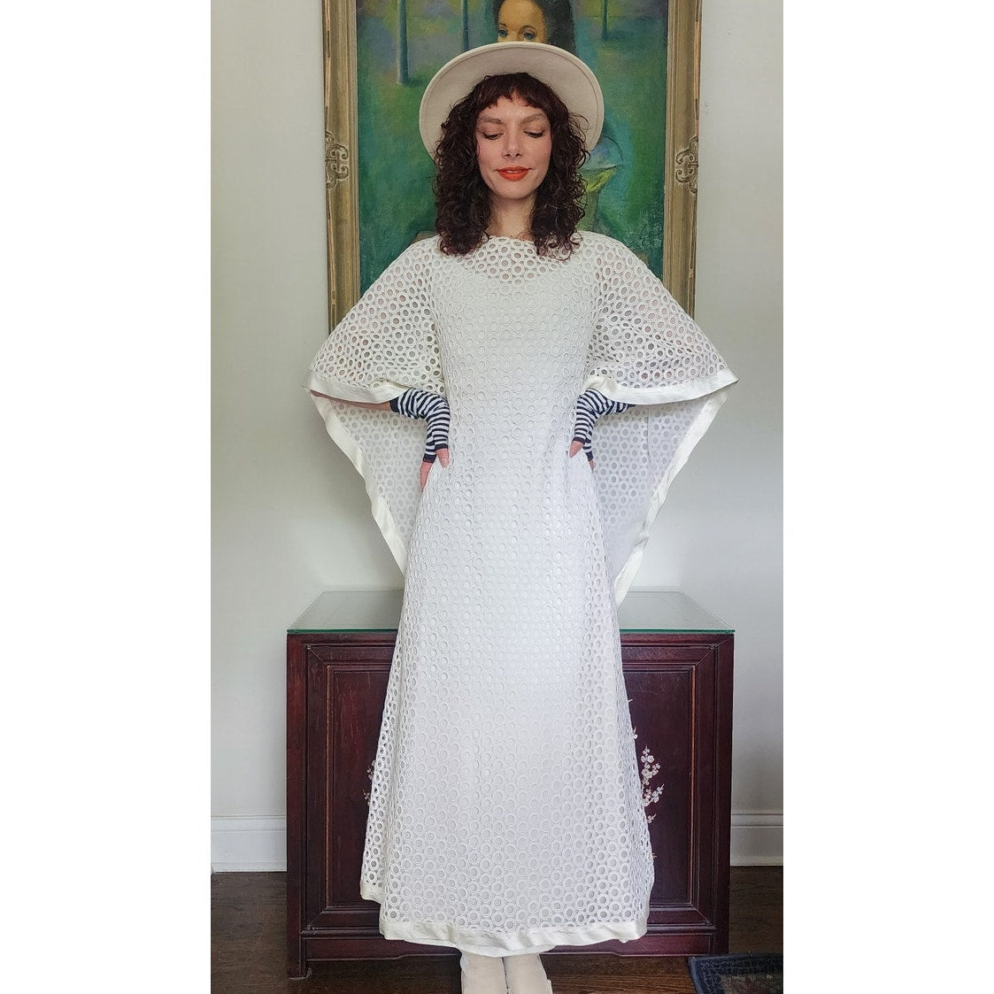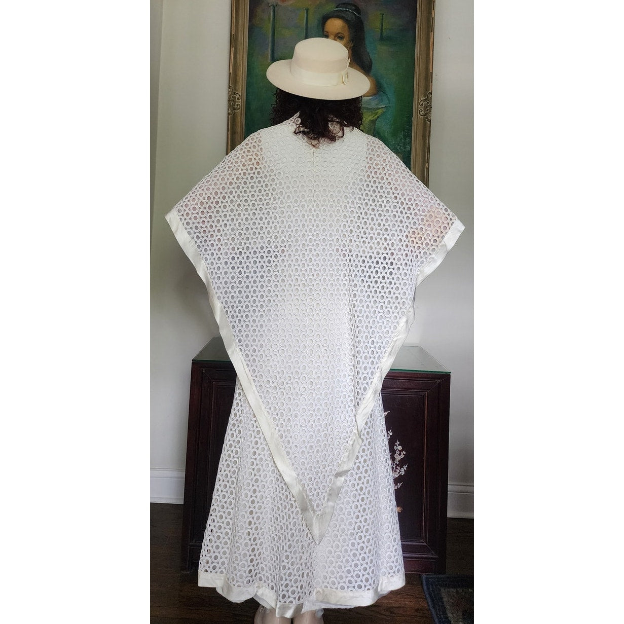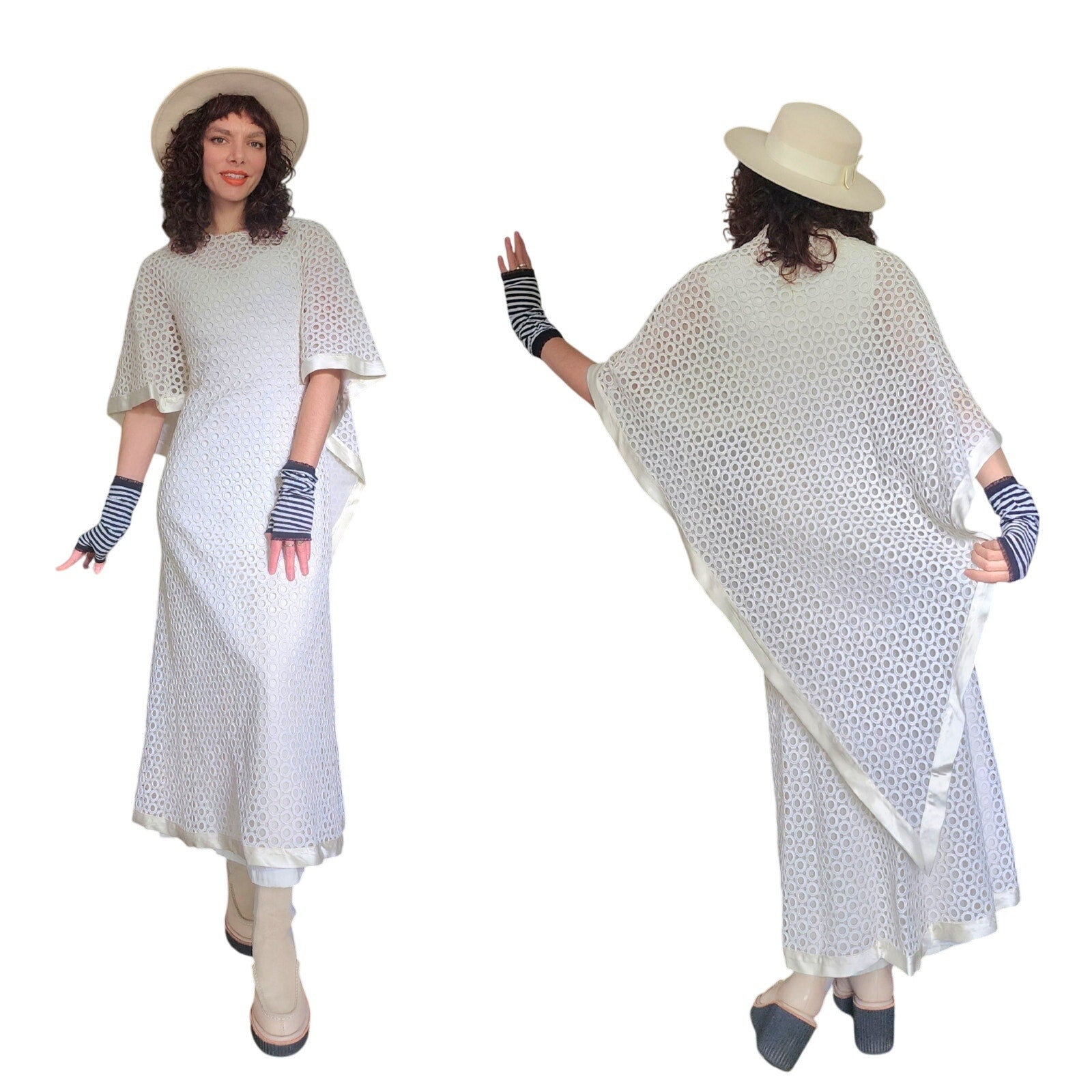 Stunning dress in openwork white cotton crochet - creating a repeated circle pattern throughout. The base/shell of this dress is a satin, sleeveless frock that is fitted at the torso and nipped at the waist with a slightly A line, ankle length skirt. The attached overlay layer is the sheer crochet with an attached capelet at the rear that hangs down towards to the bottom rear of the skirt, ending in a V shape. Satin trim along the edges of the capelet and the hem. The overall effect at front creates half-length like "sleeves". Closes with a zipper at the satin layer and snaps at the crochet layer. No tags.