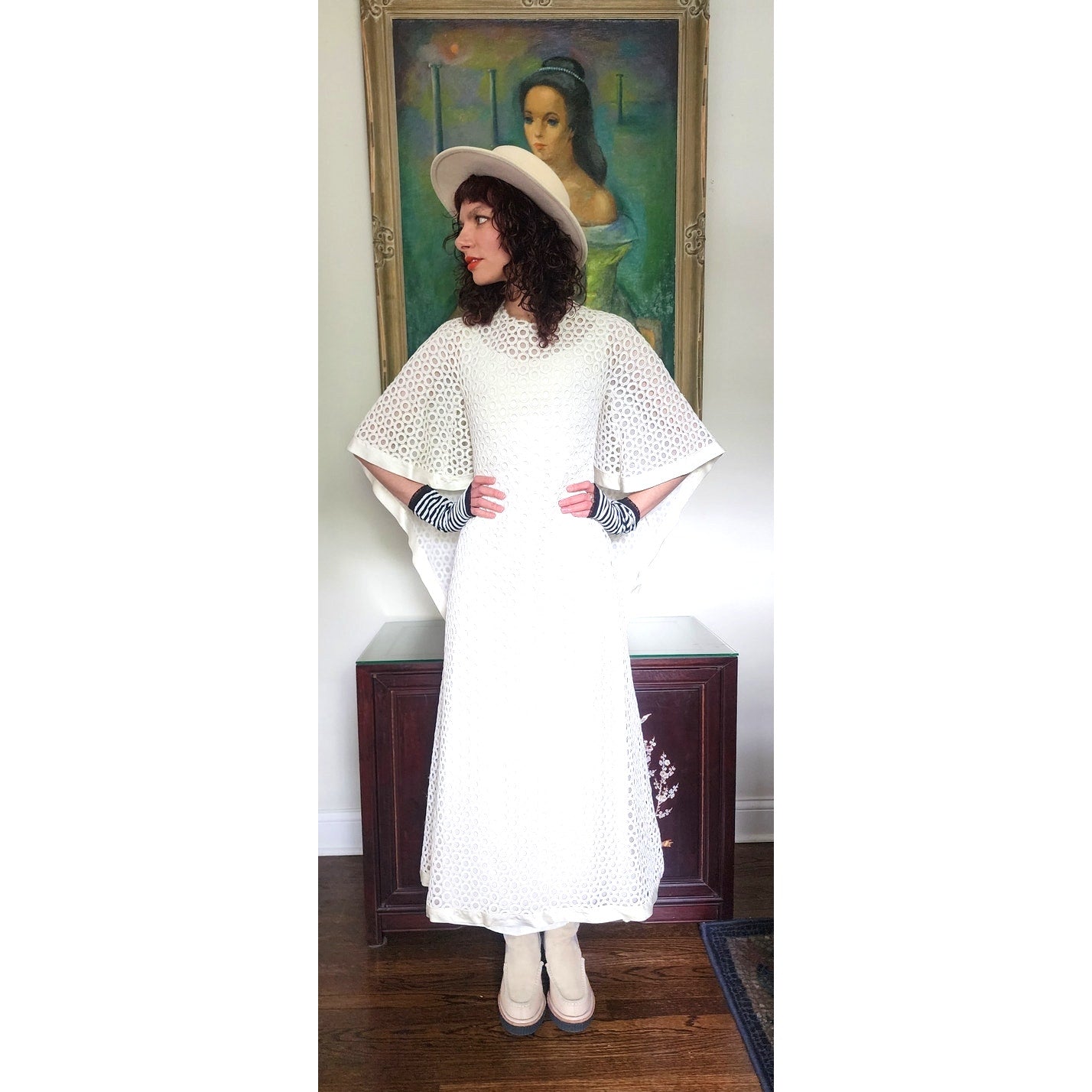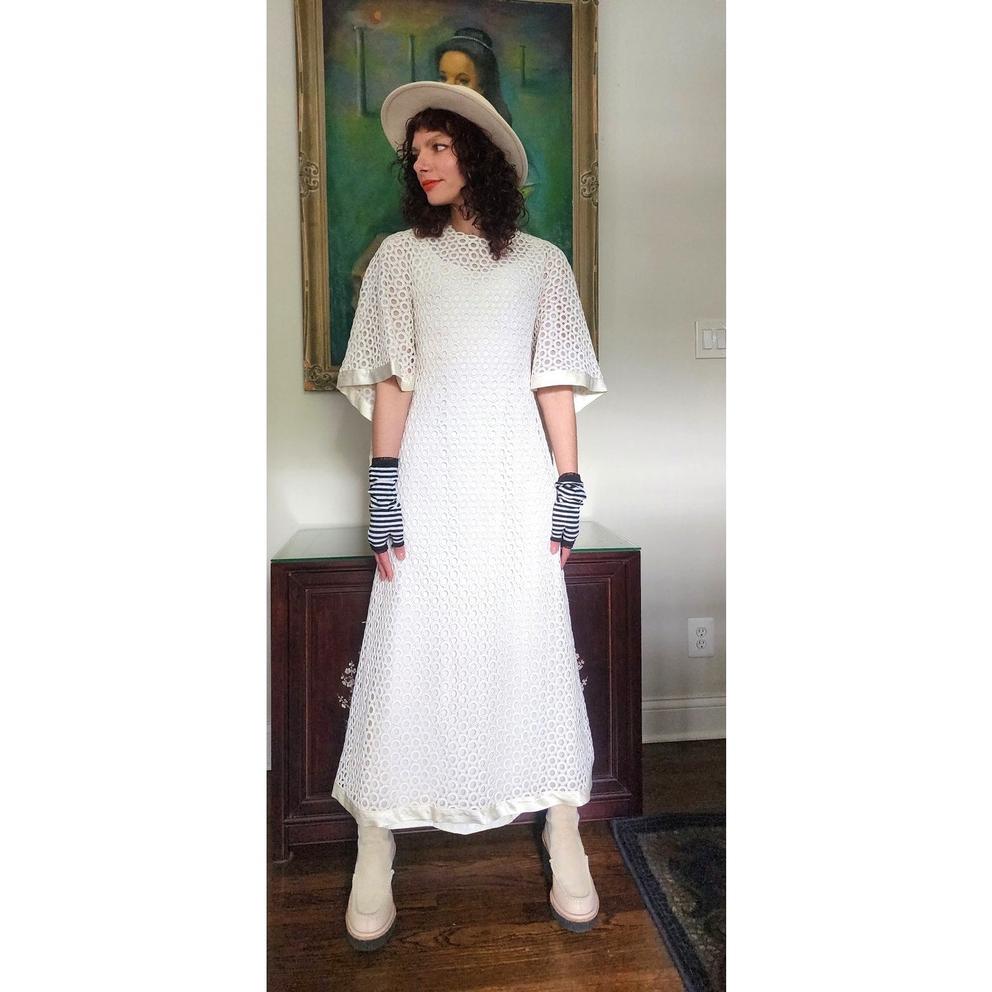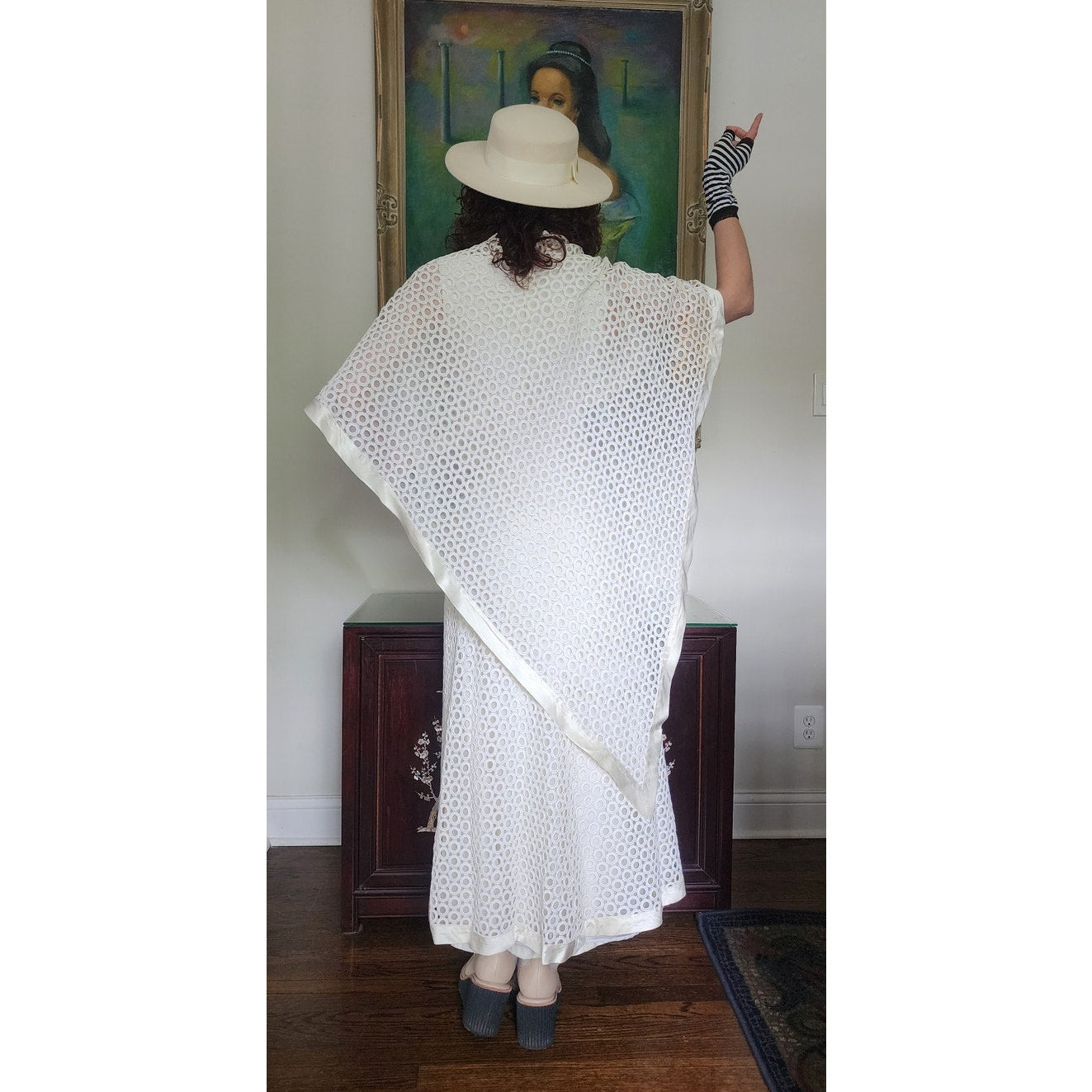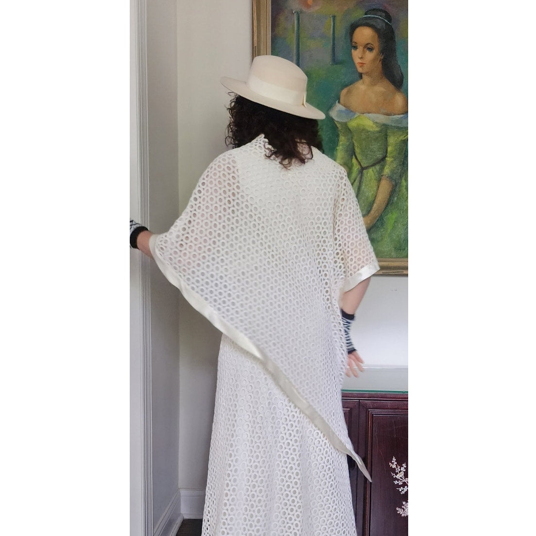 Stunning dress in openwork white cotton crochet - creating a repeated circle pattern throughout. The base/shell of this dress is a satin, sleeveless frock that is fitted at the torso and nipped at the waist with a slightly A line, ankle length skirt. The attached overlay layer is the sheer crochet with an attached capelet at the rear that hangs down towards to the bottom rear of the skirt, ending in a V shape. Satin trim along the edges of the capelet and the hem. The overall effect at front creates half-length like "sleeves". Closes with a zipper at the satin layer and snaps at the crochet layer. No tags.