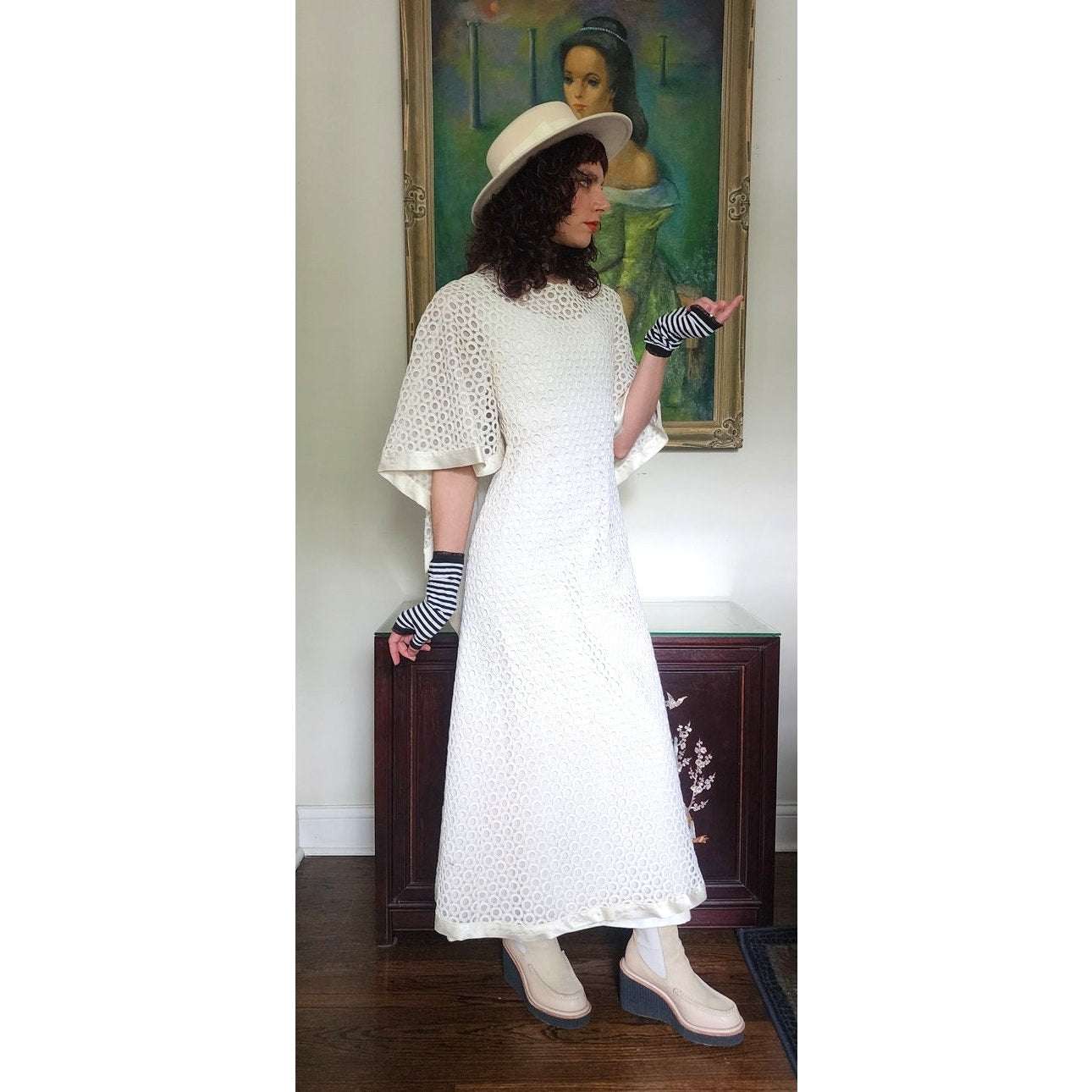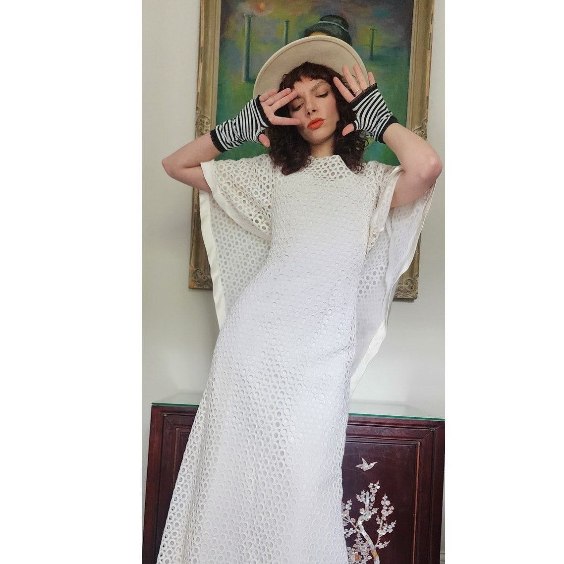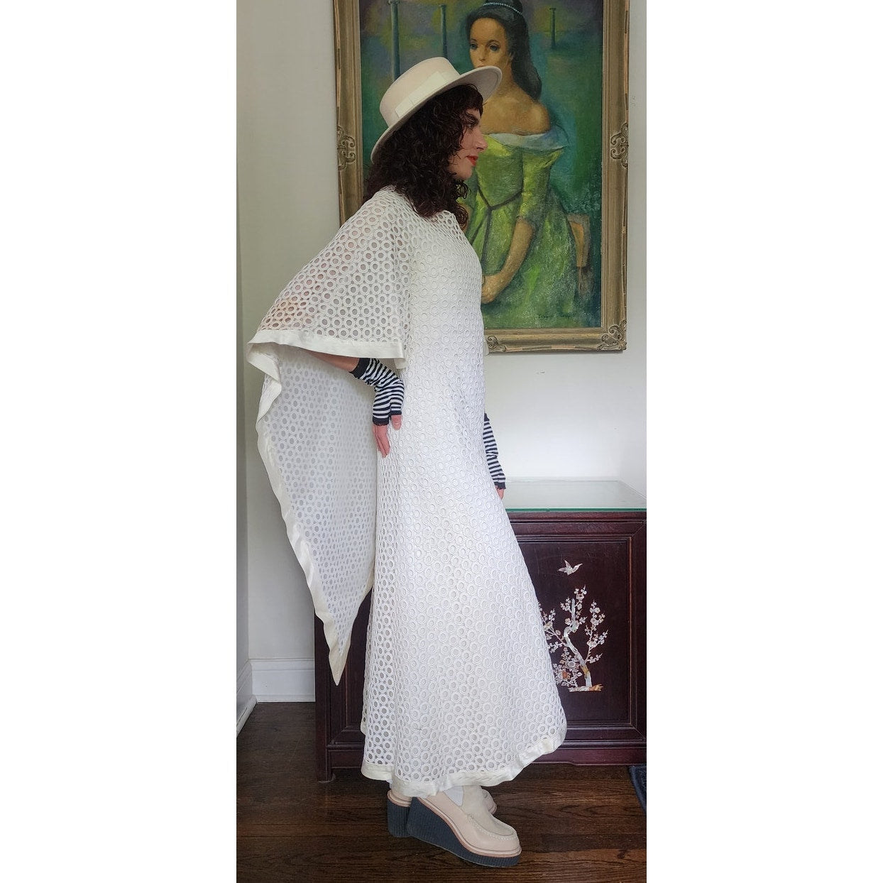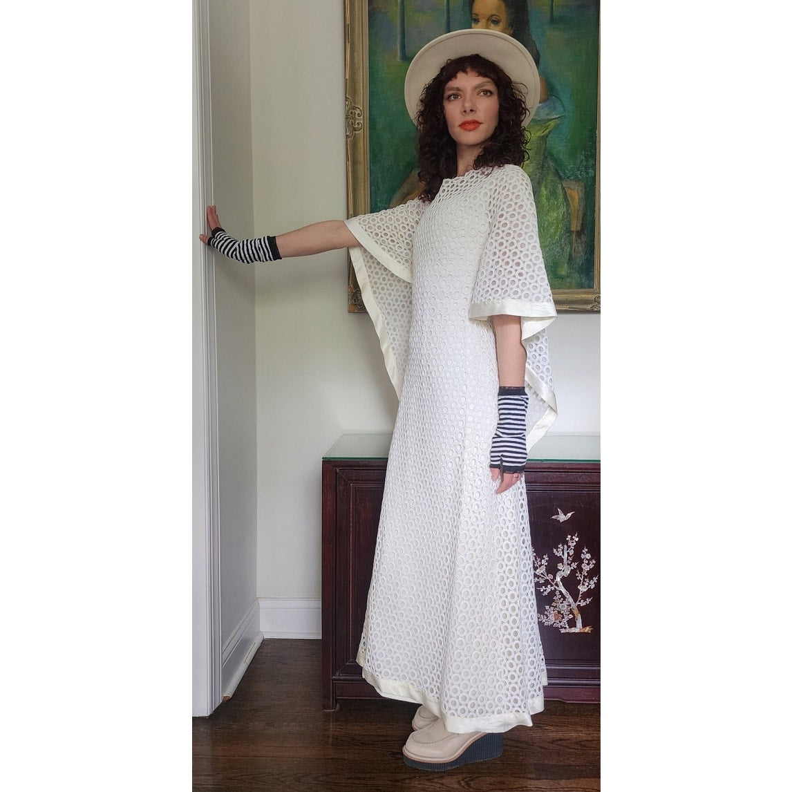 Stunning dress in openwork white cotton crochet - creating a repeated circle pattern throughout. The base/shell of this dress is a satin, sleeveless frock that is fitted at the torso and nipped at the waist with a slightly A line, ankle length skirt. The attached overlay layer is the sheer crochet with an attached capelet at the rear that hangs down towards to the bottom rear of the skirt, ending in a V shape. Satin trim along the edges of the capelet and the hem. The overall effect at front creates half-length like "sleeves". Closes with a zipper at the satin layer and snaps at the crochet layer. No tags.