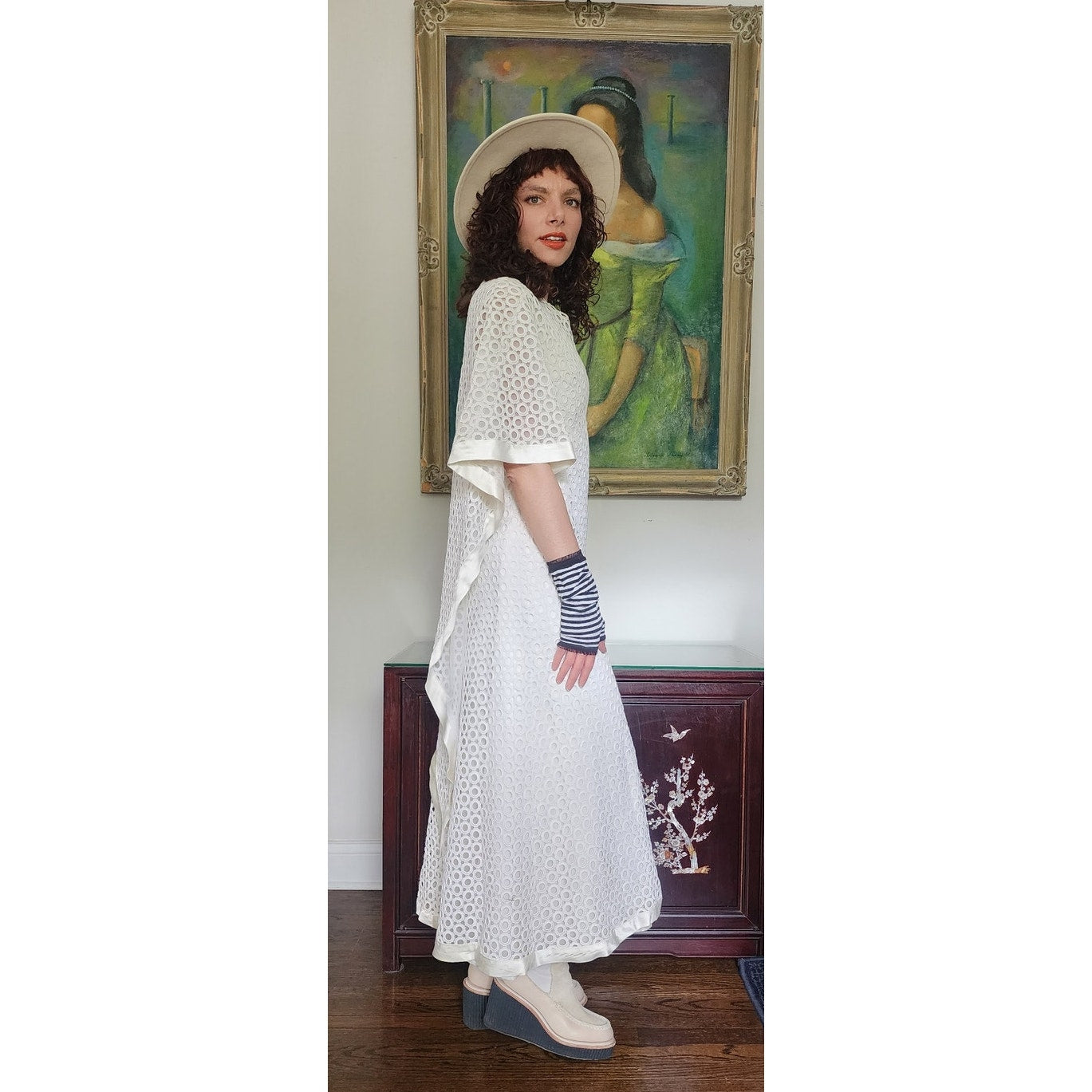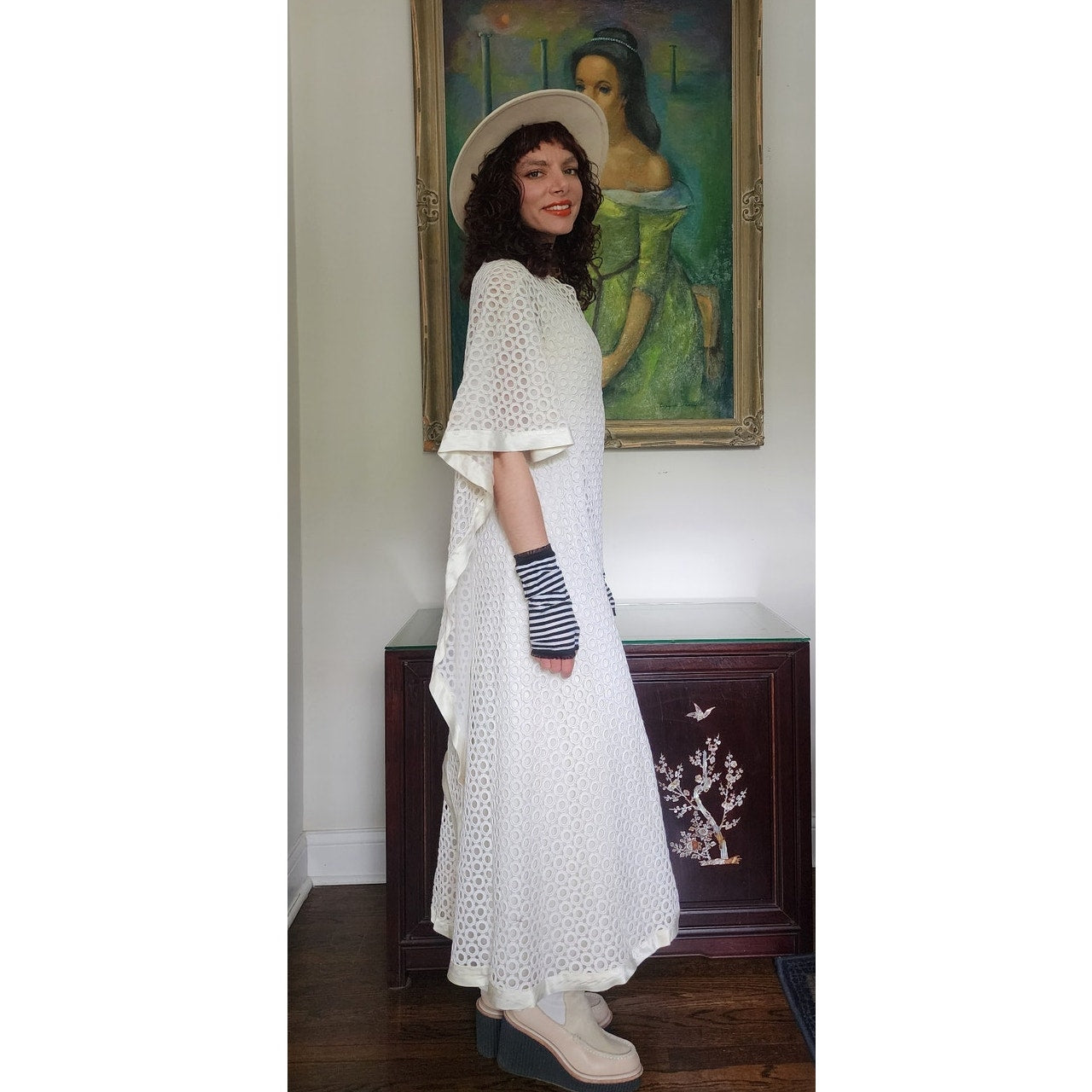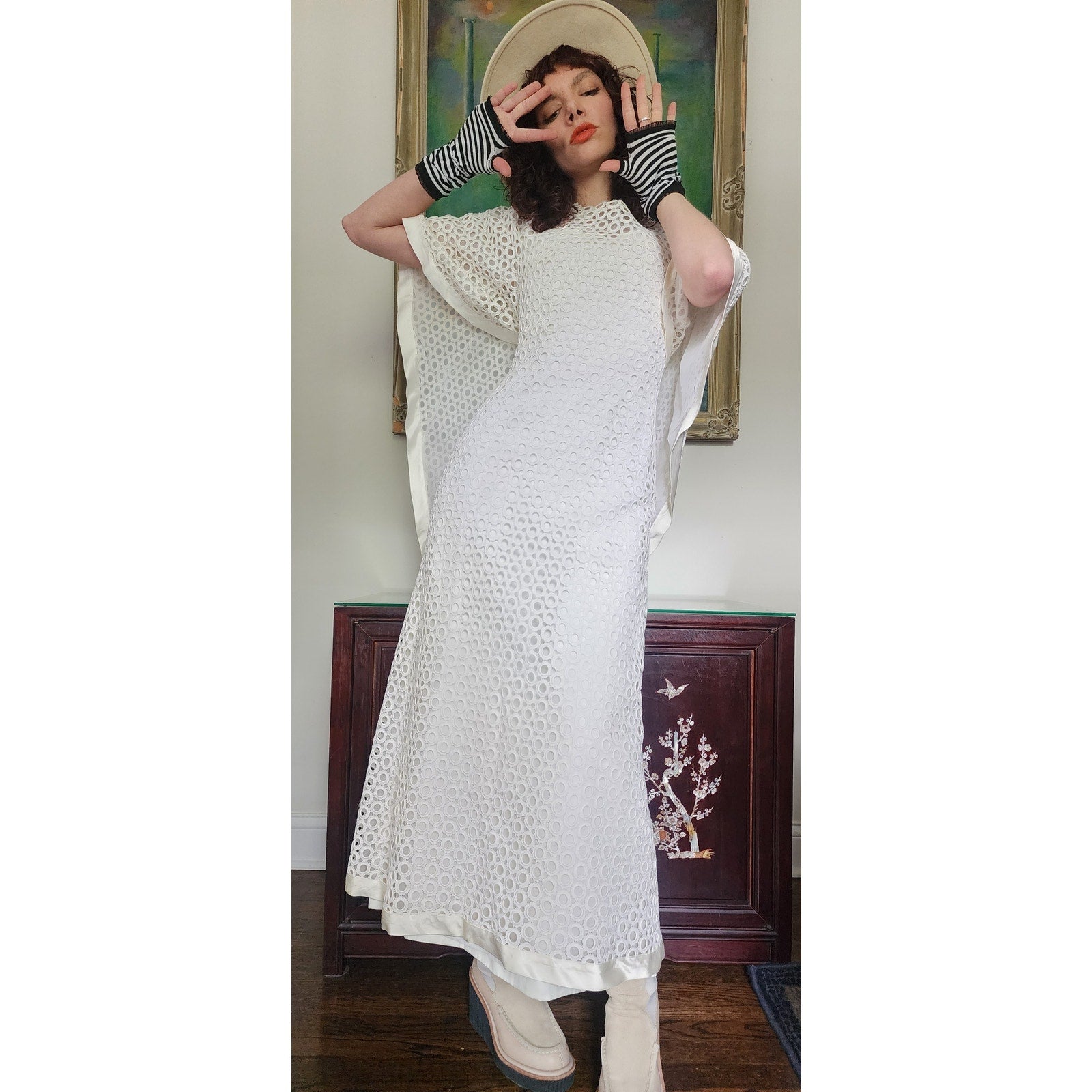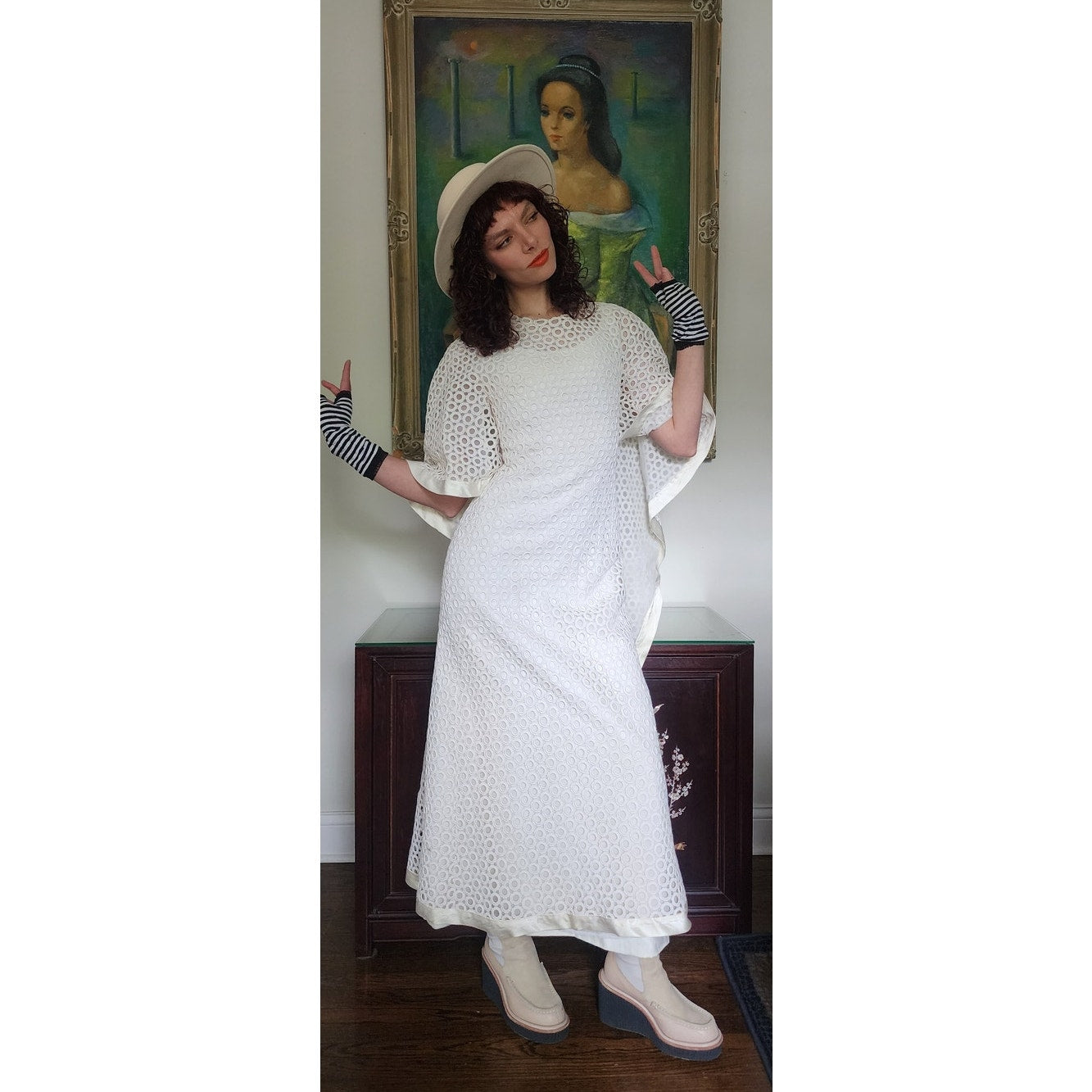 Stunning dress in openwork white cotton crochet - creating a repeated circle pattern throughout. The base/shell of this dress is a satin, sleeveless frock that is fitted at the torso and nipped at the waist with a slightly A line, ankle length skirt. The attached overlay layer is the sheer crochet with an attached capelet at the rear that hangs down towards to the bottom rear of the skirt, ending in a V shape. Satin trim along the edges of the capelet and the hem. The overall effect at front creates half-length like "sleeves". Closes with a zipper at the satin layer and snaps at the crochet layer. No tags.