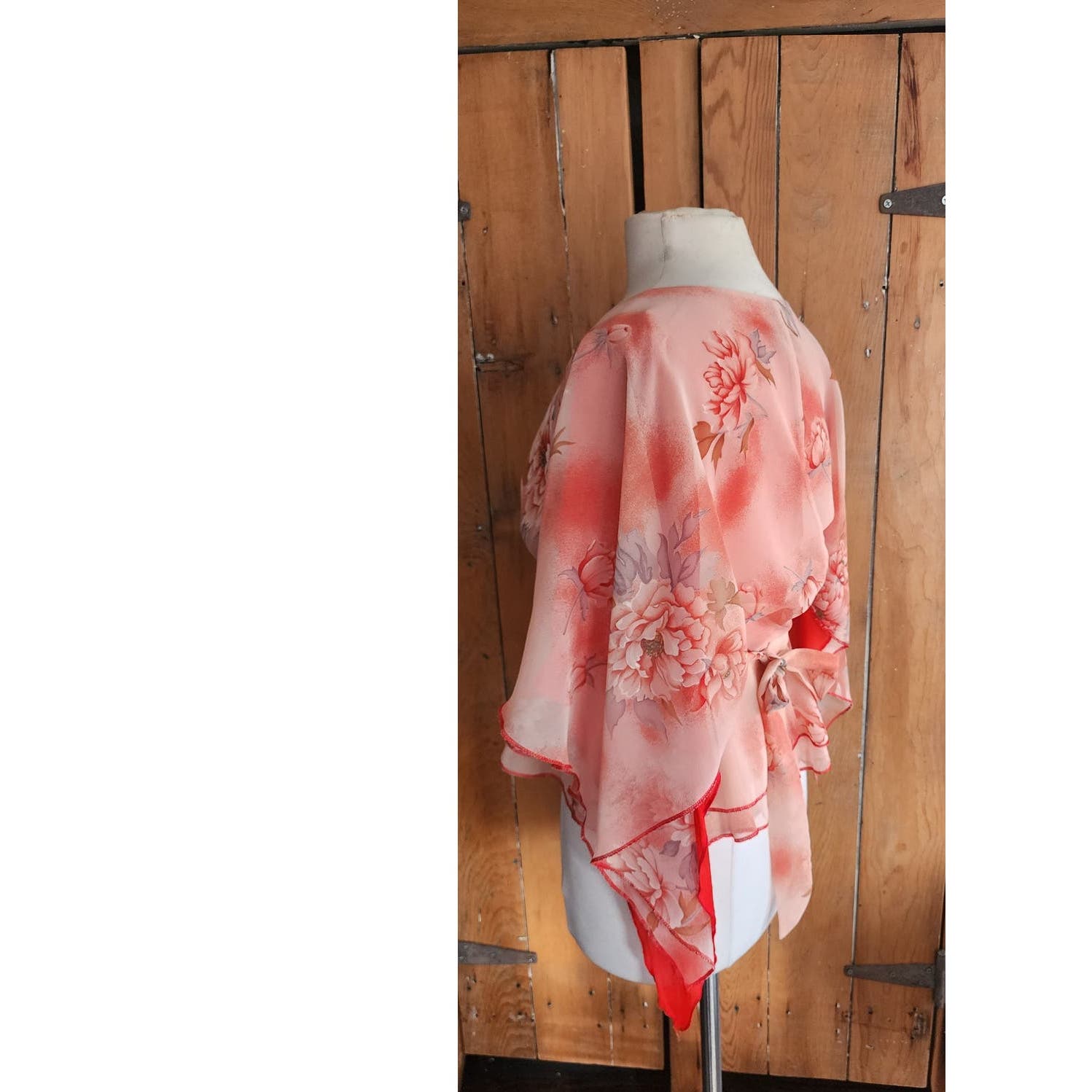 Collarless, this flouncy blouse features a wrap style closure with sash ties that meet in a knot, in matching fabric. Long and dramatic butterfly sleeves create a boho-witchy vibe and the hip area is decorated with a "peplum" effect over the hips. Fully lined. Gorgeous peach and red floral print creates a very romantic mood!