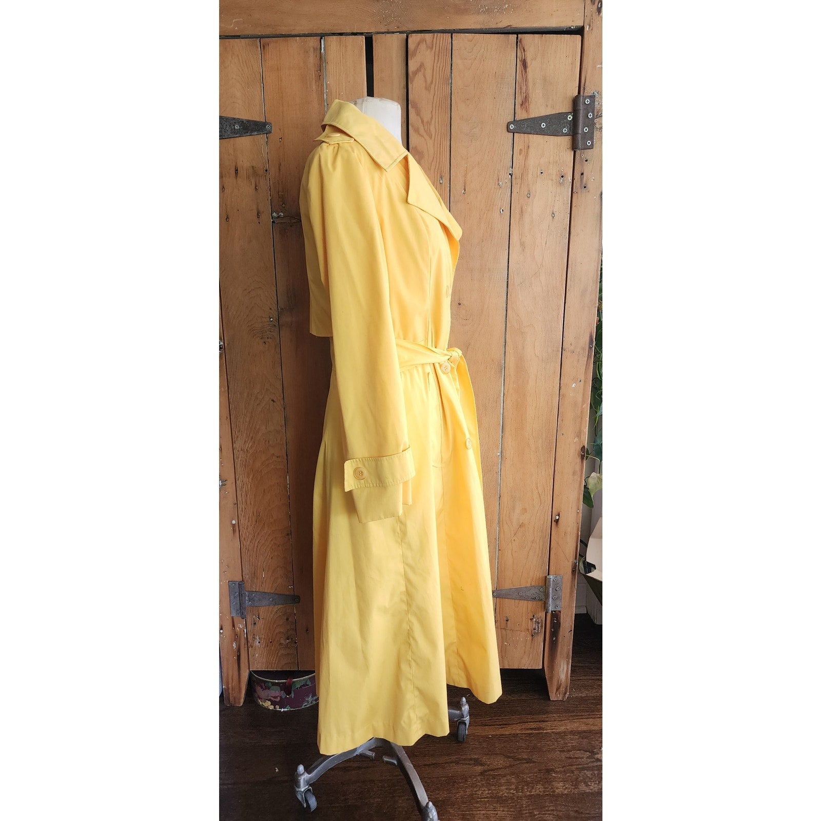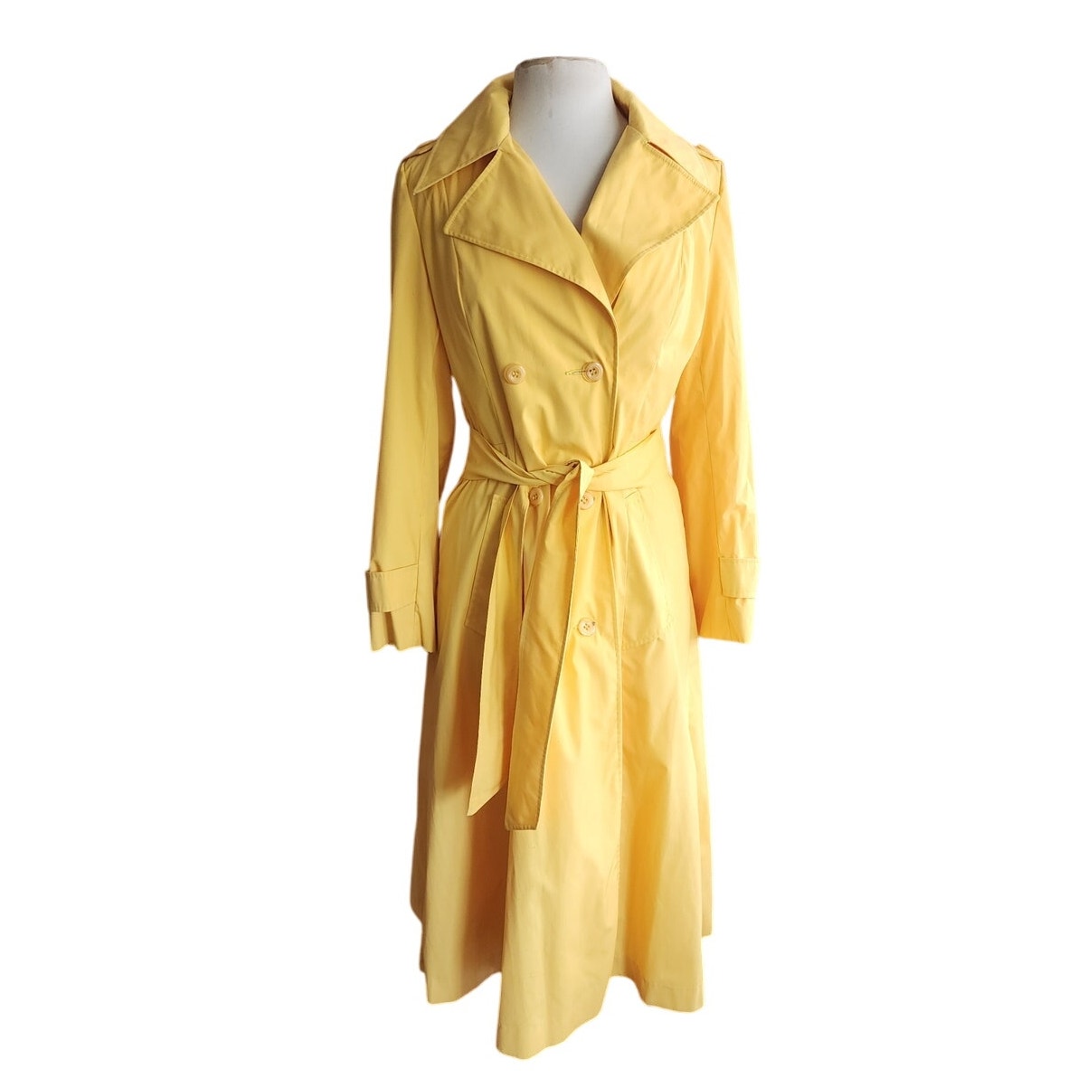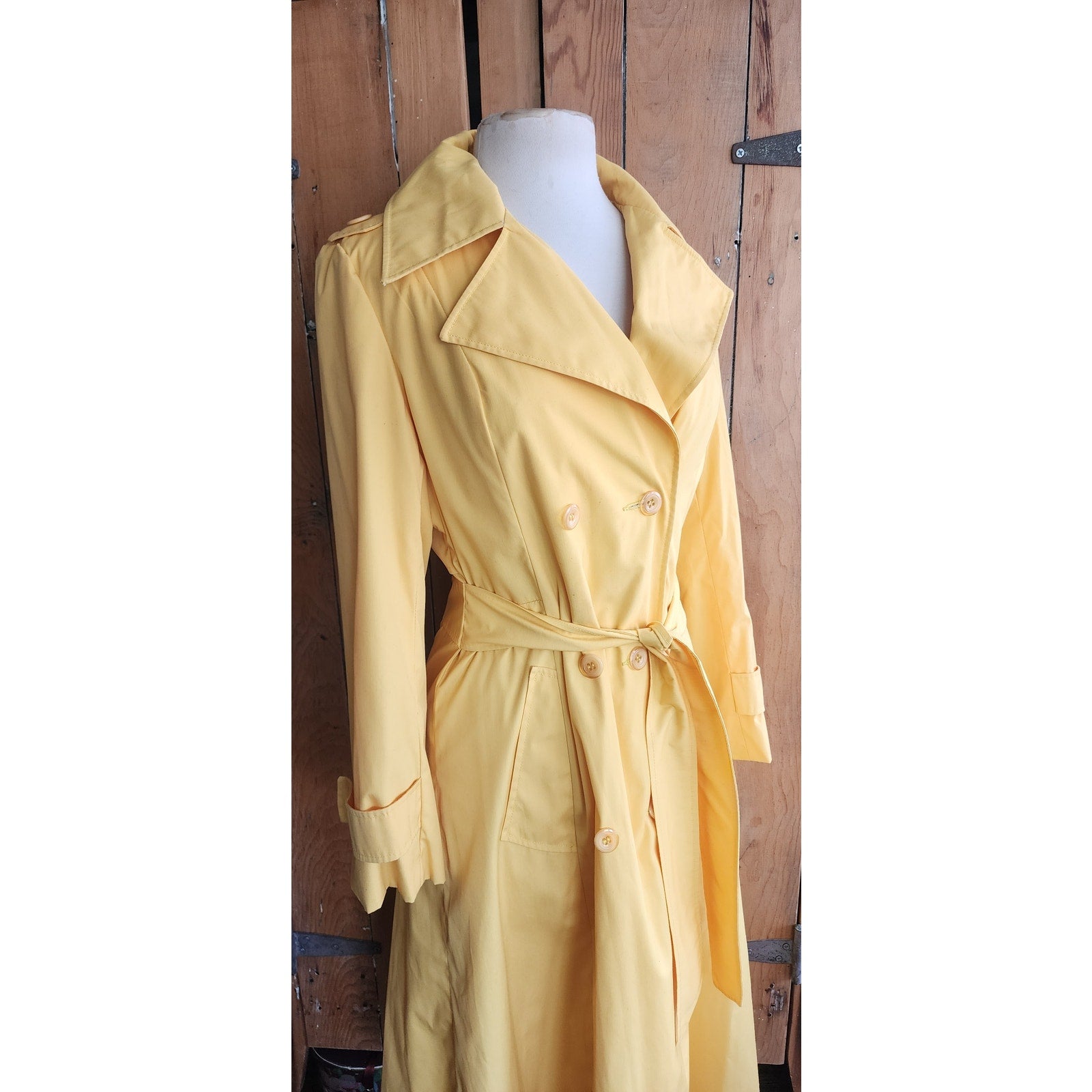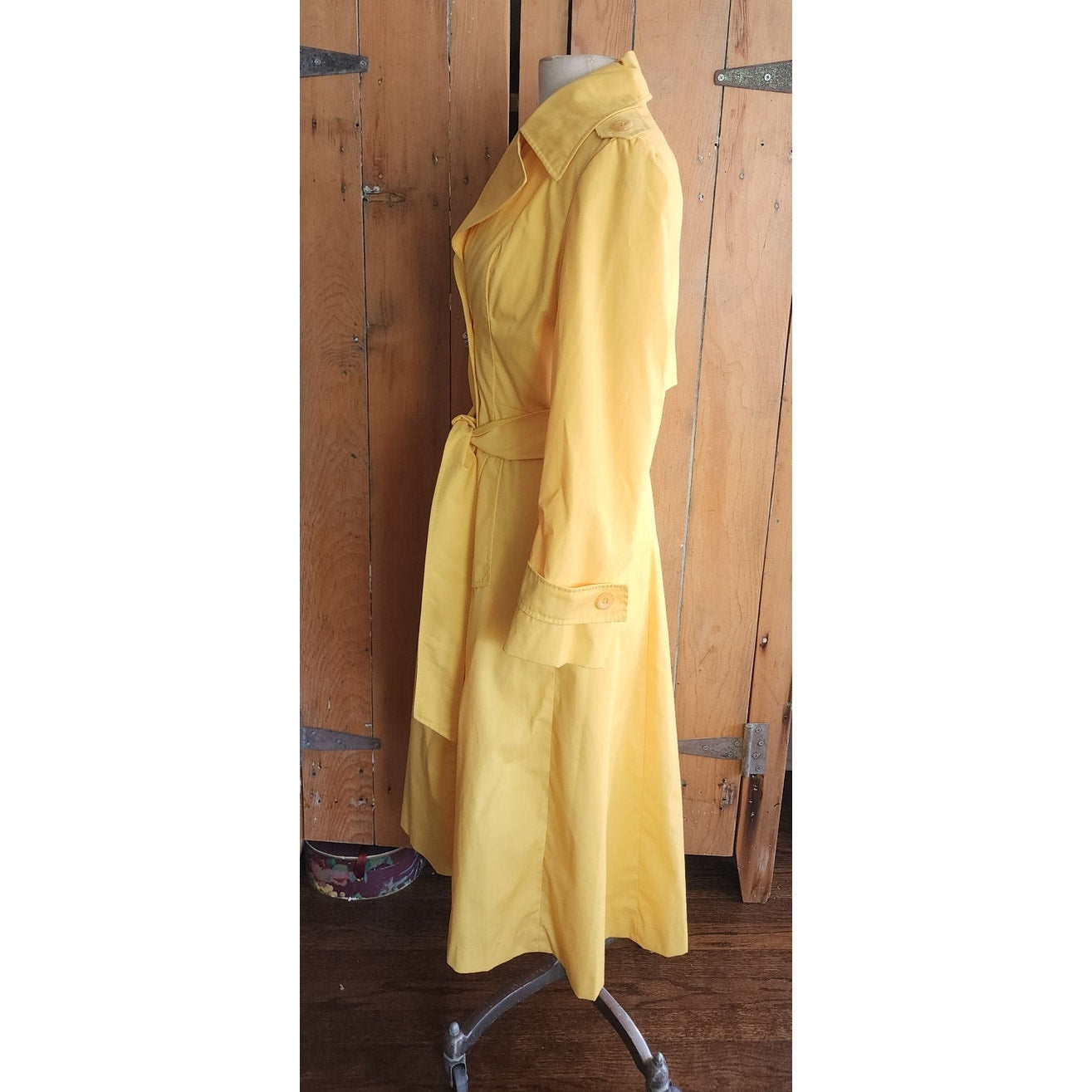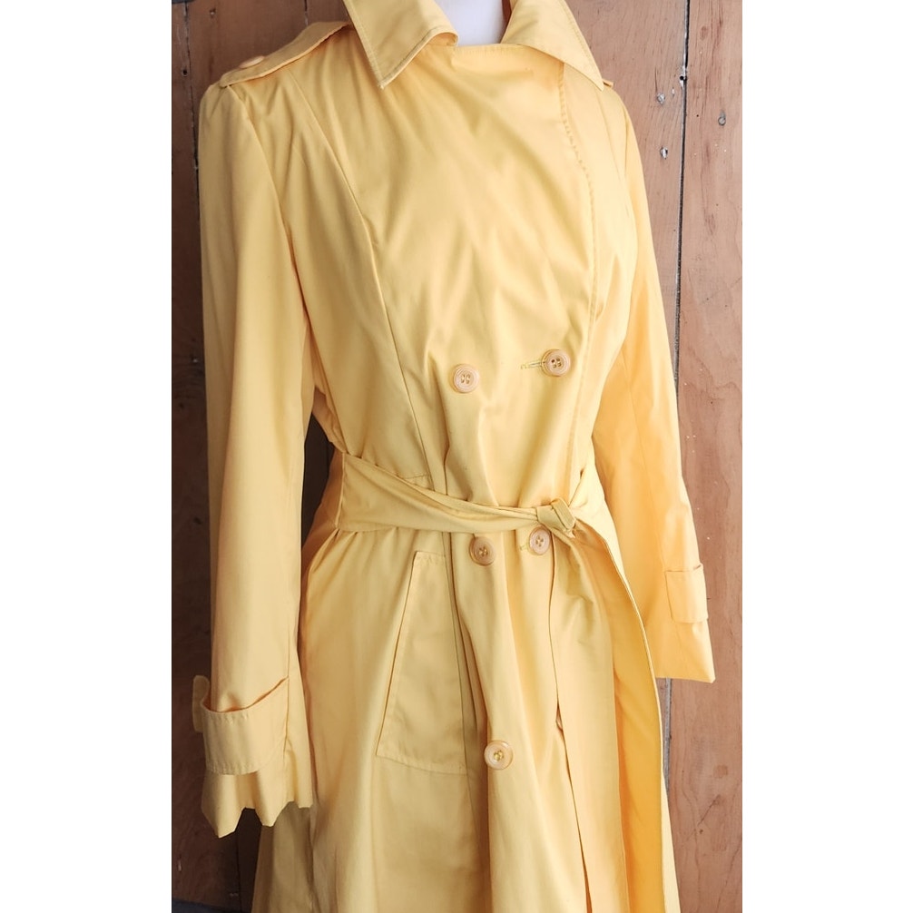 Classic belted trench with double breasted closure, a fold down collar and hip pockets. Epaulettes at the shoulders and buttoned sleeve cuffs complete the look. Fully lined. No tags. No frills. But very yellow!