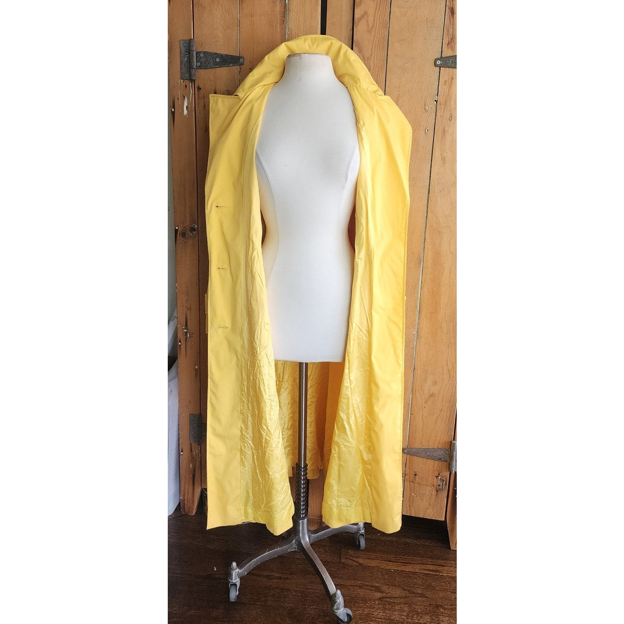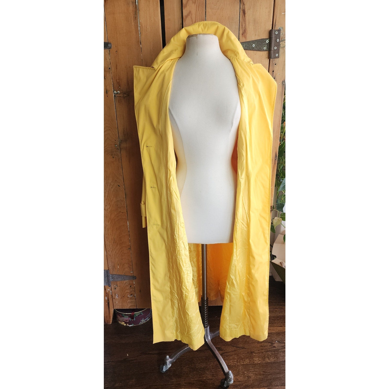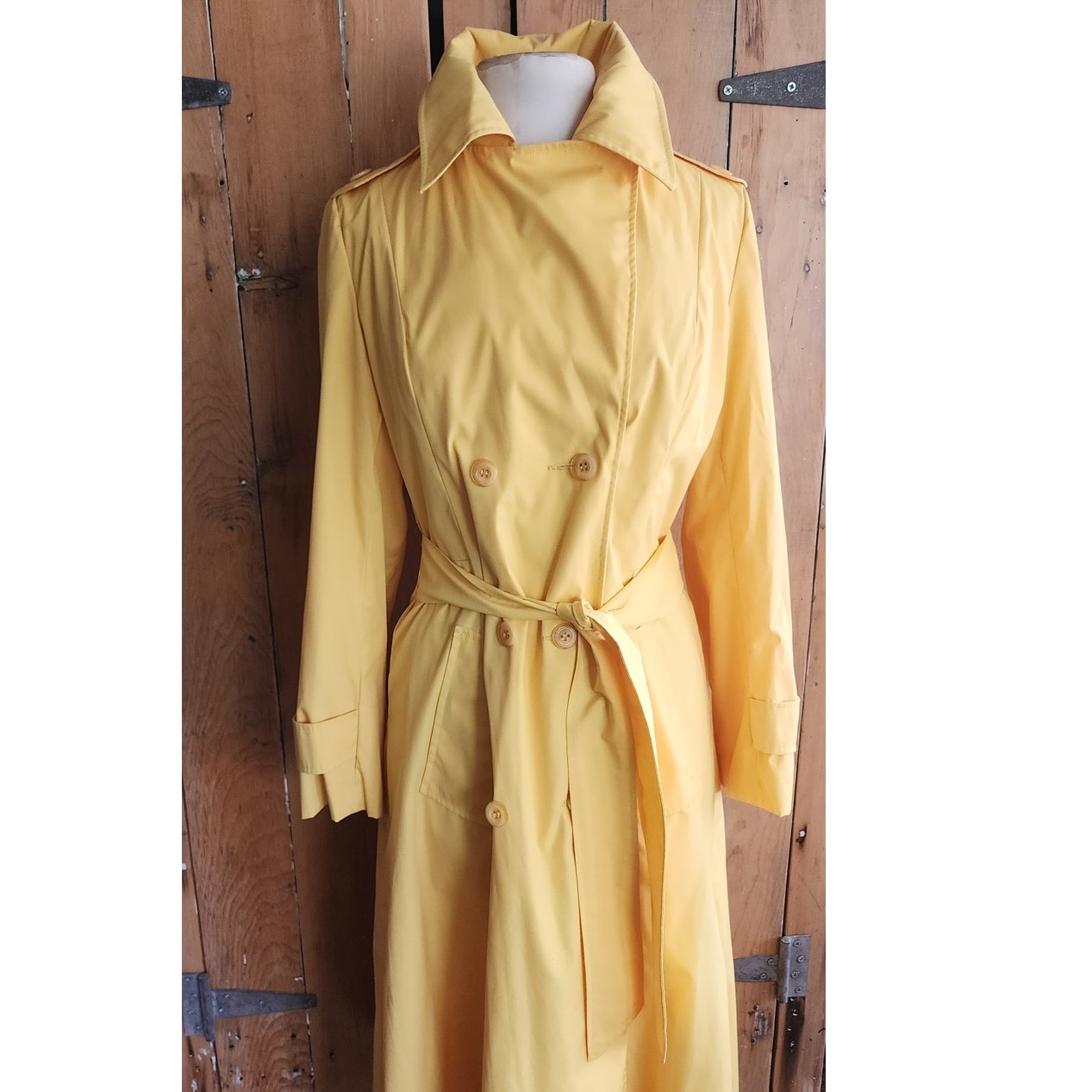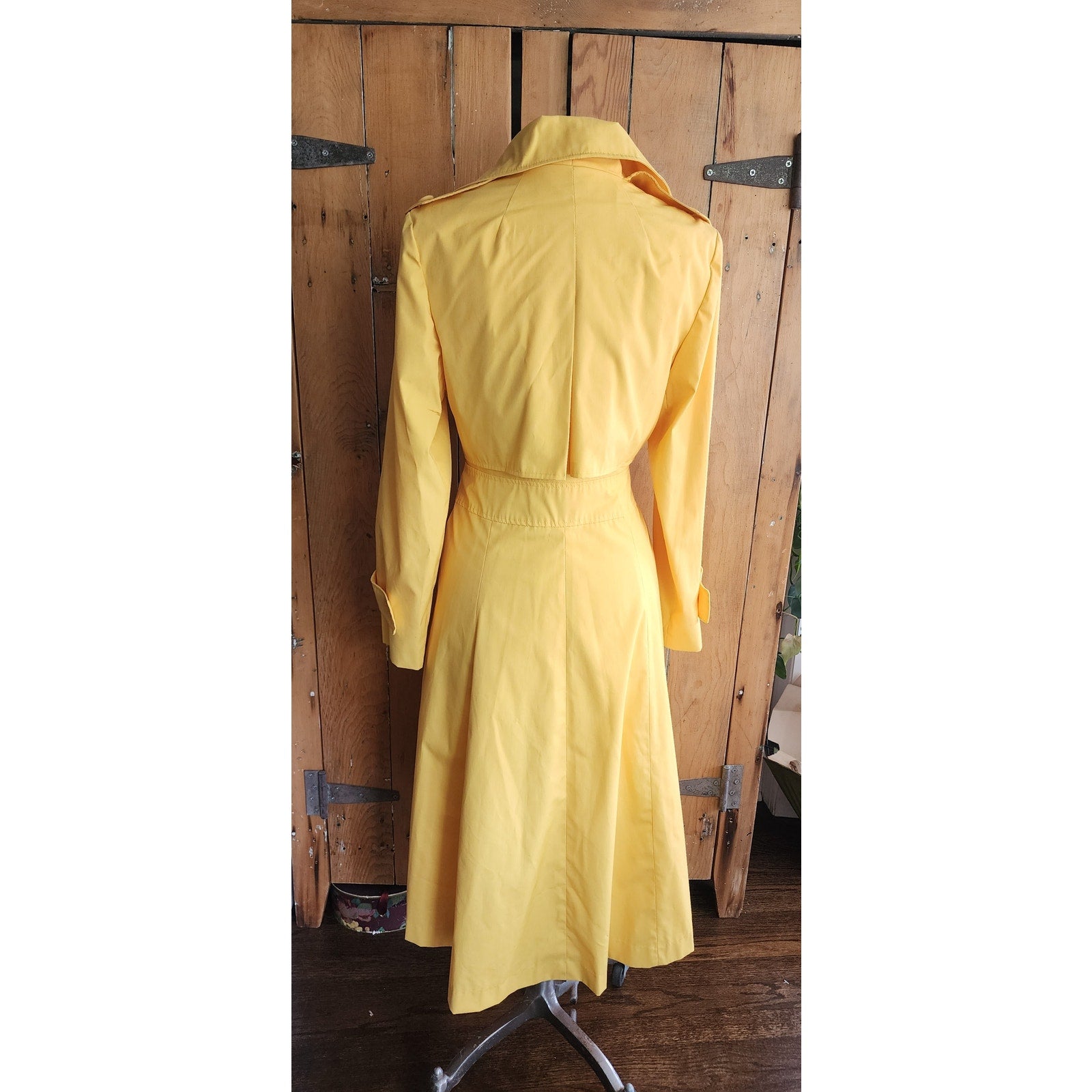 Classic belted trench with double breasted closure, a fold down collar and hip pockets. Epaulettes at the shoulders and buttoned sleeve cuffs complete the look. Fully lined. No tags. No frills. But very yellow!