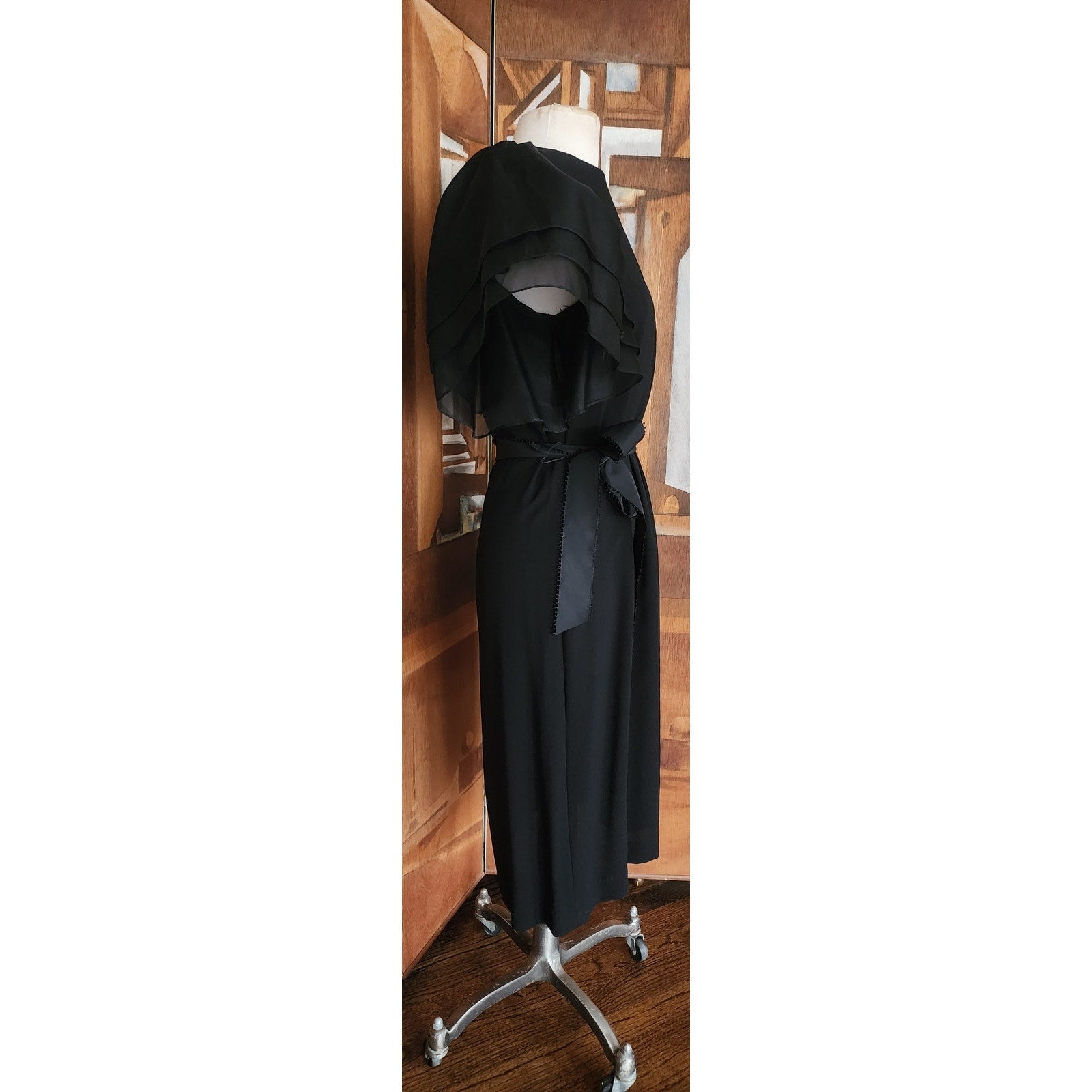 Features dramatic, structured, short puffed sleeves in organza contrasting with the main body material. Collarless, it has a fitted waist with a matching sash tie, creating an A-line or sheath silhouette that falls to a midi length. It presents as a classic designer LBD (little black dress) with a timeless aesthetic. Closes with a zipper. Fully lined.