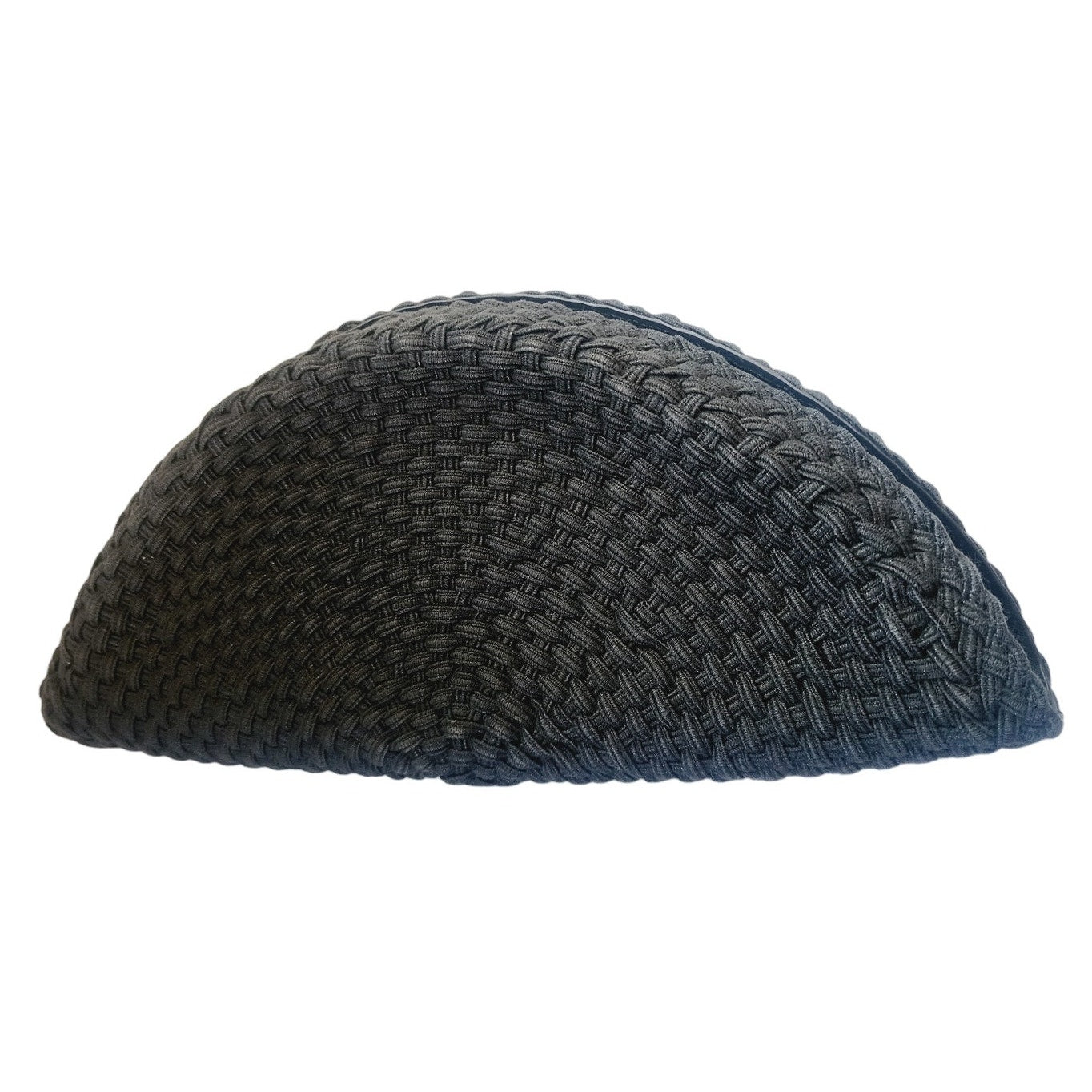 This crescent shaped clutch is made of a shiny black fabric (likely cotton) that is braided in an ornate and visually stunning pattern. Closes at the top with a curved zipper featuring a fun, chunky silver pull tab as pictured. Interior is lined and has 1 zippered pocket.