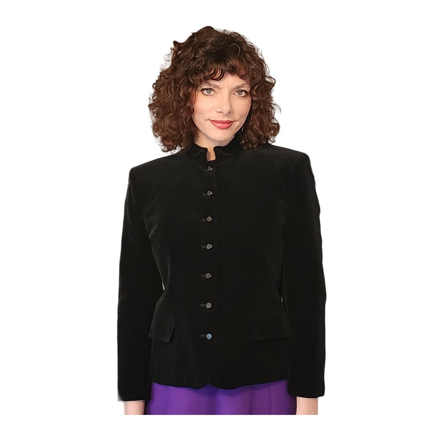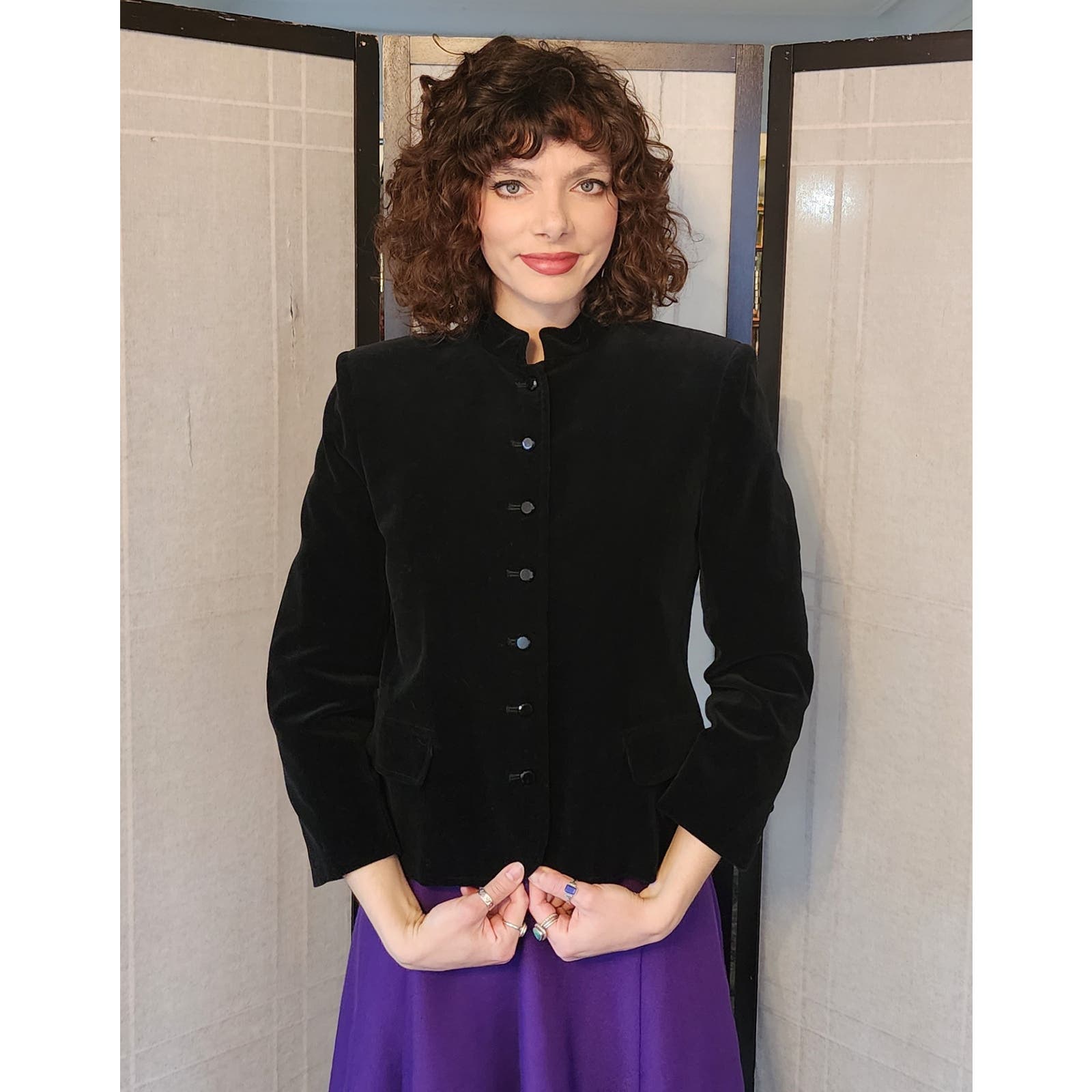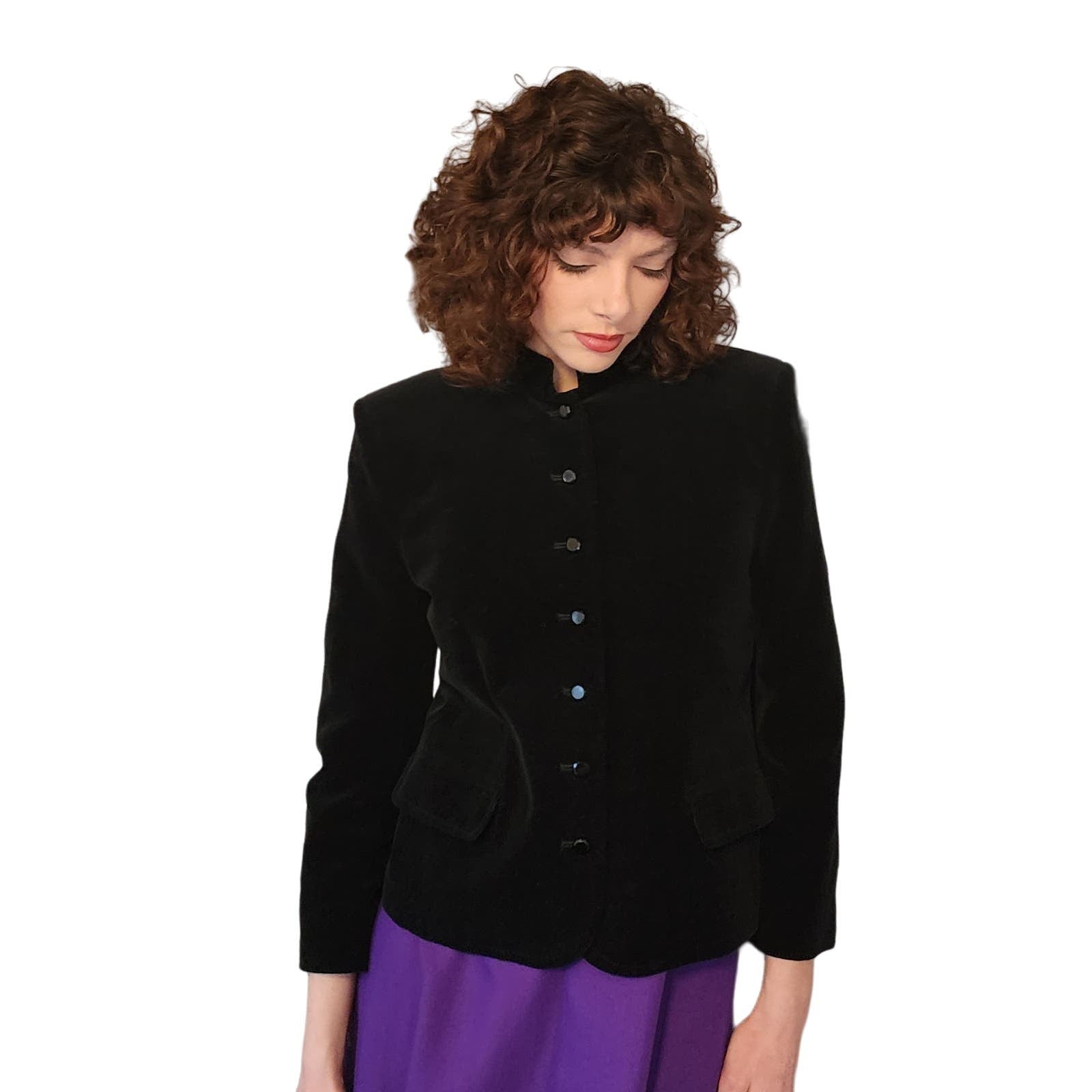 Boxy with sparkly, beveled buttons down the front for closure, this jacket features a mock turtleneck collar, shoulder pads, and flap pockets at the hip fronts. Fully lined at the interior.