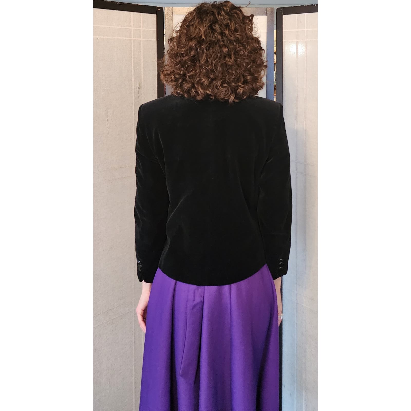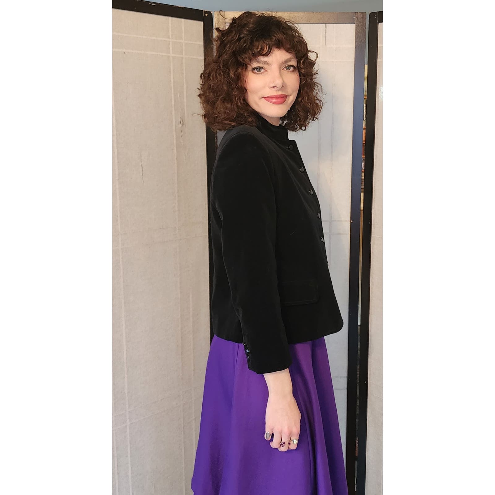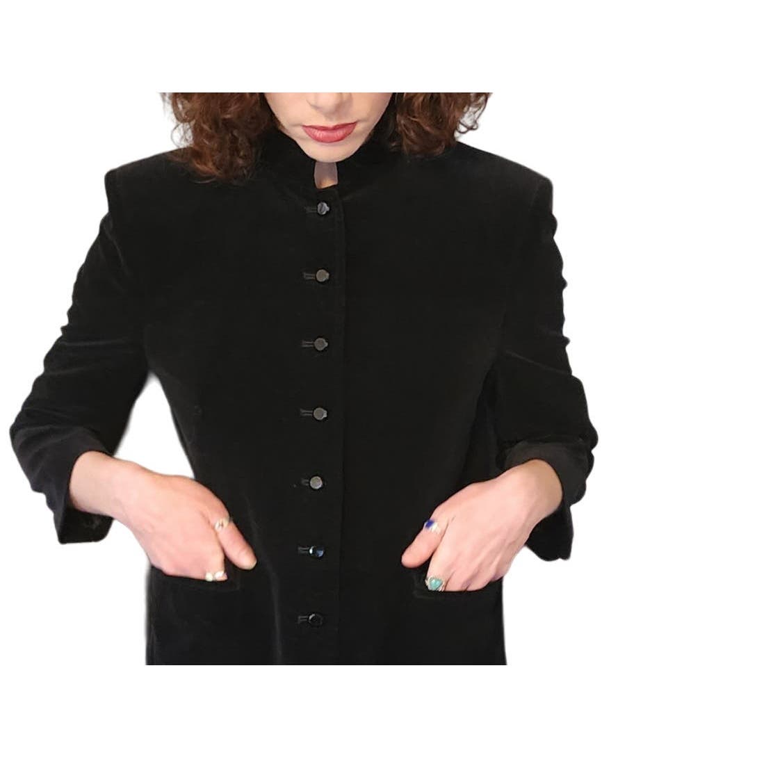 Boxy with sparkly, beveled buttons down the front for closure, this jacket features a mock turtleneck collar, shoulder pads, and flap pockets at the hip fronts. Fully lined at the interior.