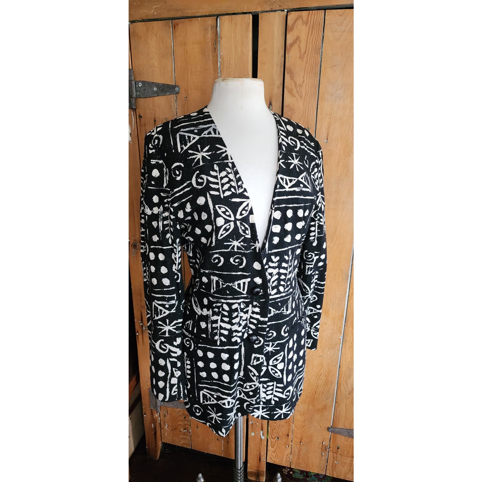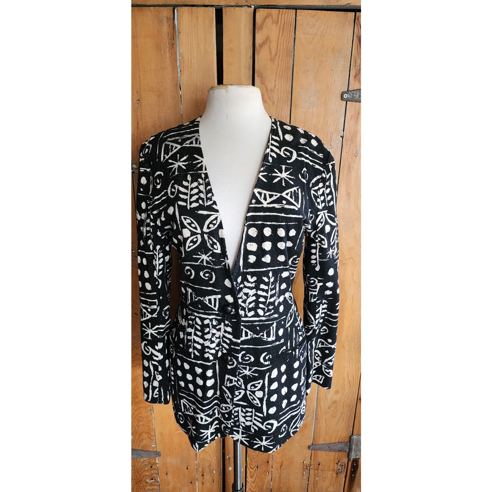 Vintage 80s Blazer Black White Bold Graphic Print Raw Silk