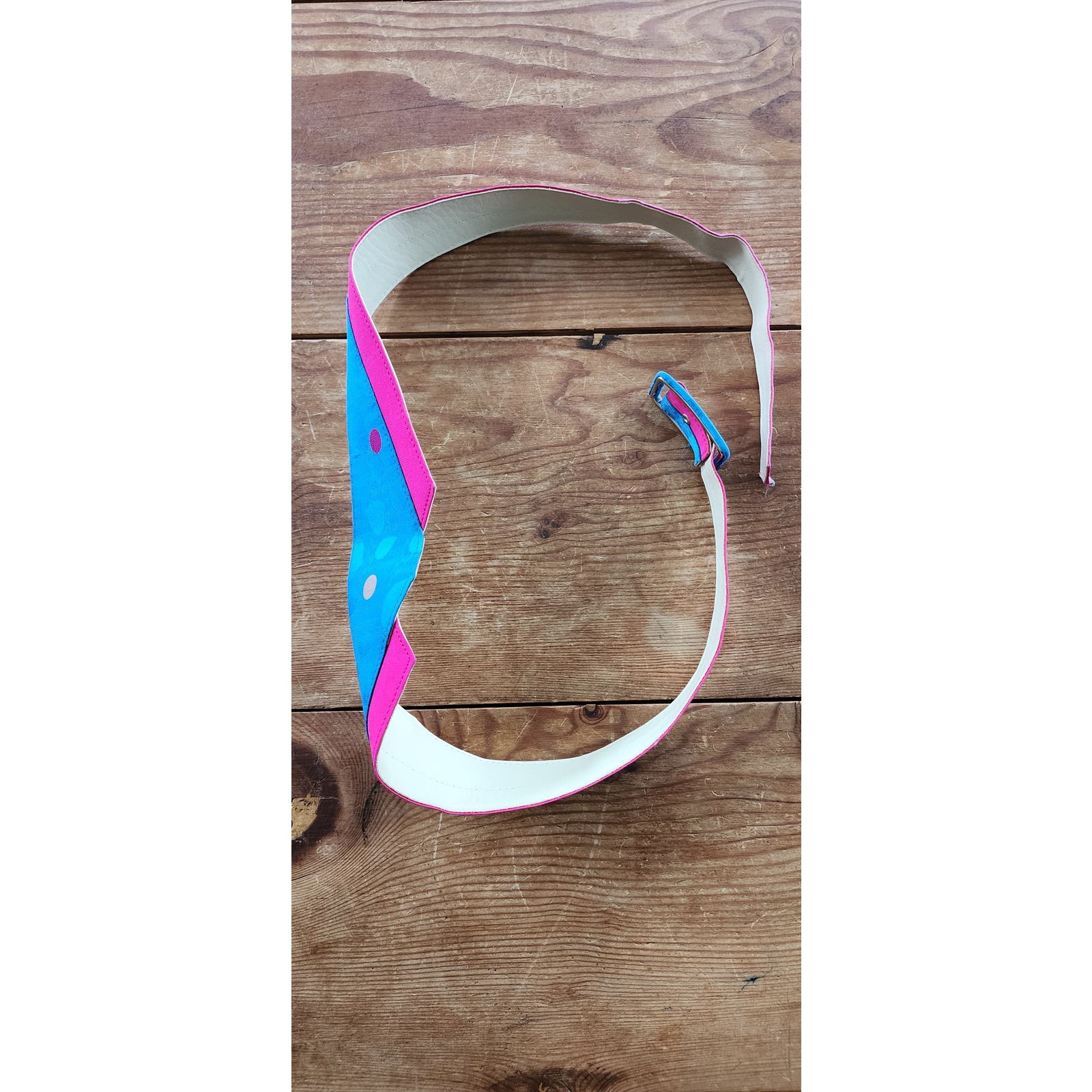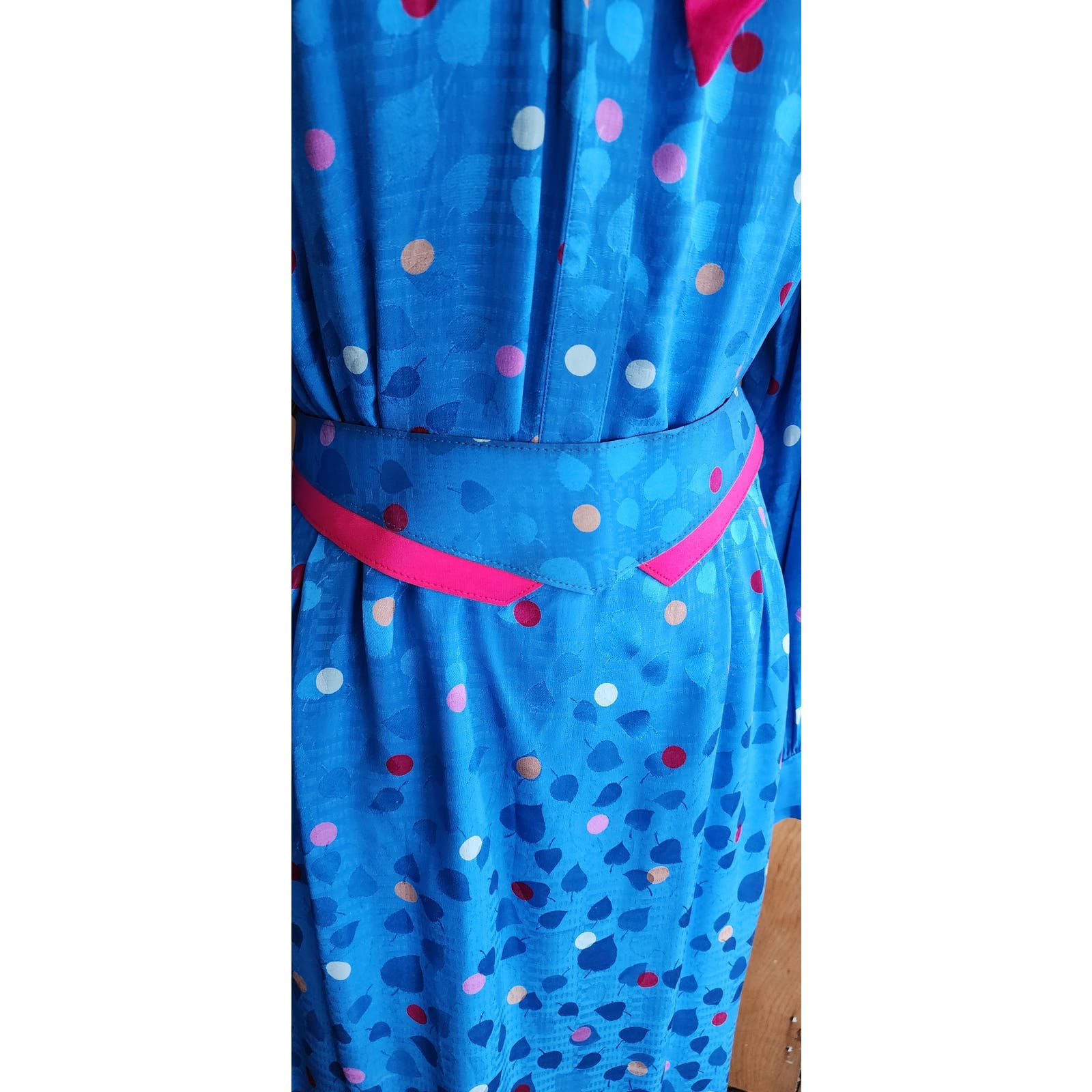 Pulls on overhead, this beauty has a blue silk background with a print featuring darker blue leaves or petals, and colorful polkadots in red, pink, white, and gold. It features a button down front from neck to waist and long sleeves with button cuffs. . Shoulders are lightly padded and there is a matching, printed belt that adjusts at the waist at rear. There is a pink sash tie that can serve as a pussycat bow at the neck. If you want to change up the look, see our collage in the first picture, where we used the neck tie as a bow, instead of the matching printed belt. Mix and match to suit your taste! There are slit pockets at each hip front.
