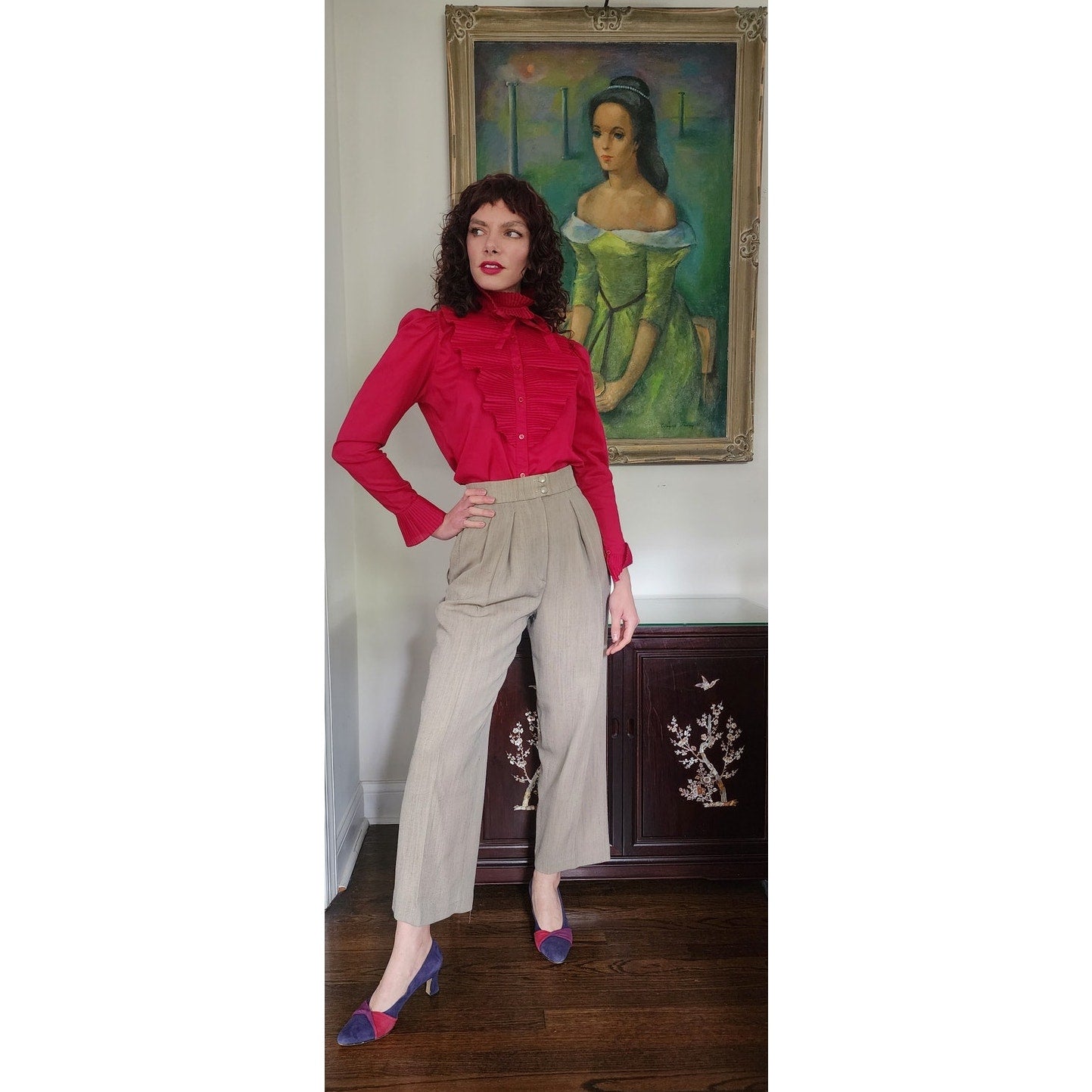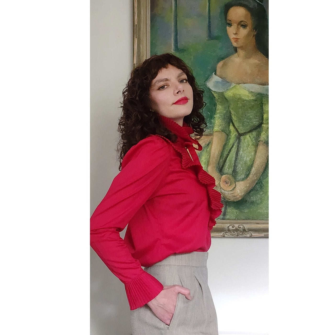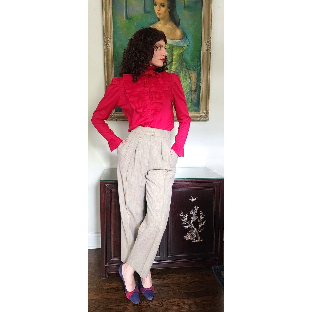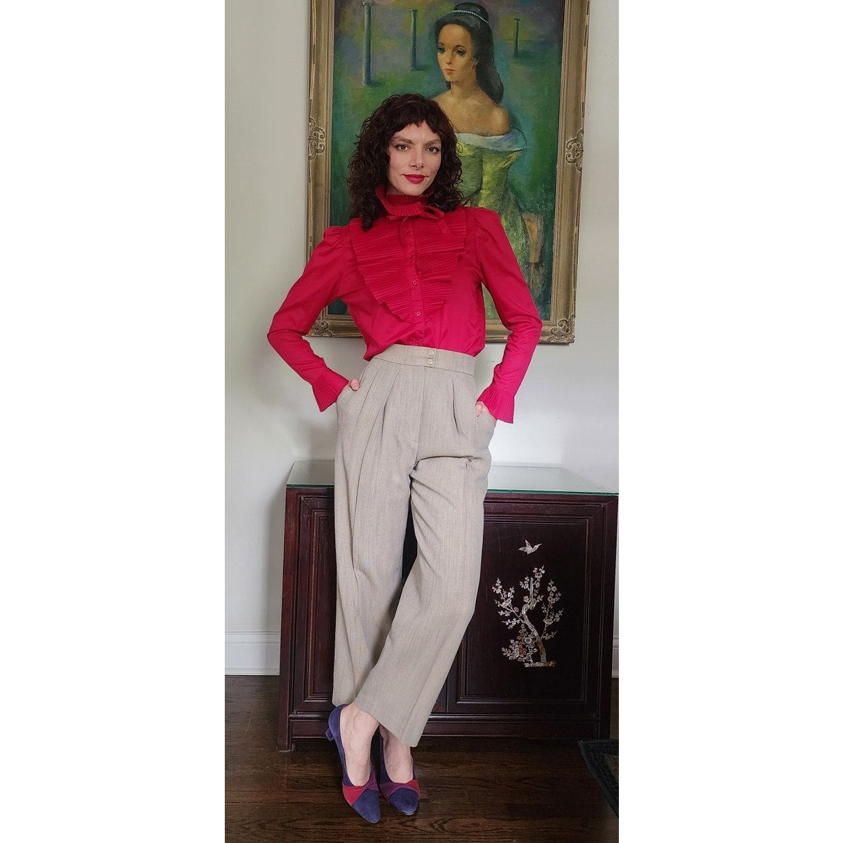 Vintage 80s Fuschia Blouse Ruffled Front Shirt