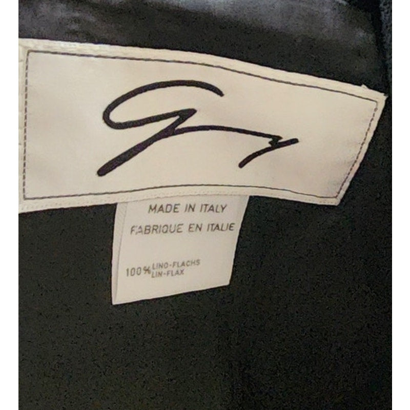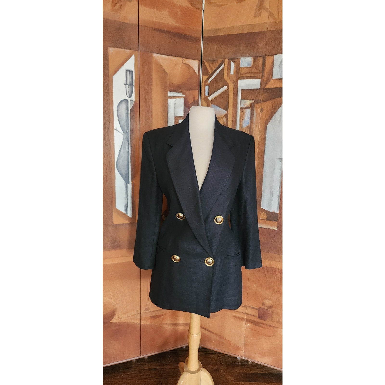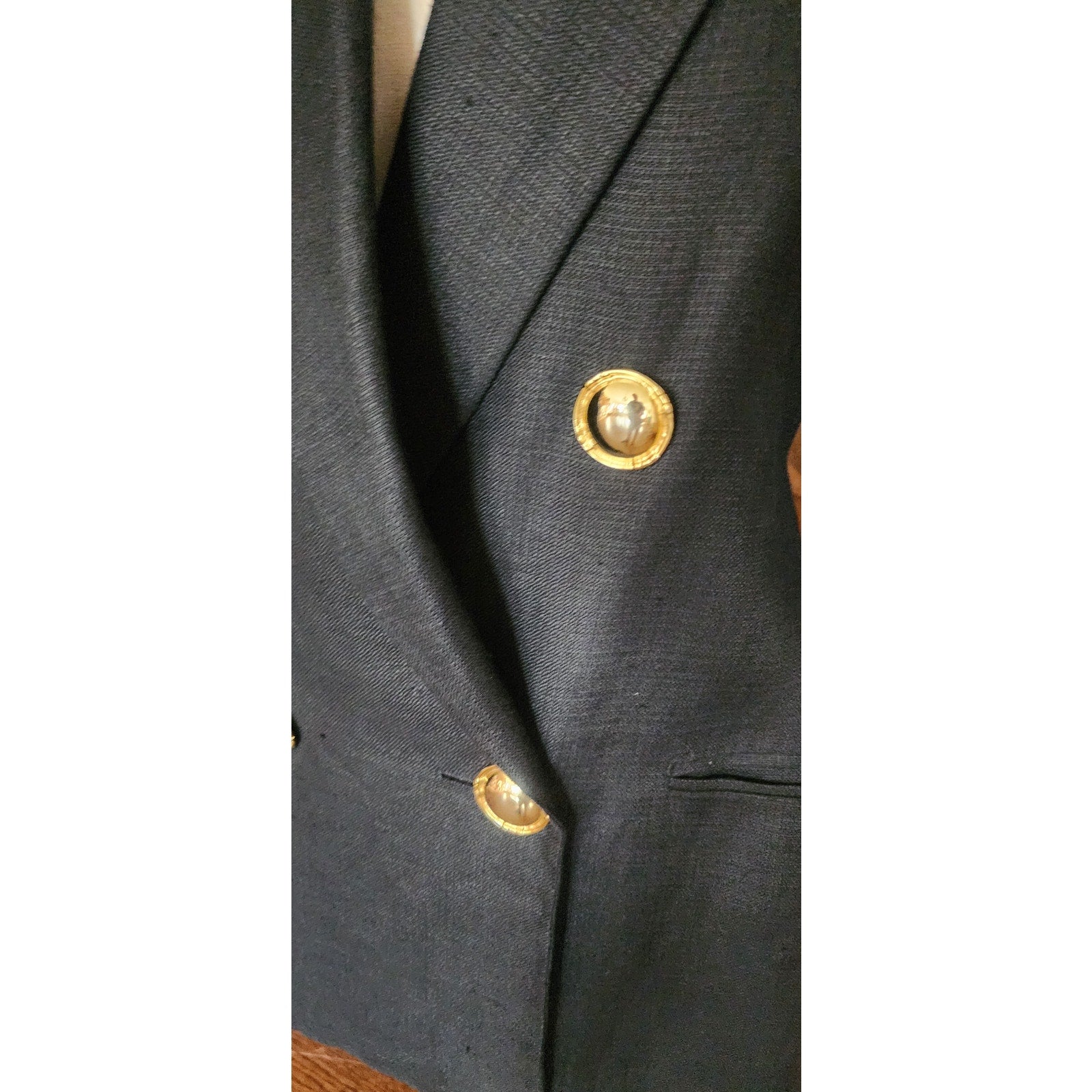 Vintage 80s GENNY Blazer Black Linen Jacket Hip Length Double Breasted Gold Buttons