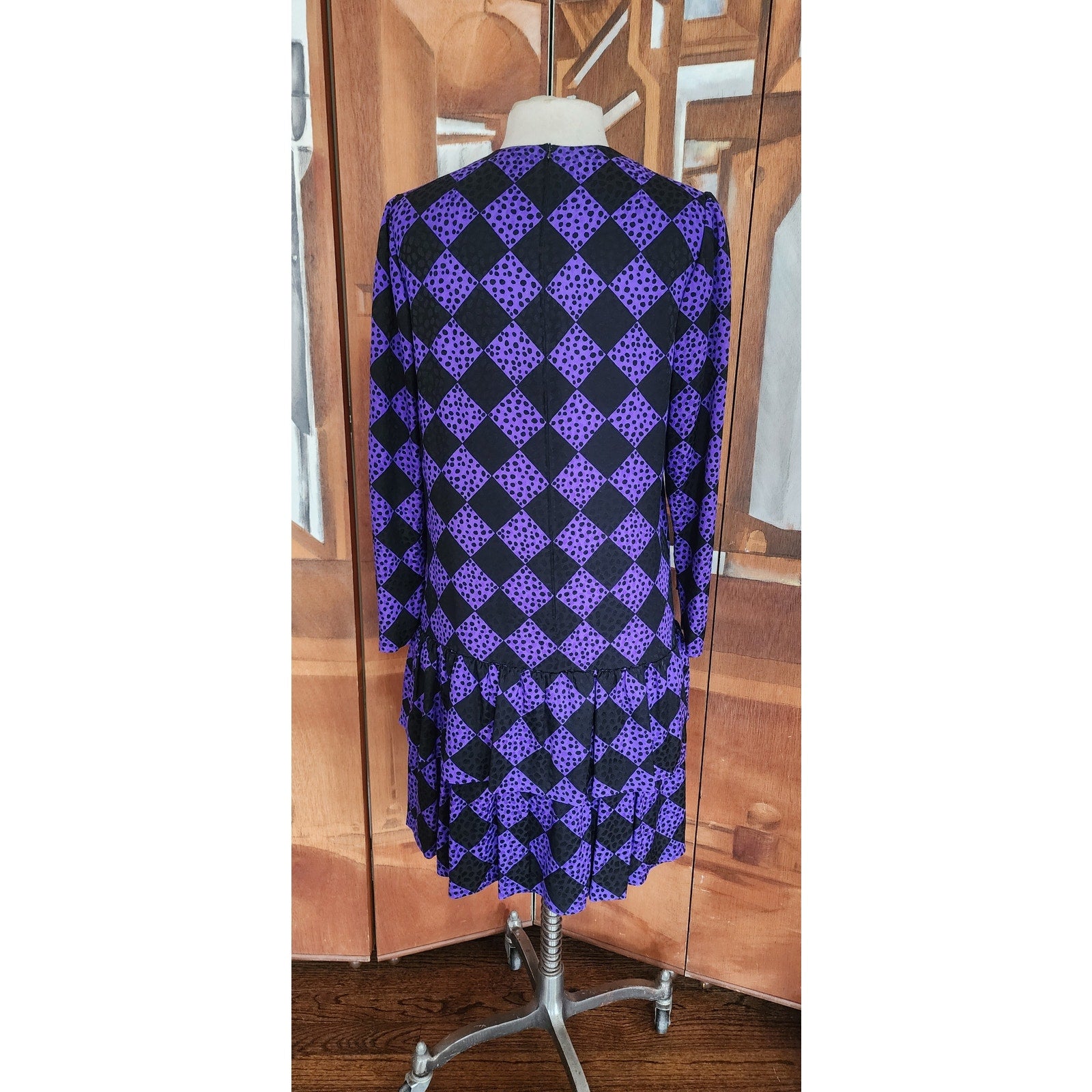 Vintage 80s GIVENCHY Silkprint Dress Purple Black Harlequin Diamonds Long Sleeved