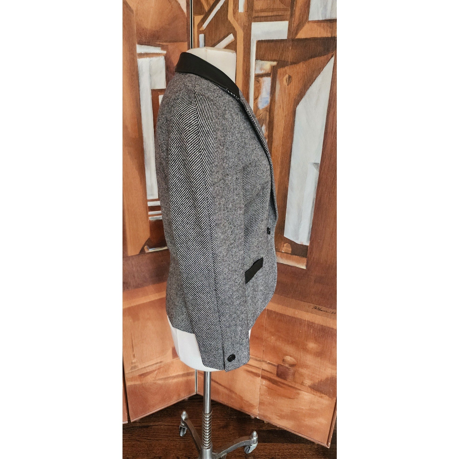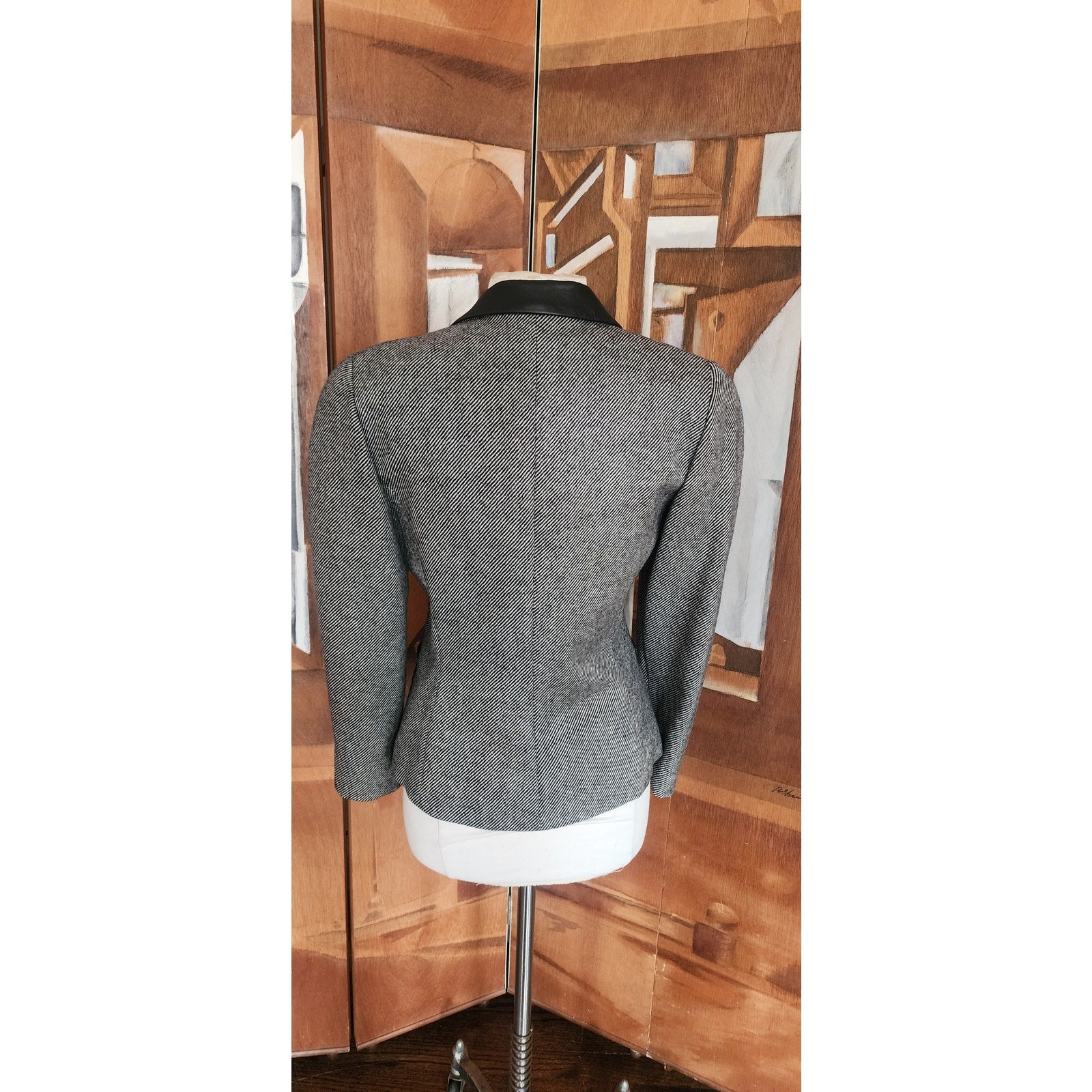 Vintage 80s GUY LAROCHE Gray Tweed Blazer Black Leather Collar / M