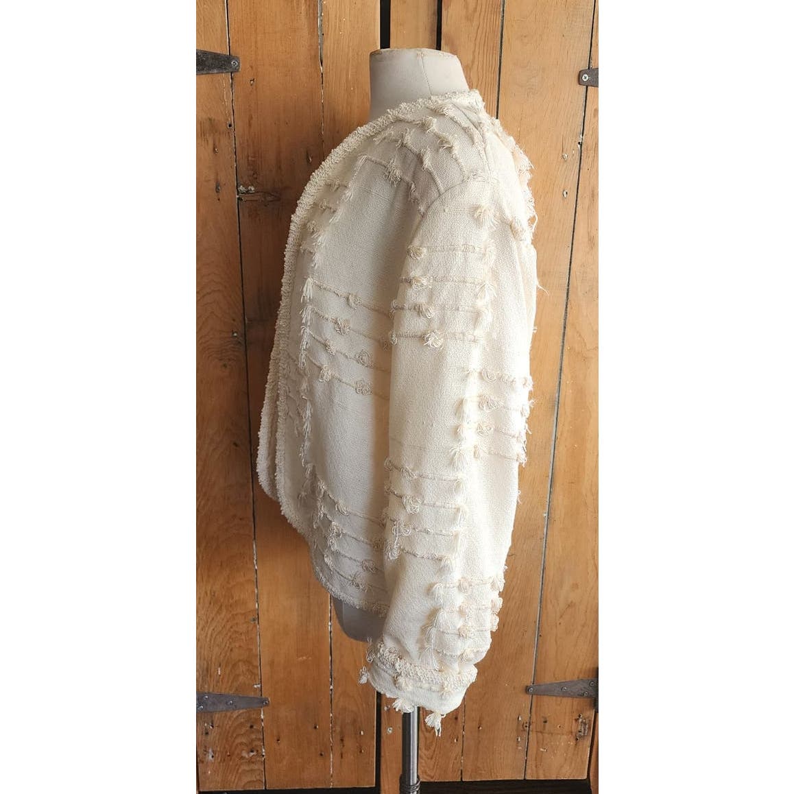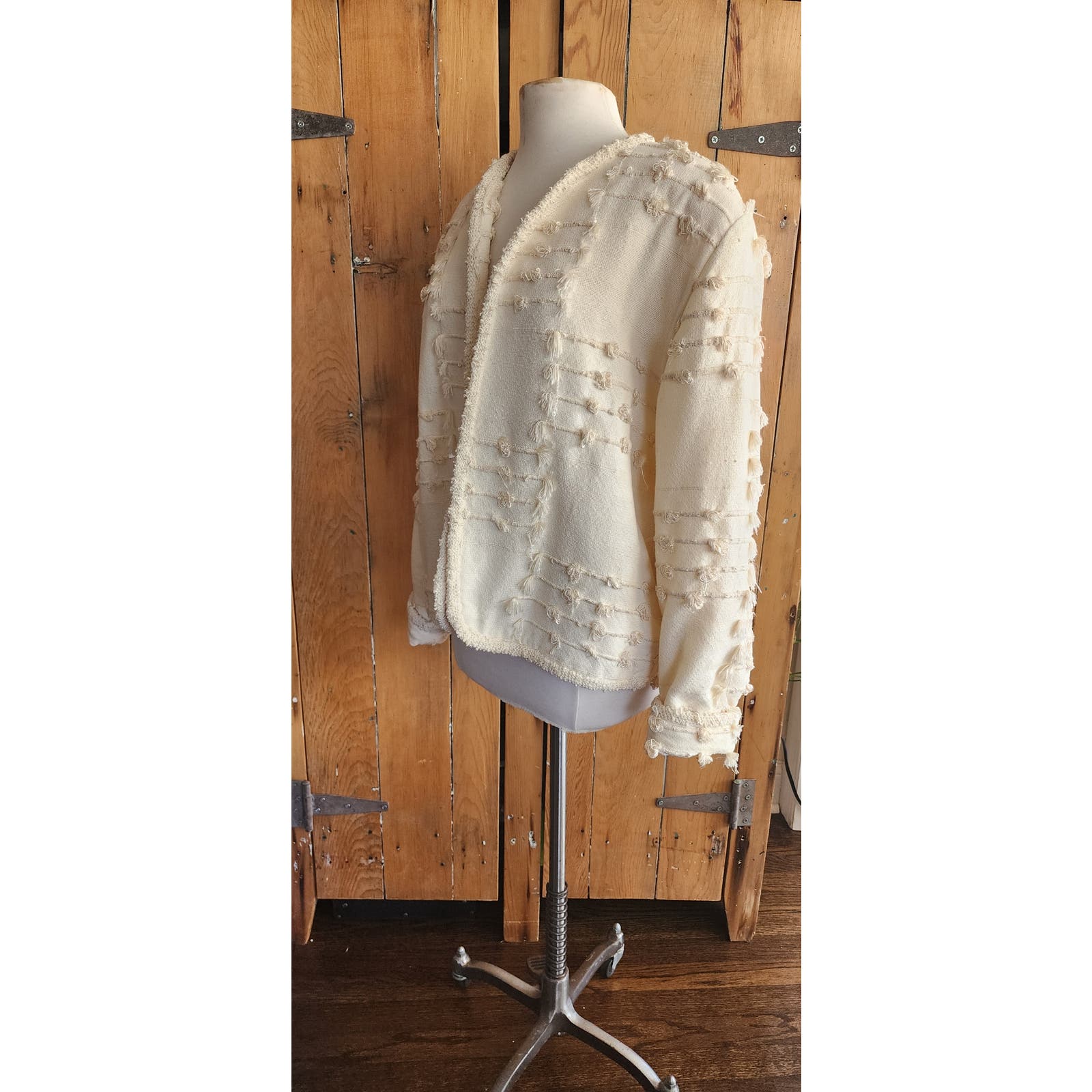 Chunky and boxy, artisinal handwoven jacket, this is a collarless piece with shoulder pads that lies open down the front. Fabric is a creamy, thick, cotton blend with tufts of yarn creating texture at various sections of the embroidered striping. Note the knit trim around the neckline, front opening, hem and cuffs. Slit pockets at each hip front. Fully lined at the interior.