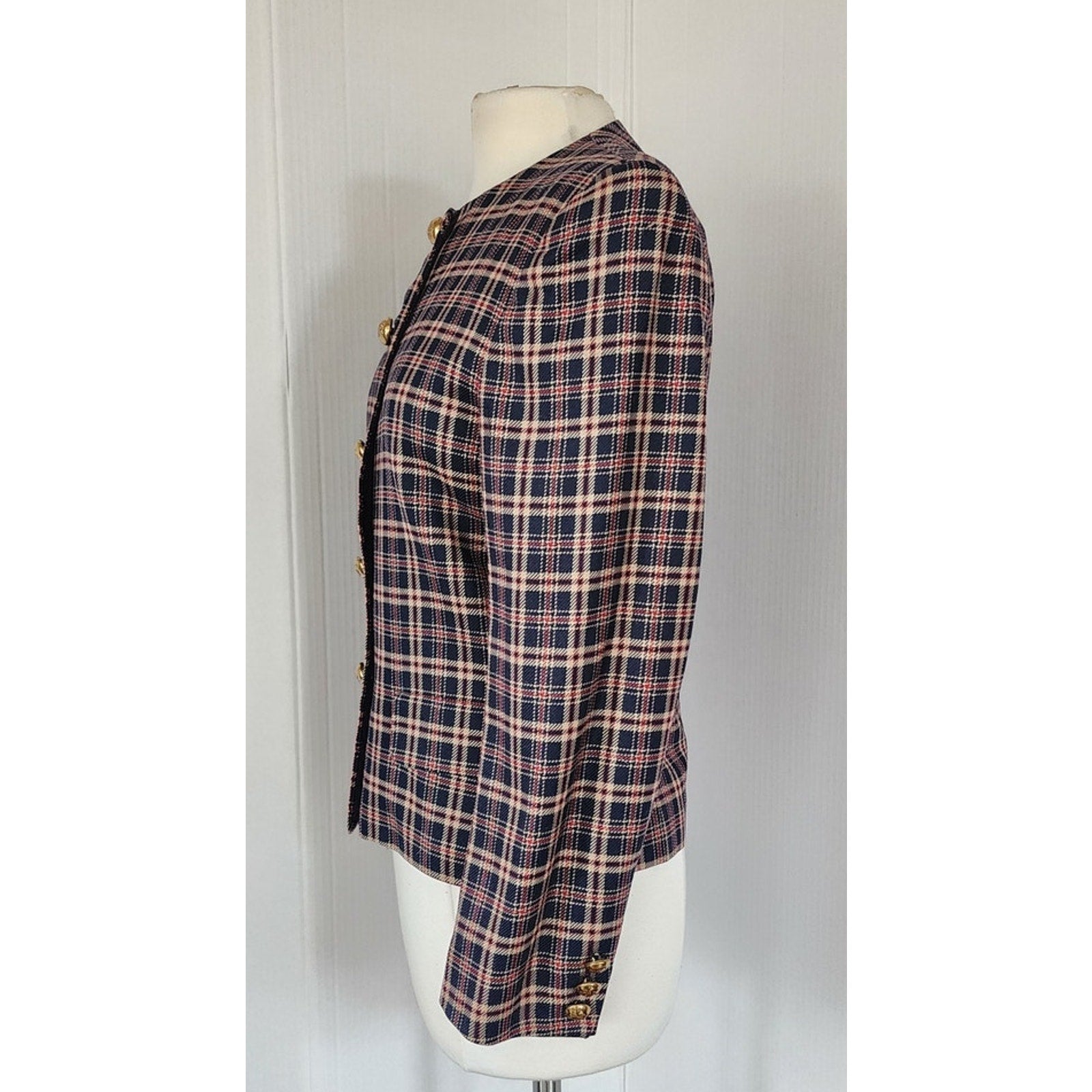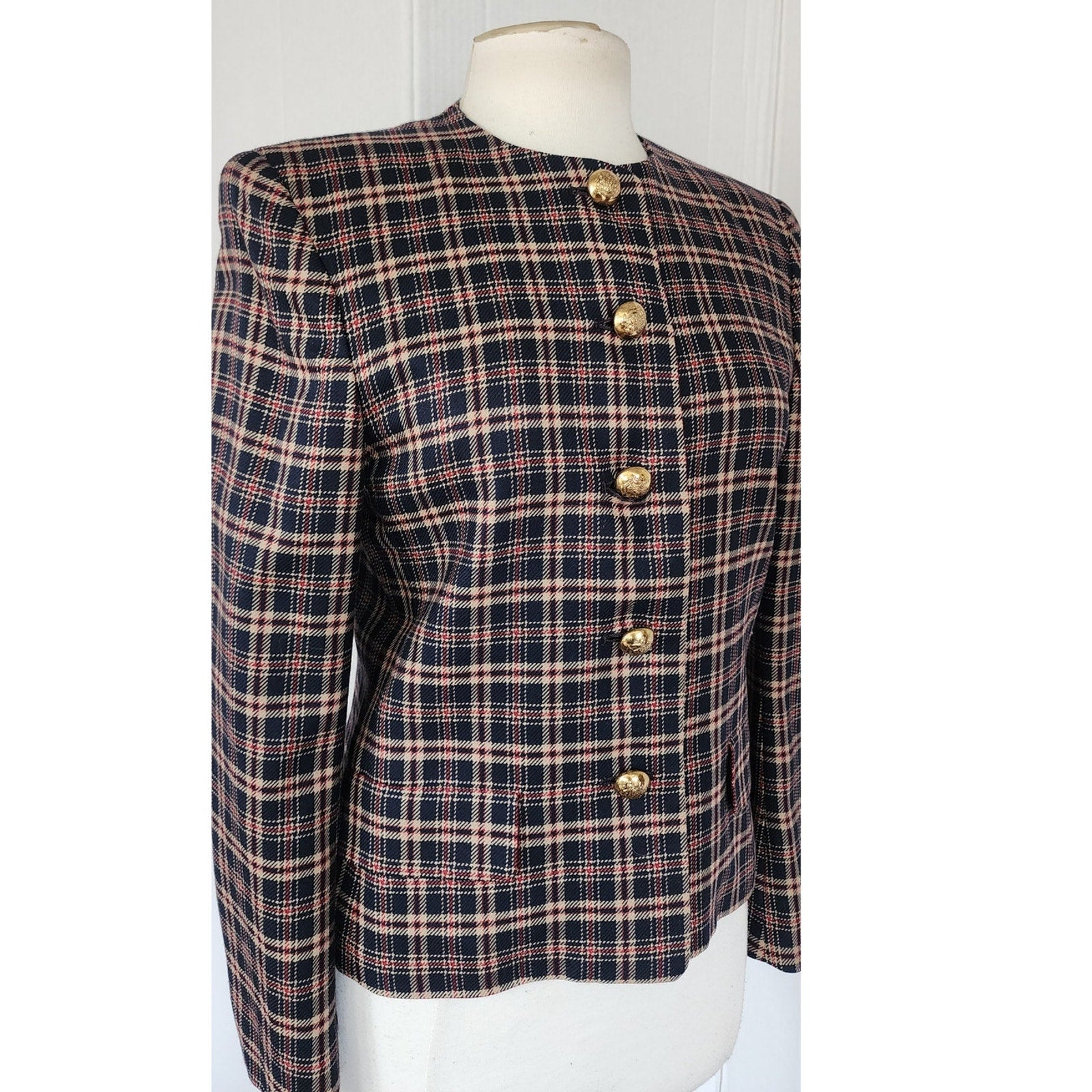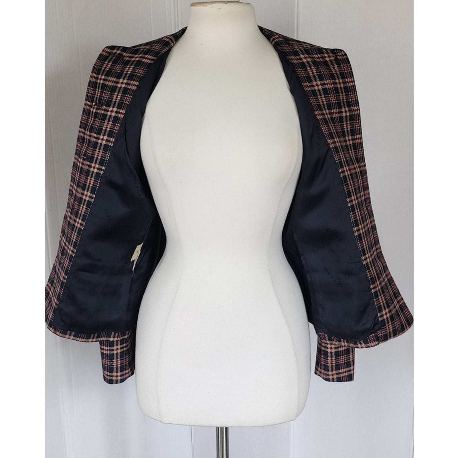 Vintage 80s Jaeger Blazer Navy Blue Brown Plaid Wool Blend