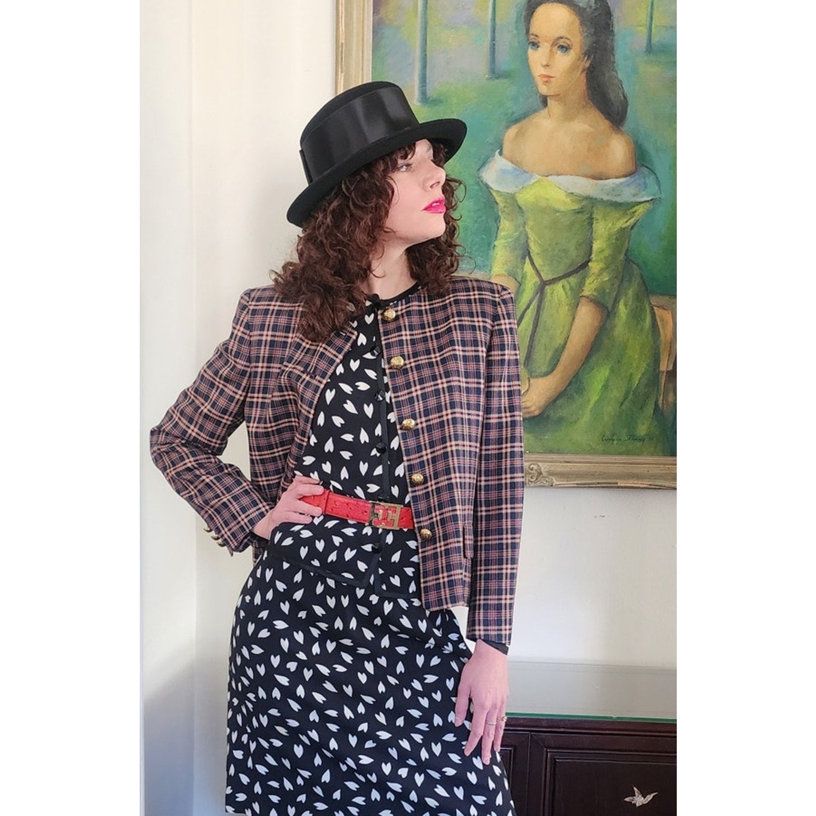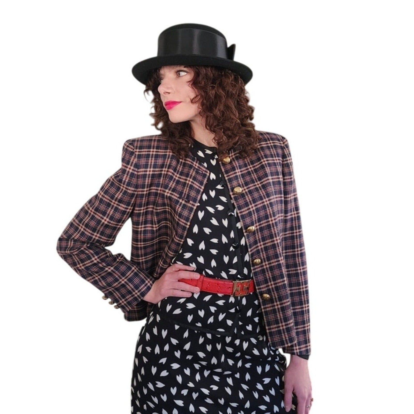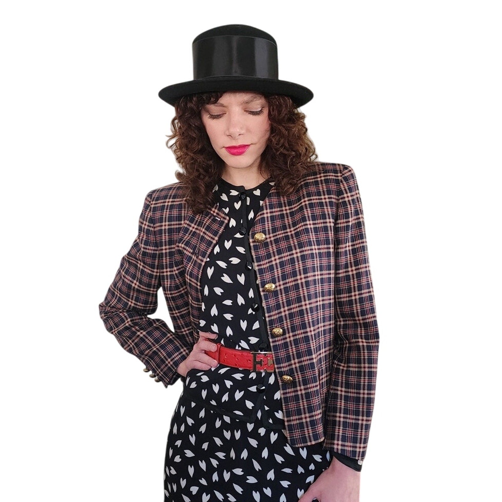 Vintage 80s Jaeger Blazer Navy Blue Brown Plaid Wool Blend