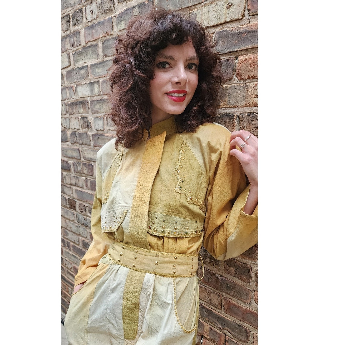 Mandarin collar, padded shoulders, dolman sleeves and curved slit pockets at the hip fronts! Cut out of a yellowish, golden, cream ombre print cotton, it has a matching, sash tie belt to define the elastic seamed waist. Belt, as well as the chest pocket flaps and front torso area have golden trim embroidery and multicolored studs for added bling. Closes with a hidden zipper at front of torso.