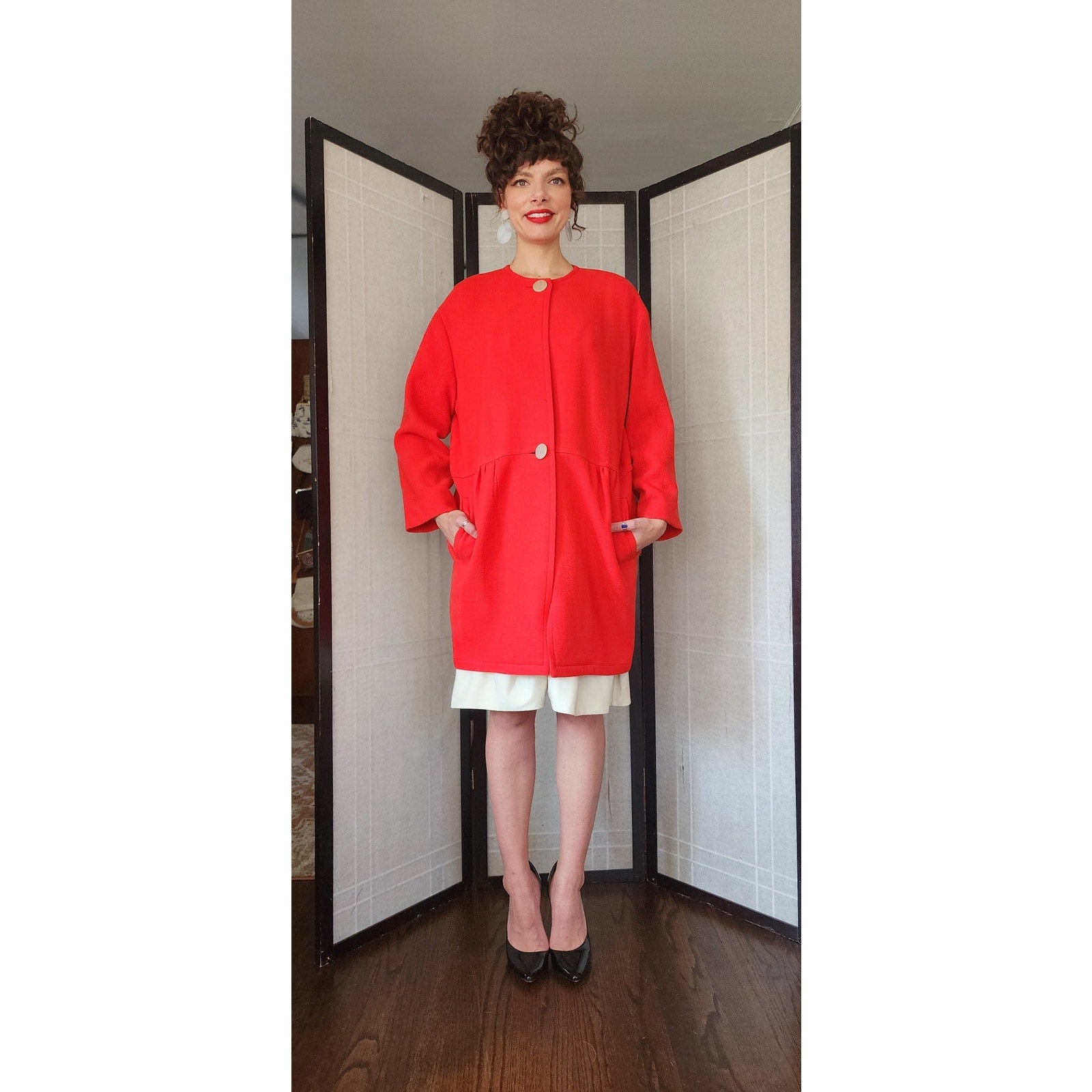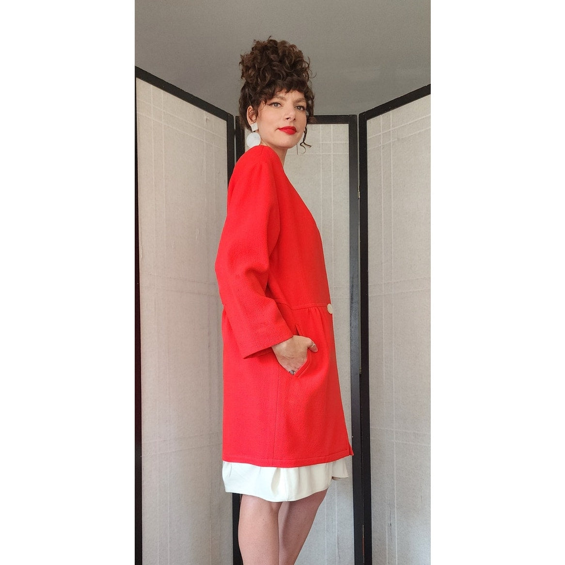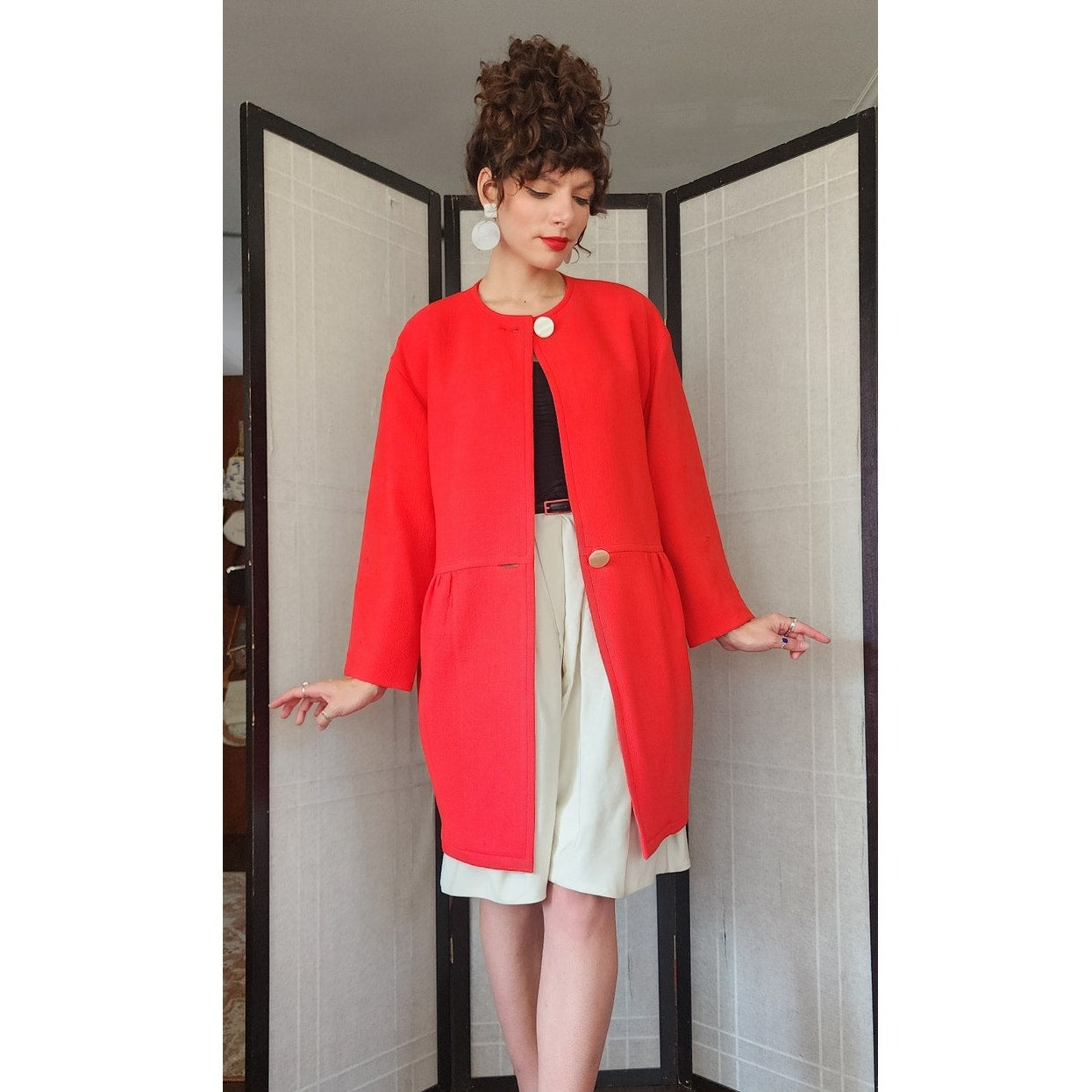 Stunning, collarless coat with a very 60s, mod vibe thanks to its simplicity and loose silhouette. Features shoulder pads and two, large, white buttons at front for closure. There are slit pockets at each hip front. Note the subtle, drop waist seam with gentle pleating at front. Fully lined. A great fall or spring piece to brighten up your look from an iconic, French designer. RARE.