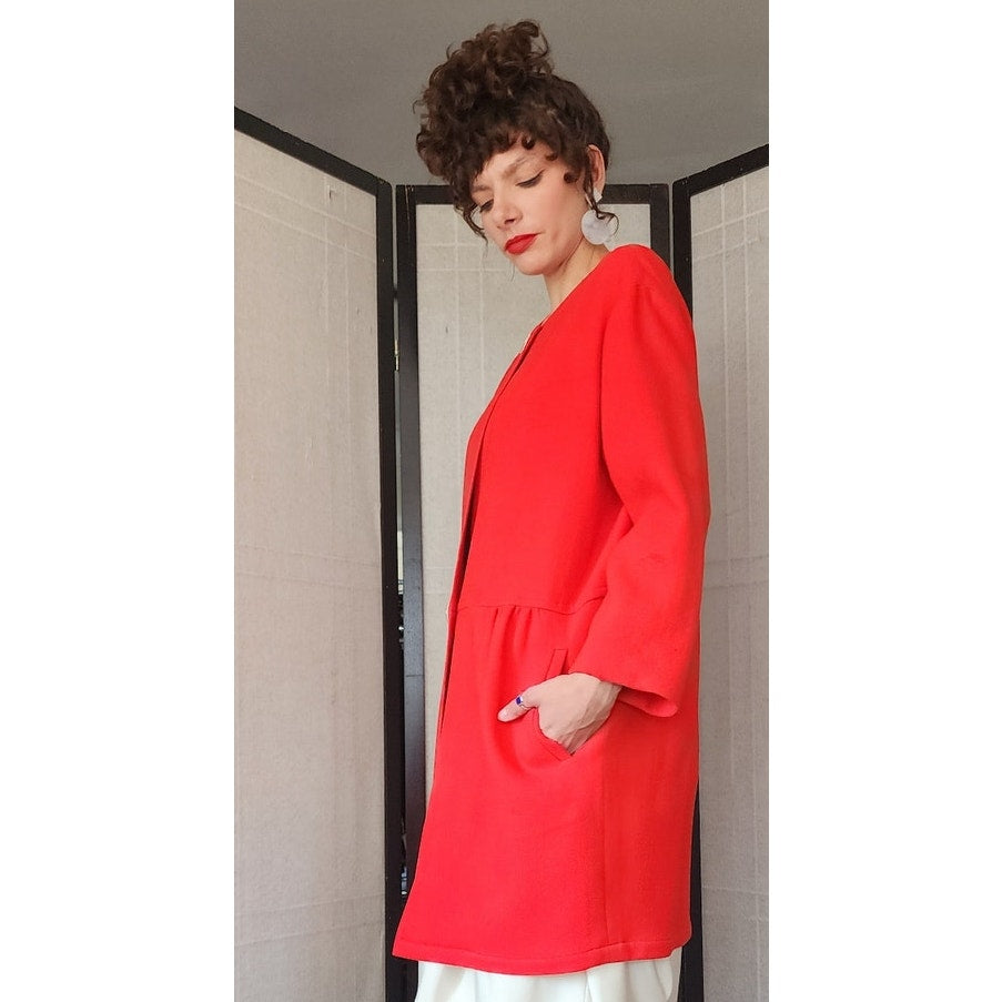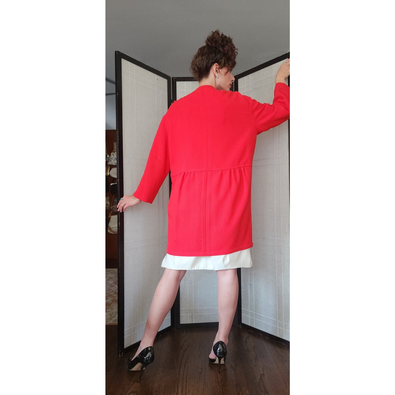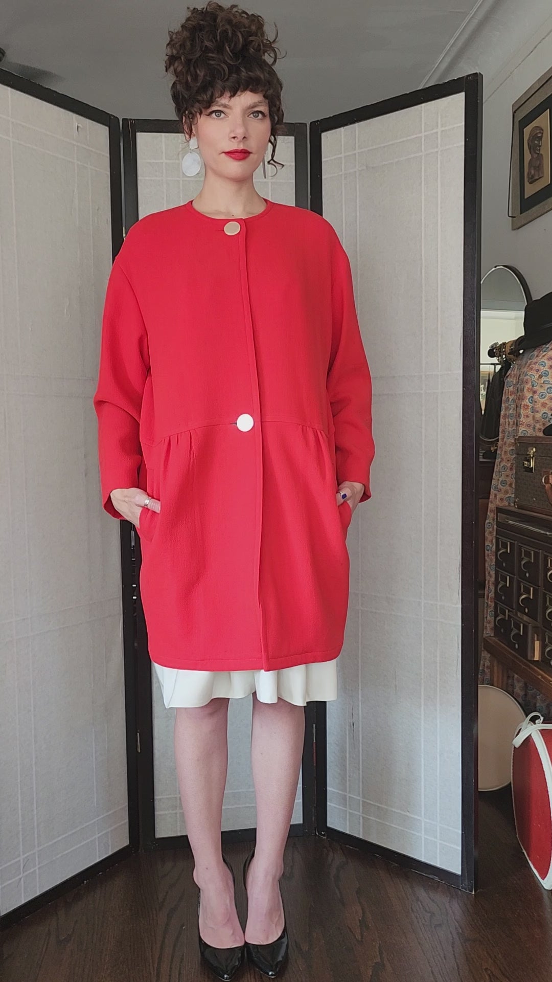 Stunning, collarless coat with a very 60s, mod vibe thanks to its simplicity and loose silhouette. Features shoulder pads and two, large, white buttons at front for closure. There are slit pockets at each hip front. Note the subtle, drop waist seam with gentle pleating at front. Fully lined. A great fall or spring piece to brighten up your look from an iconic, French designer. RARE.