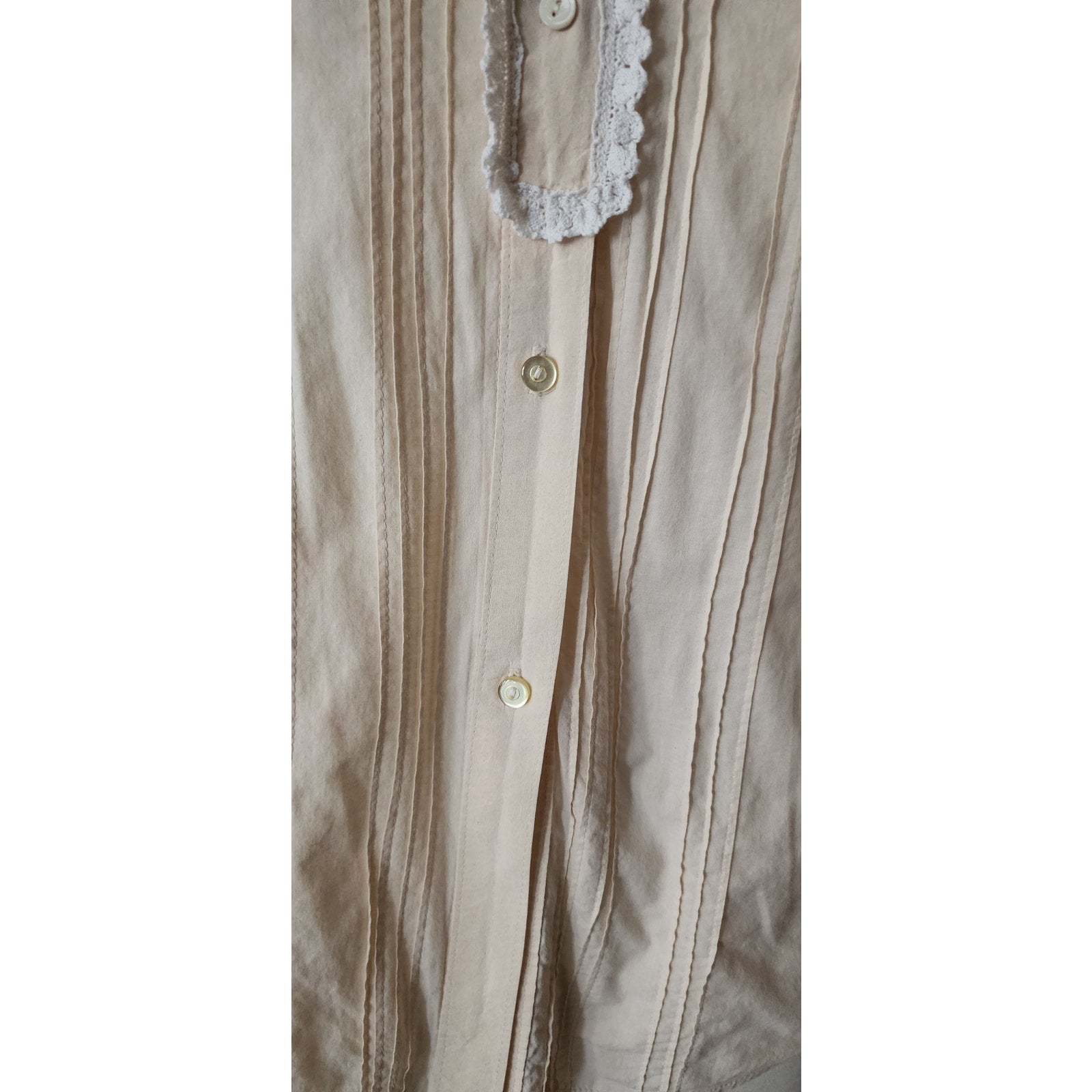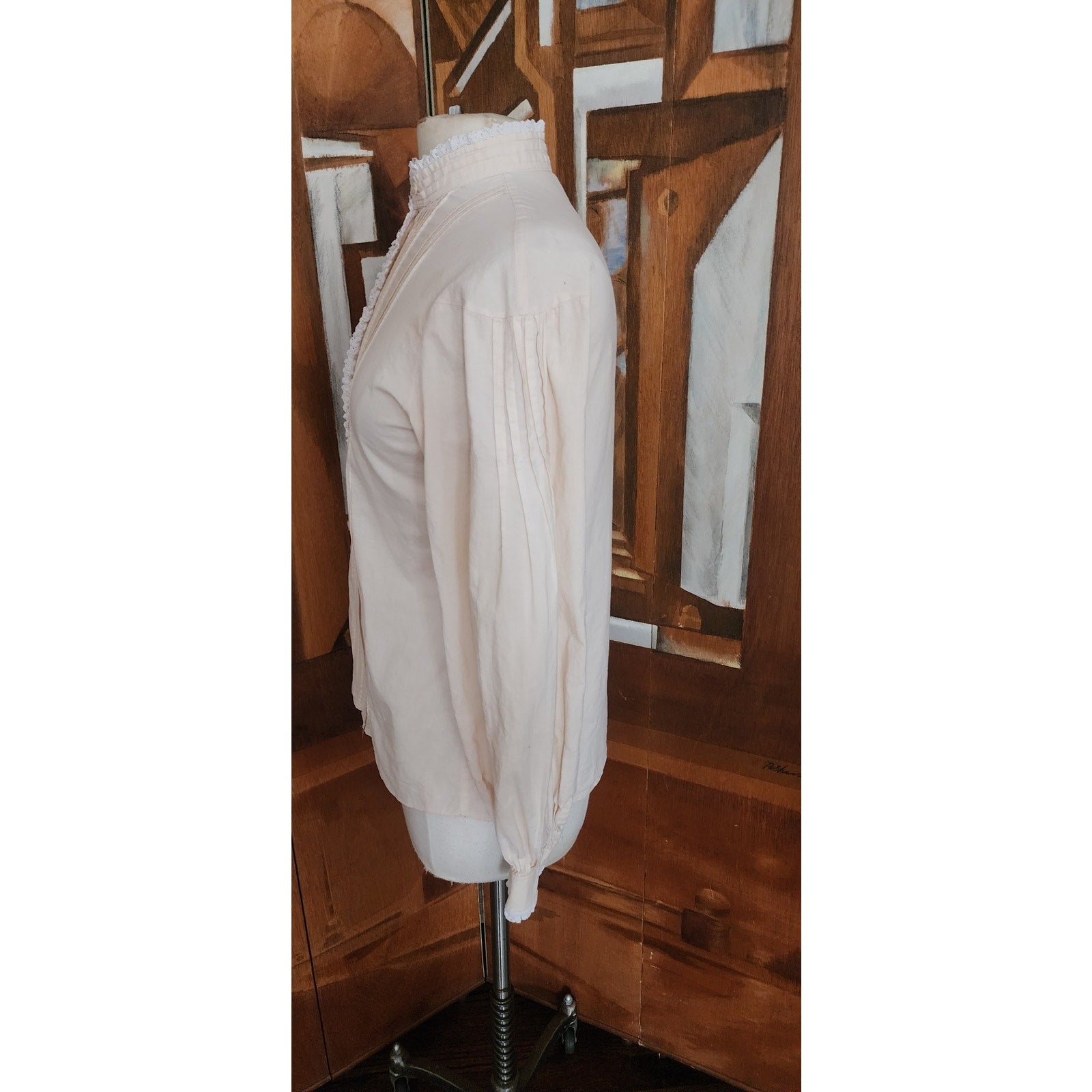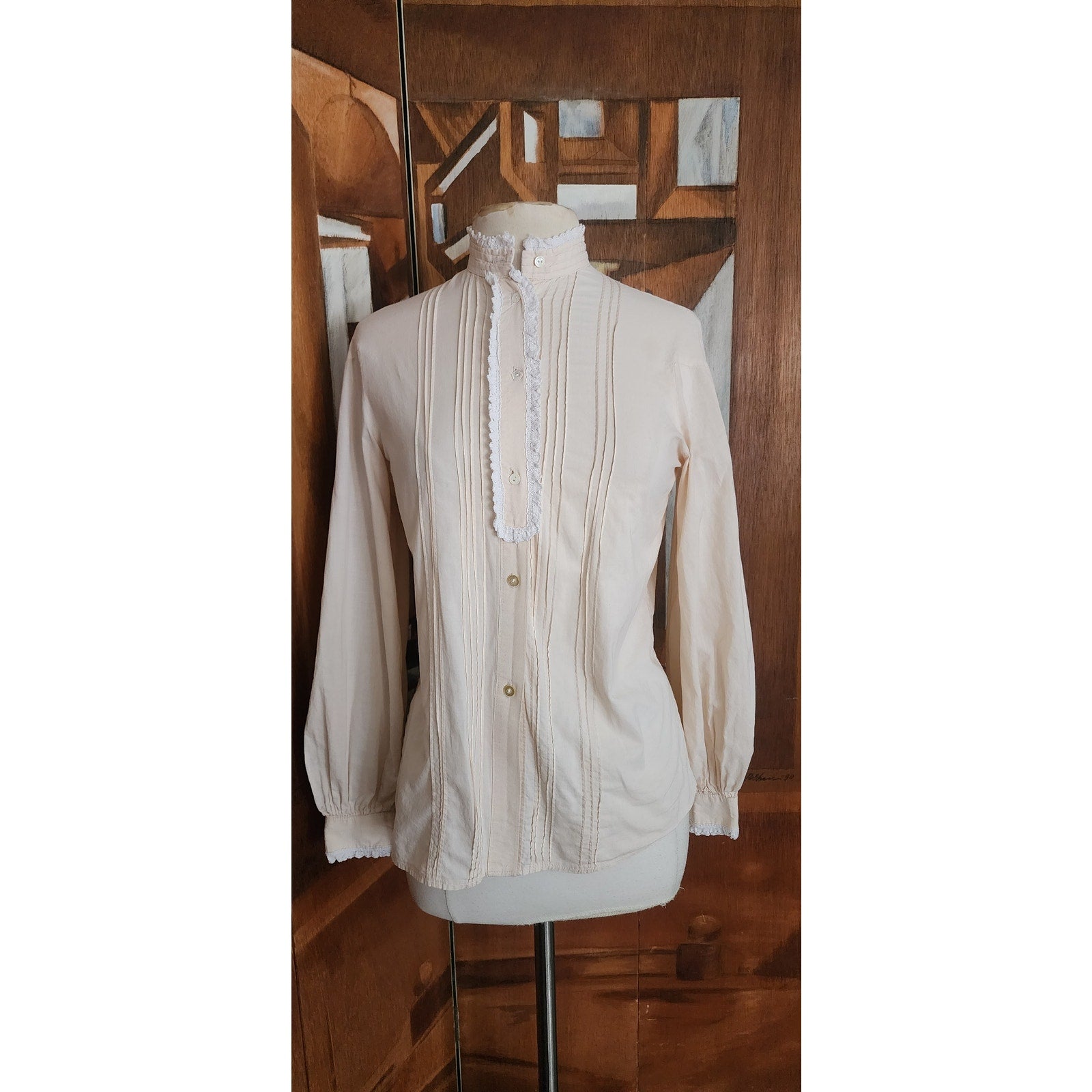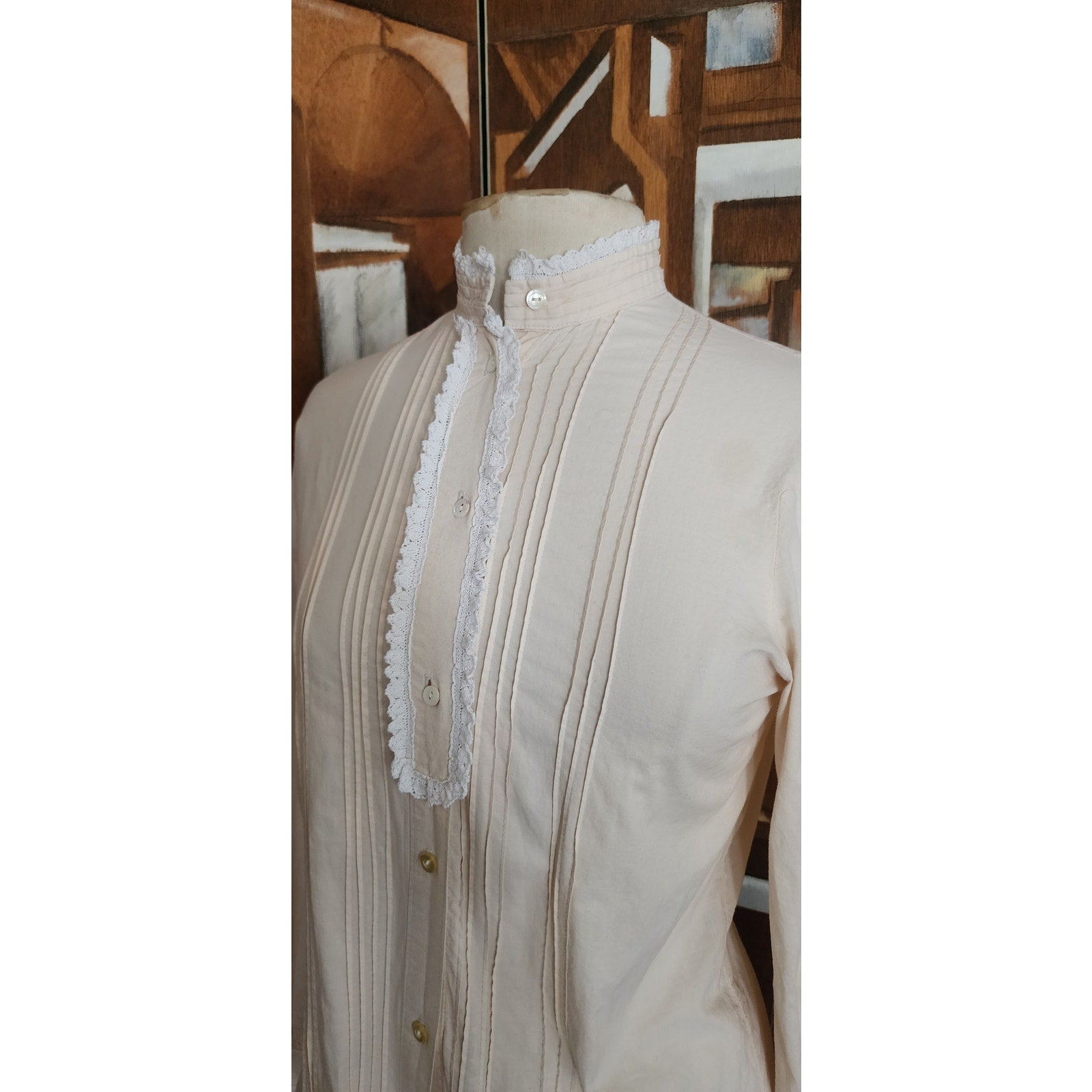 Blouse in a light cream or ivory hue features distinct Victorian and Edwardian design elements, likely dating from the 1970s or 1980s. It is constructed from 100% cotton fabric. The shirt has a high, stand-up "pie-crust" collar finished with a delicate white ruffled edge. The front features vertical pintuck pleats running down both sides of the central button placket, which fastens with small buttons from the neck to the hem. The long sleeves are slightly puffed at the shoulders, have pintuck pleats at the outer arm, and gather into buttoned cuffs that also have the same ruffled trim.