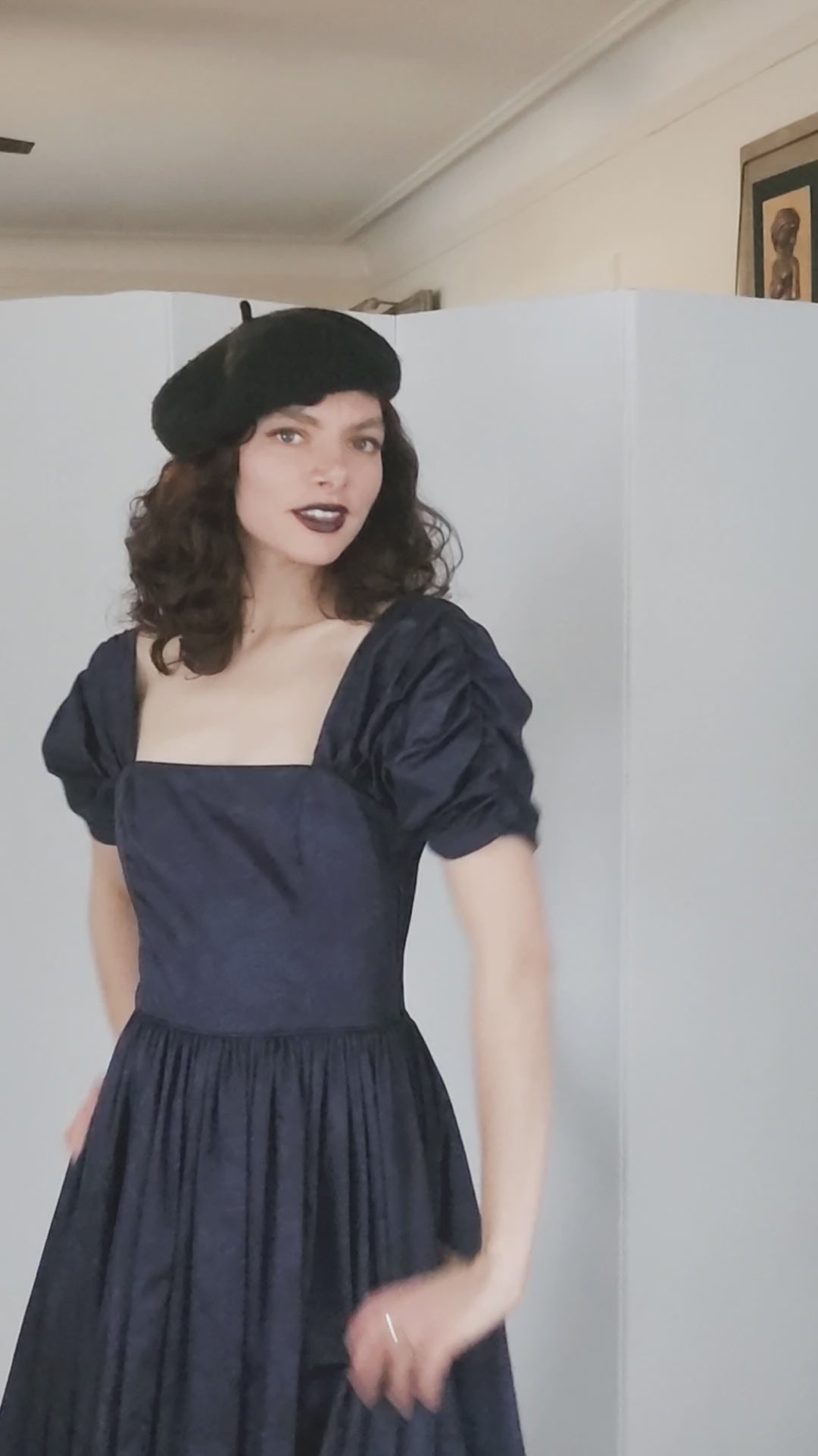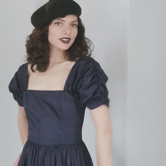 Dramatic and classic dress with ruched, short and puffed sleeves that can be worn above or below the shoulders as fits your mood and the occasion. Cut out of a dark, midnight blue, damask print cotton with a hint of dark floral print, it has a low, straight neckline with a fitted bodice structured with interior boning, a nipped waist, and a full, pleated skirt ending at the ankles. Zips up the side and has buttons down the upper back for closure. Lined at the torso