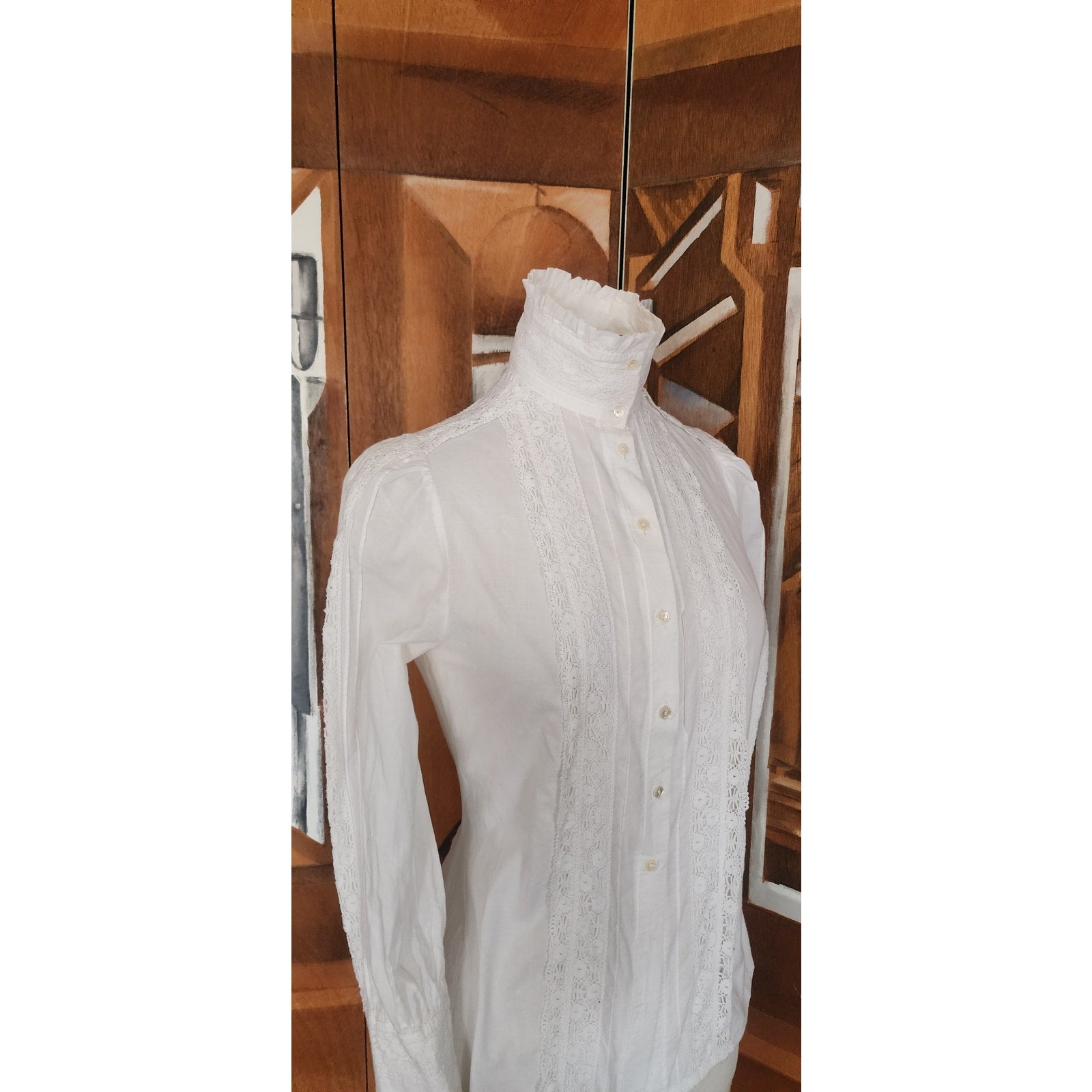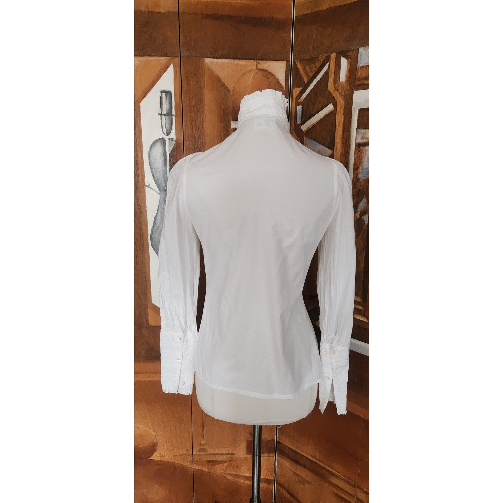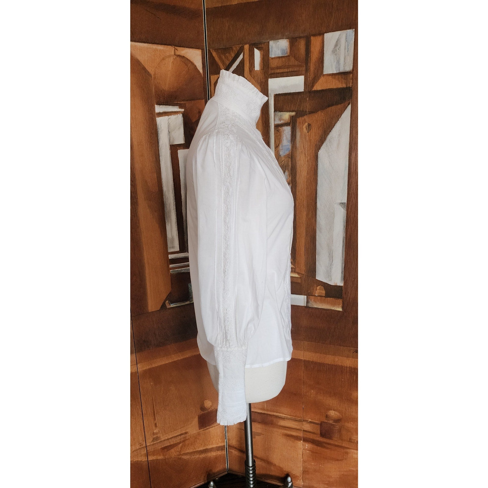 Gorgeous, Neo-Edwardian long sleeved shirt with high neckline featuring ruffled edge and crochet lace trim. Same lace found along the shoulders, length of the sleeve, the wide sleeve cuffs, and in wider panels at either side of the buttons. Slightly puffed shoulders complete the look.